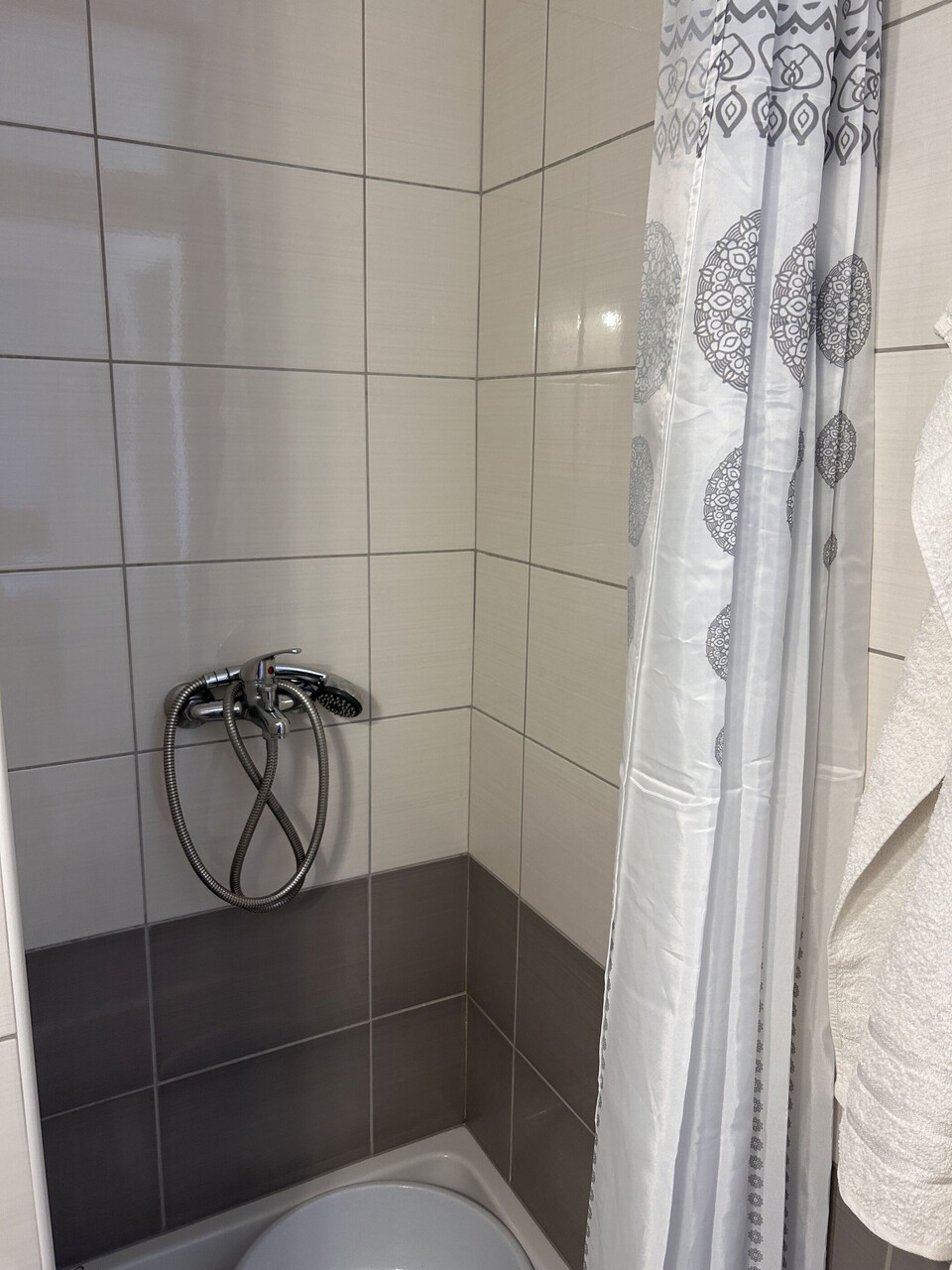 • Dusche, Duschkabine, Waschmaschine, Handtücher.