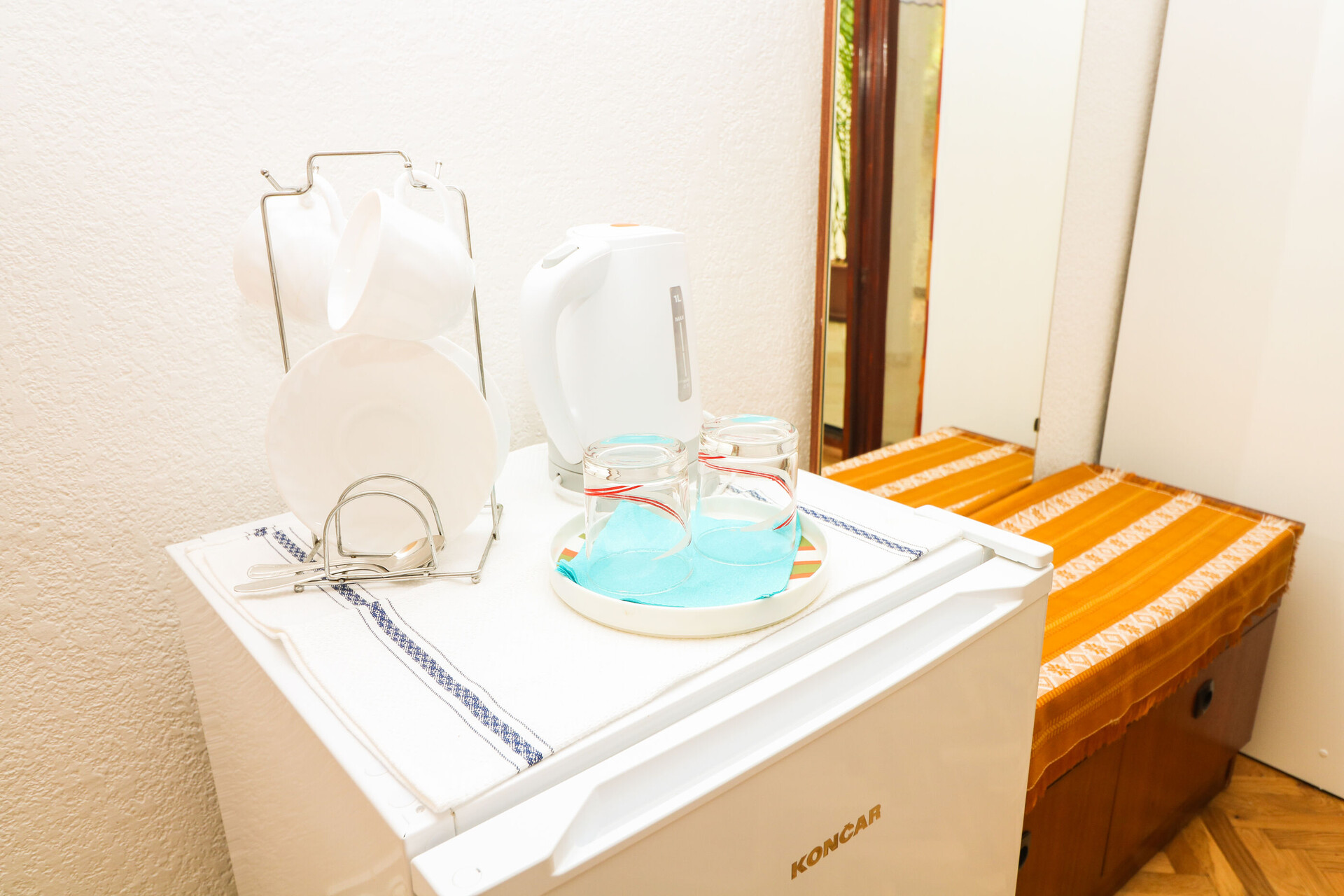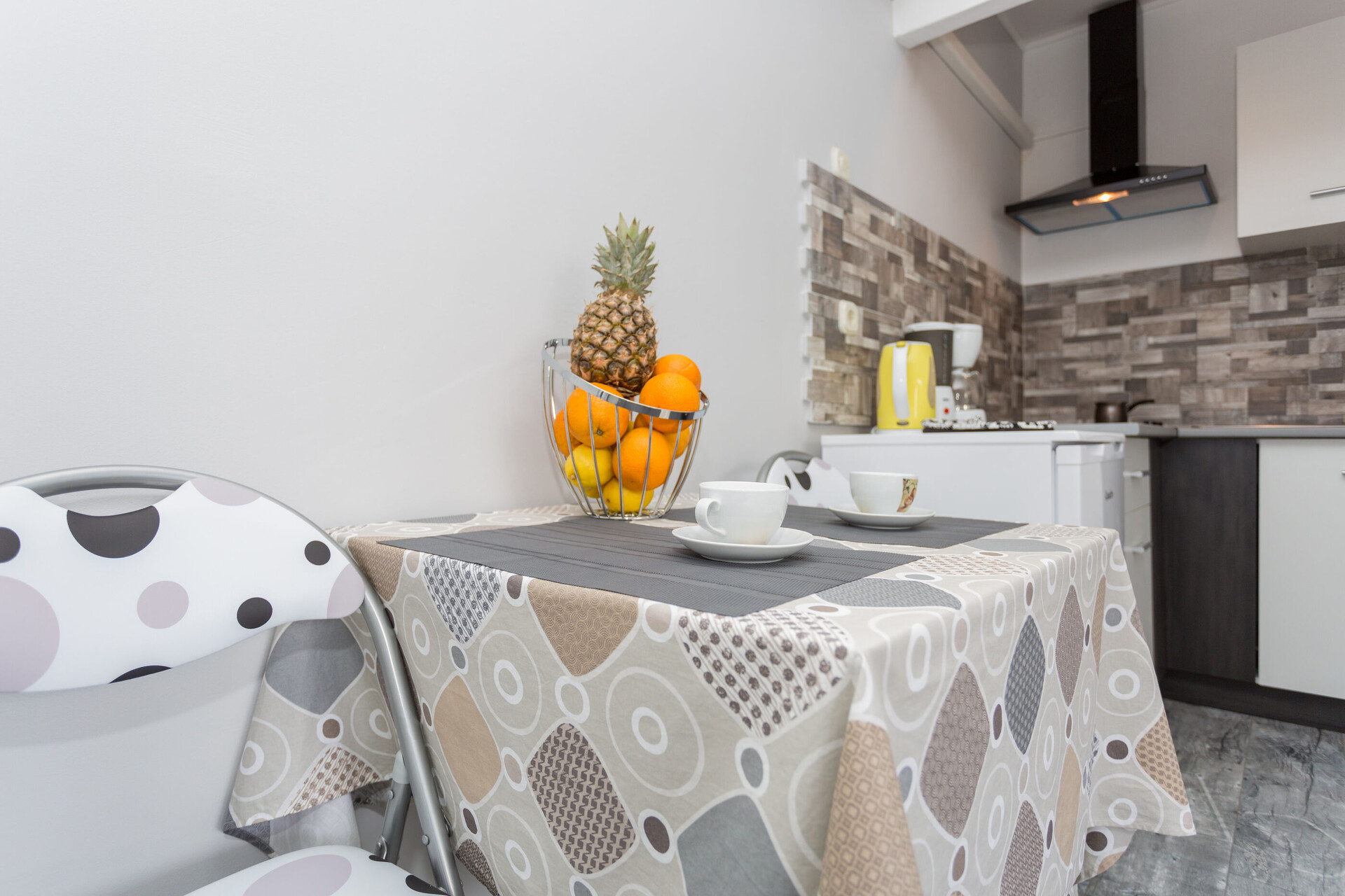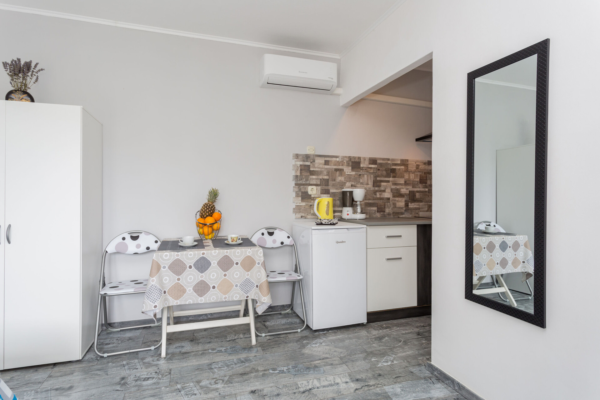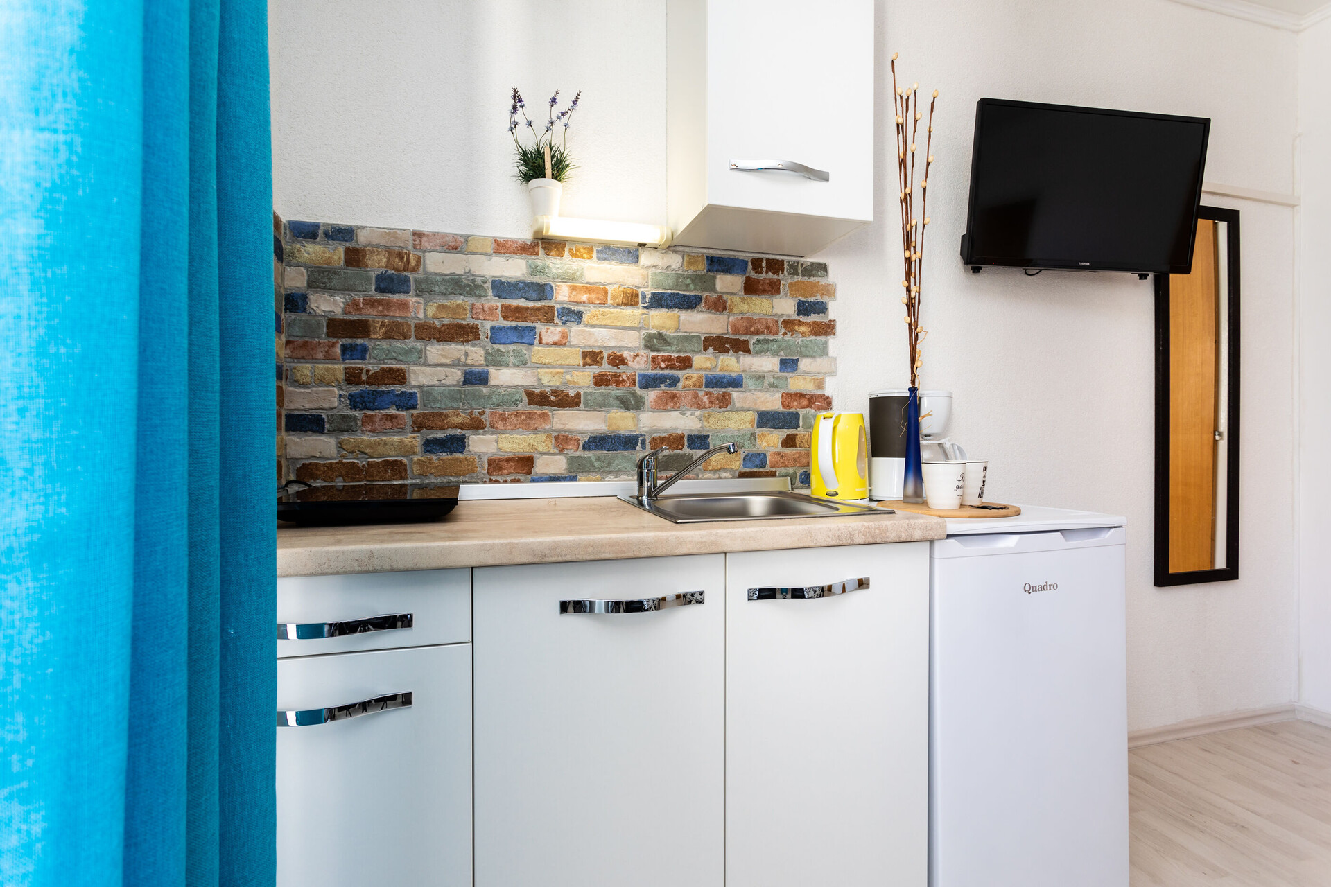 • Tisch und Stühle, Waschbecken, Kühlschrank, Wasserkocher, Filterkaffee-Aparat, Herd Kochfeld.