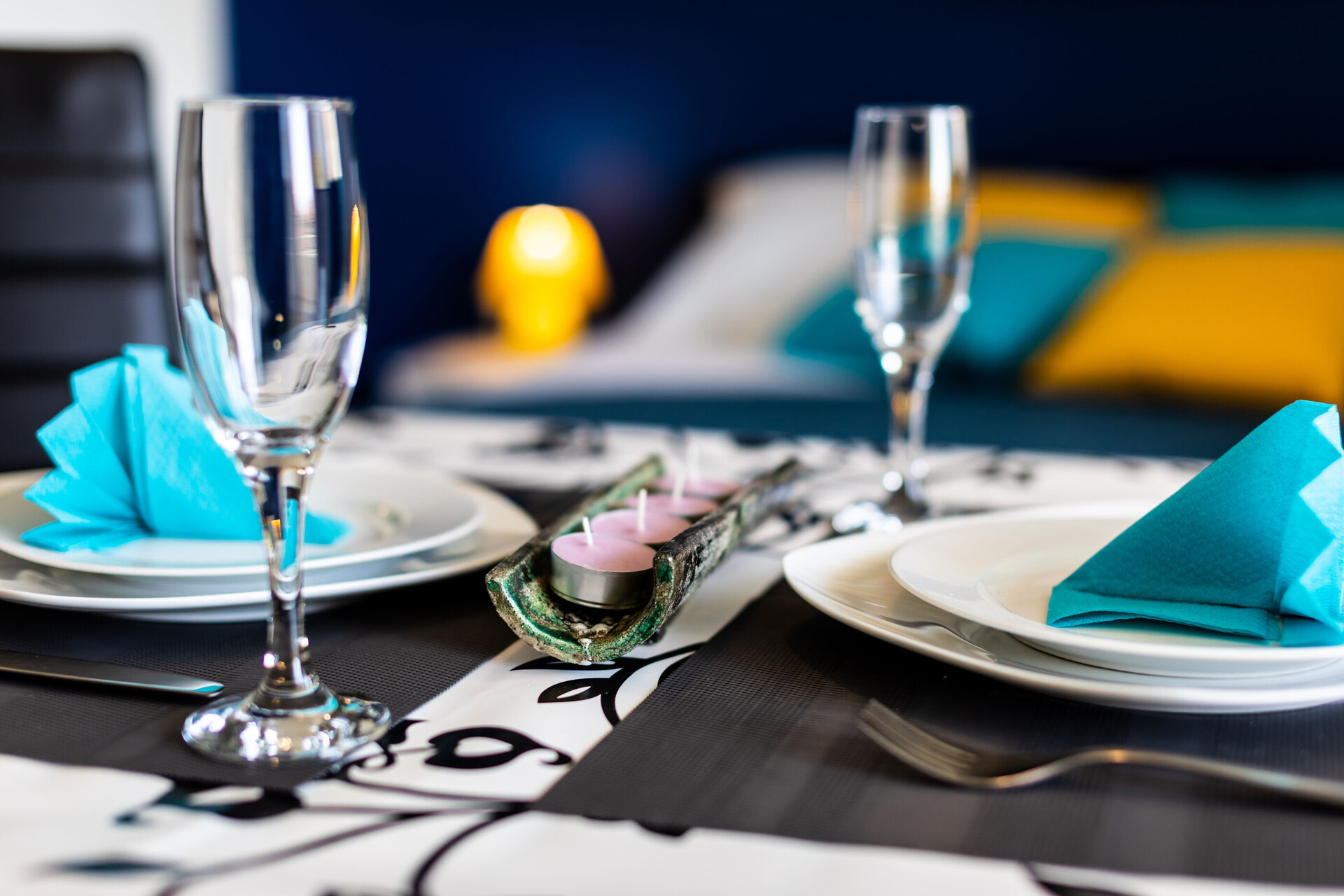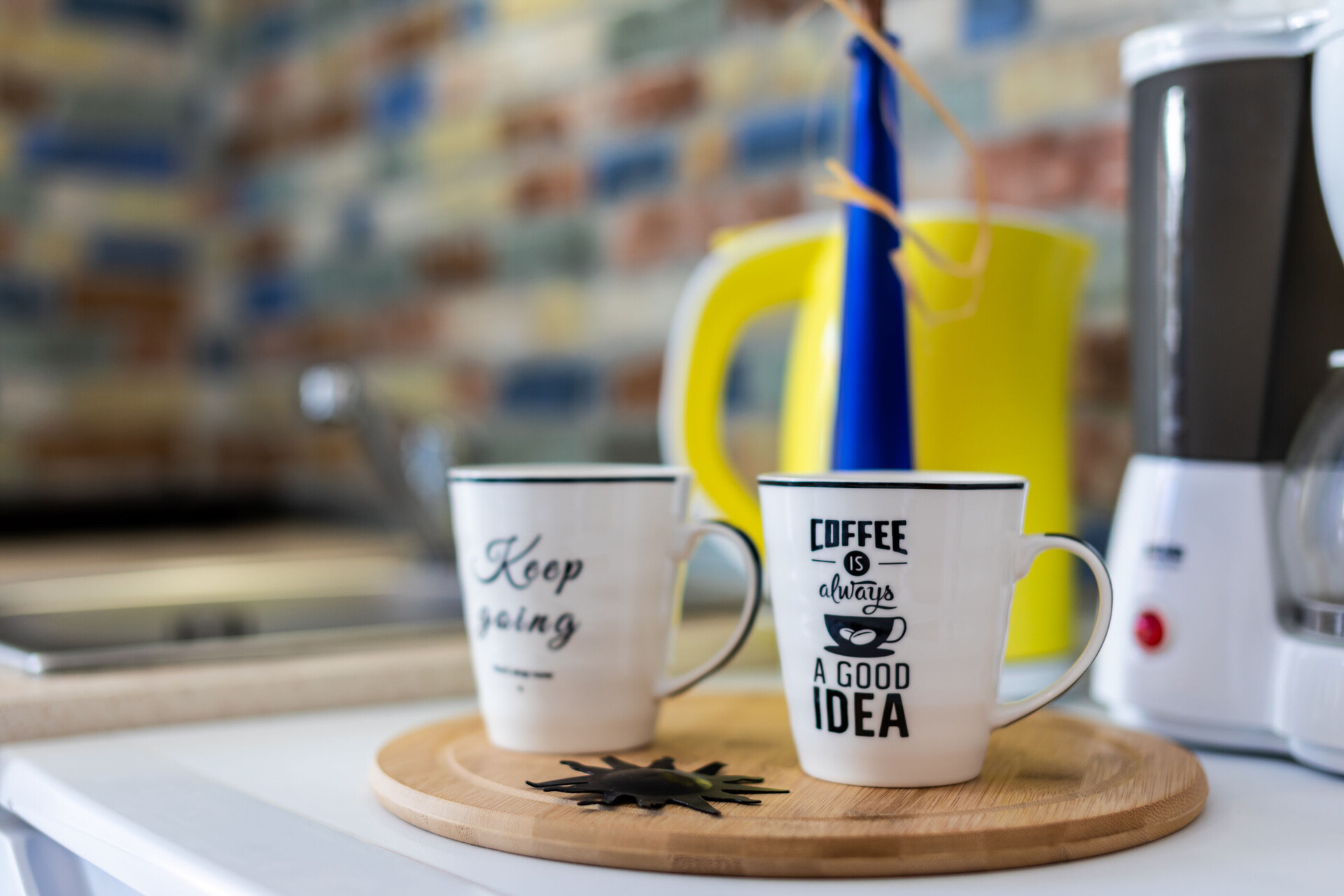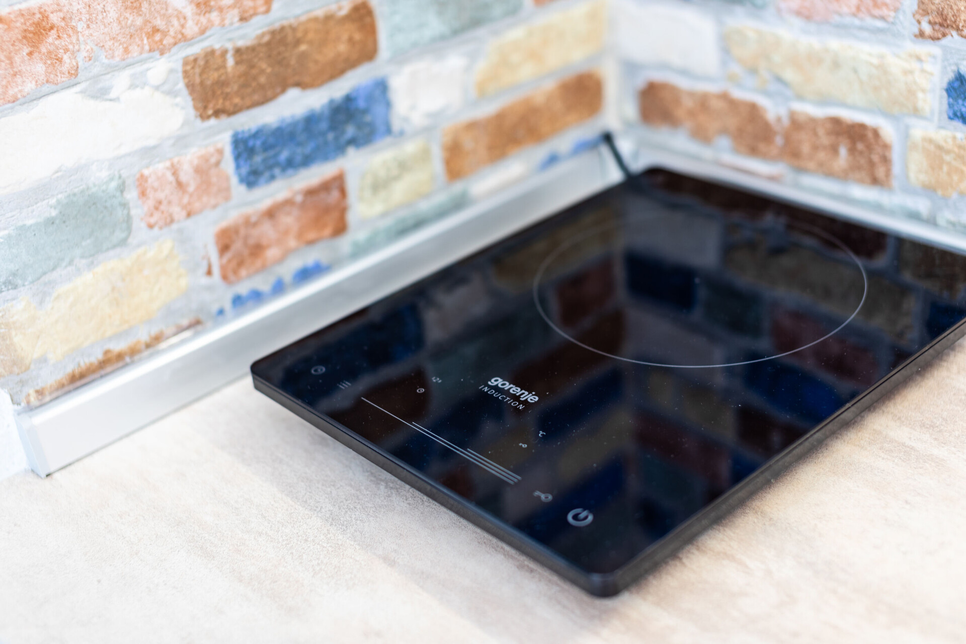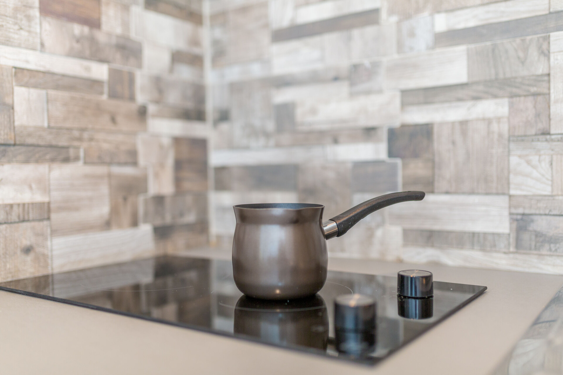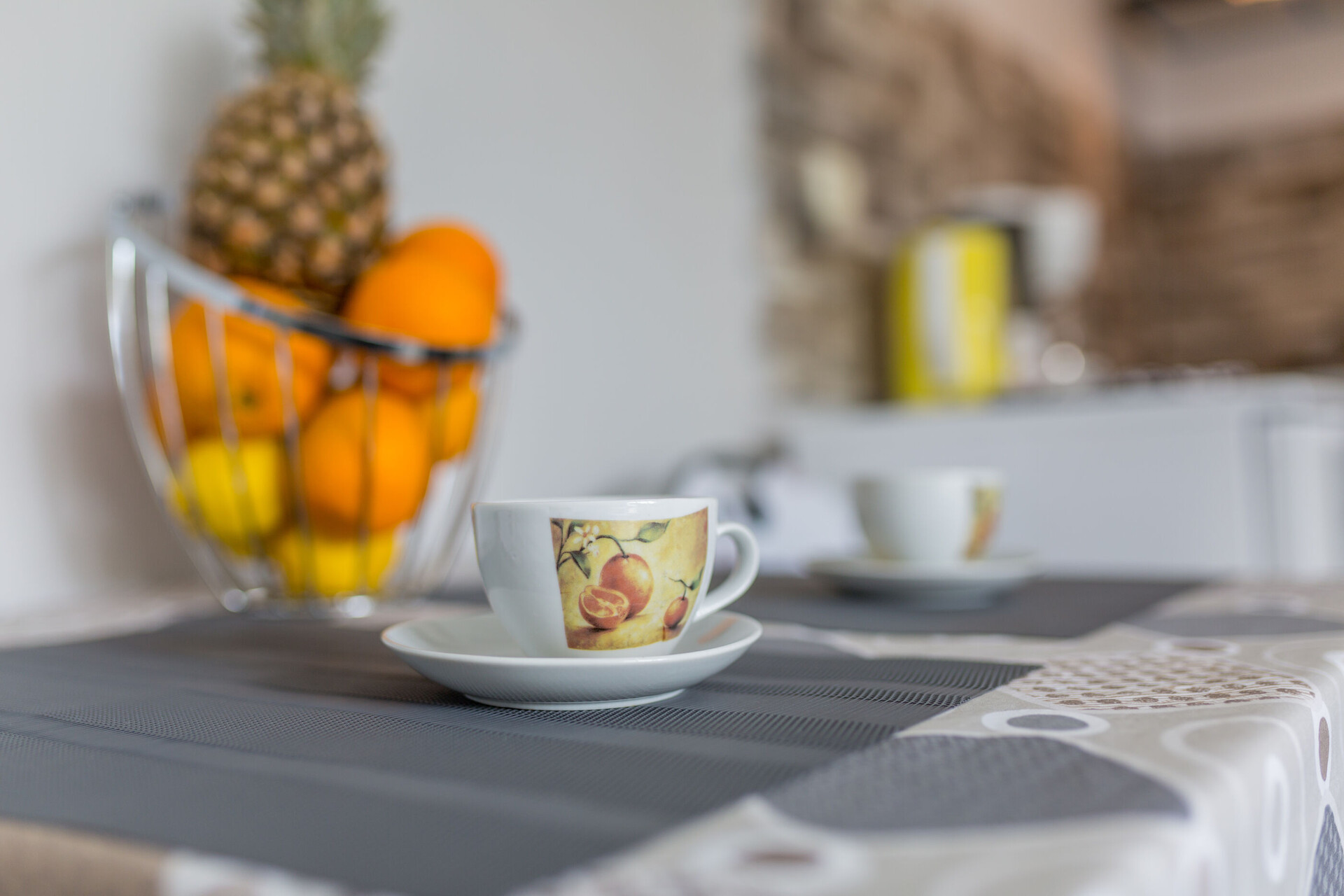 • Tisch und Stühle, Waschbecken, Kühlschrank, Wasserkocher, Filterkaffee-Aparat, Herd Kochfeld.