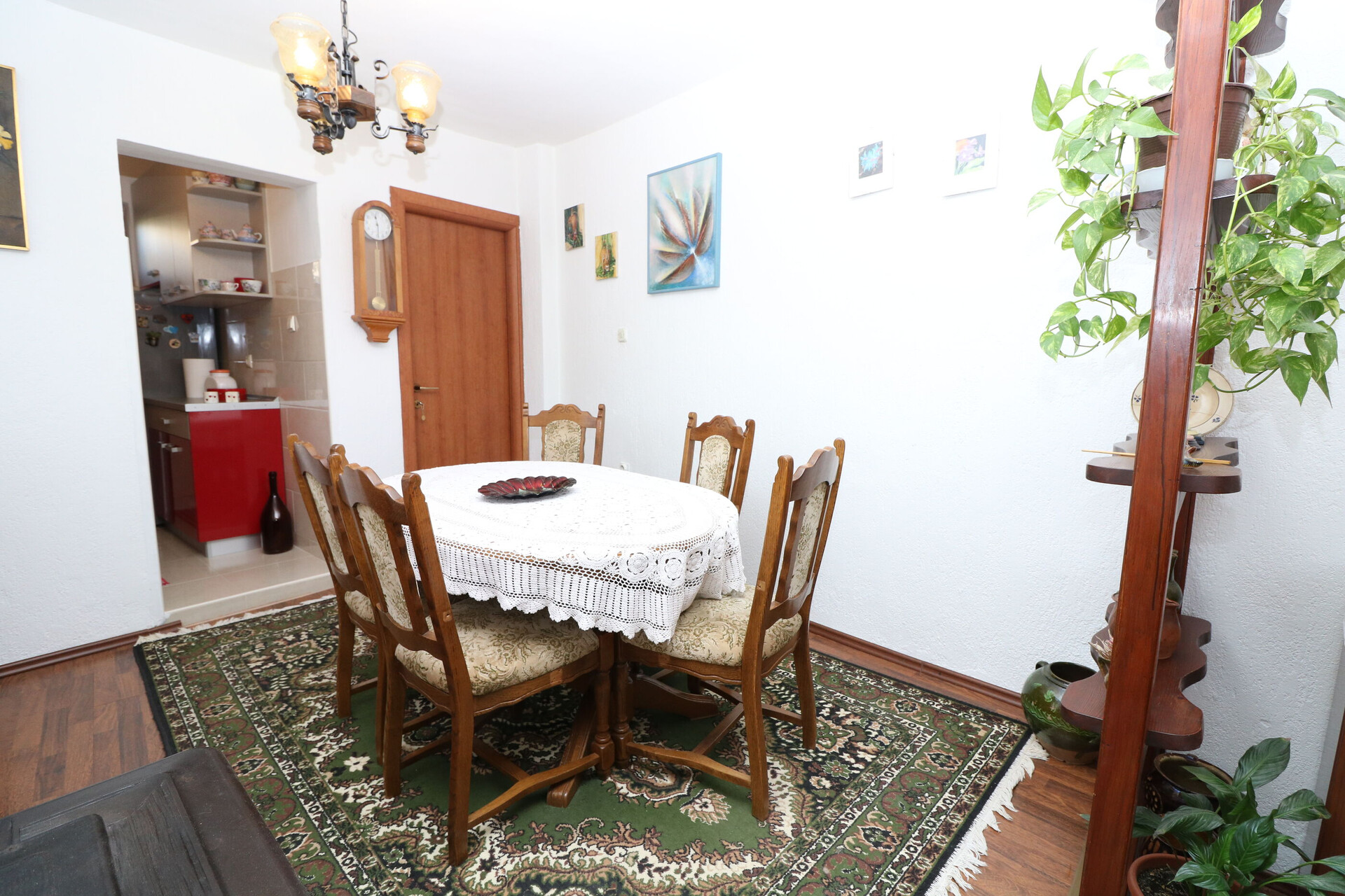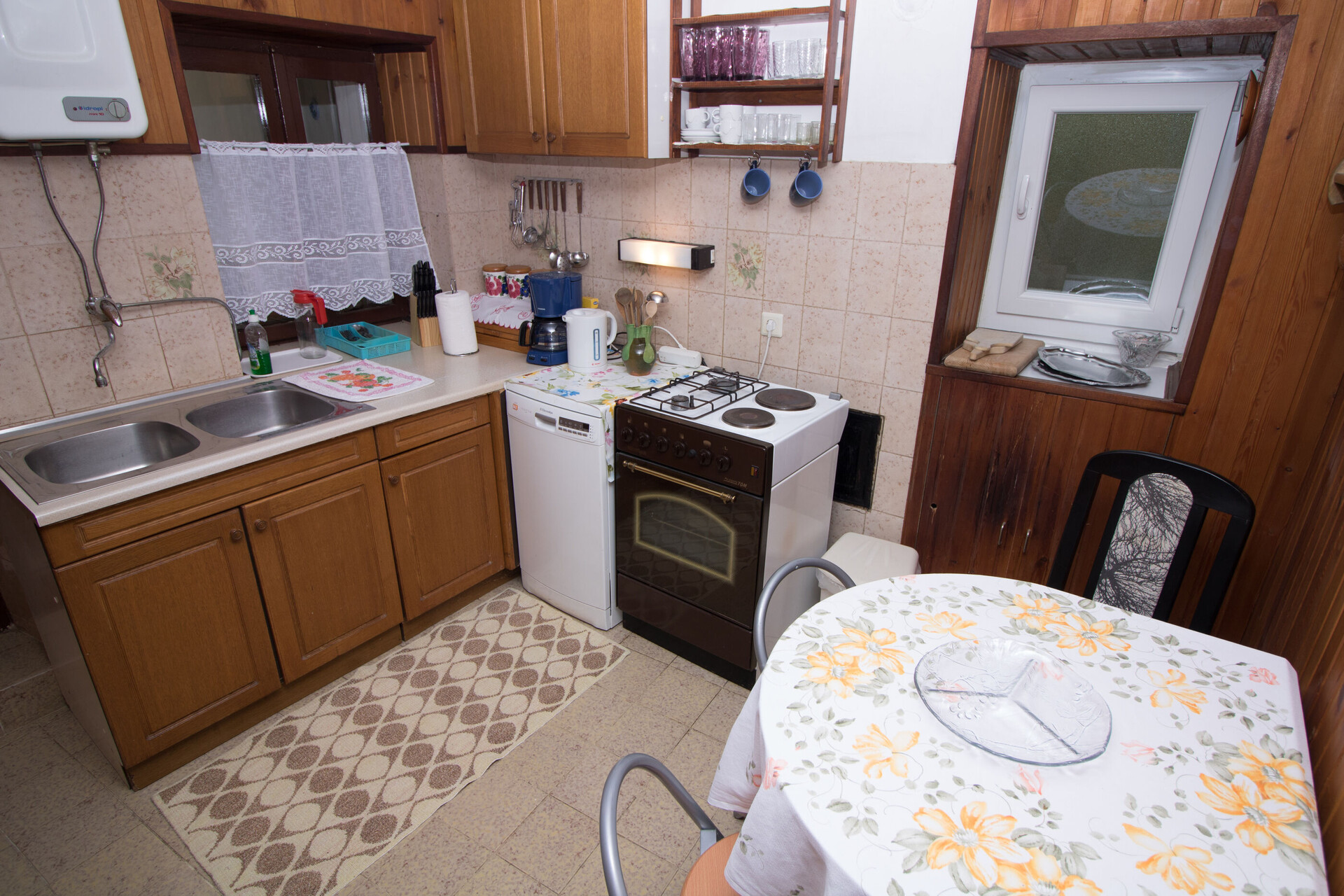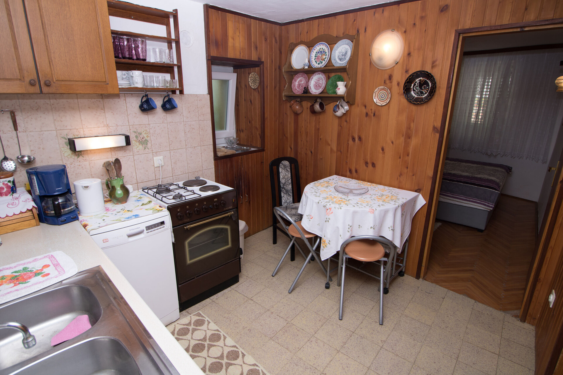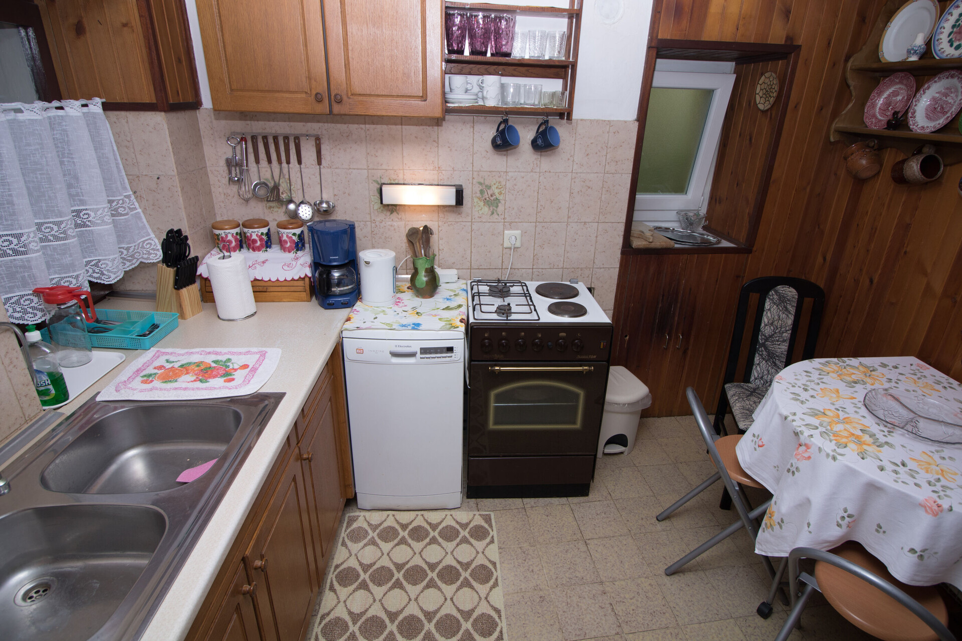 • Tisch und Stühle, Waschbecken, Ofen, Kühlschrank, Wasserkocher, Filterkaffee-Aparat, Geschirrspülmaschine, Bügeleisen, Herd Kochfeld.