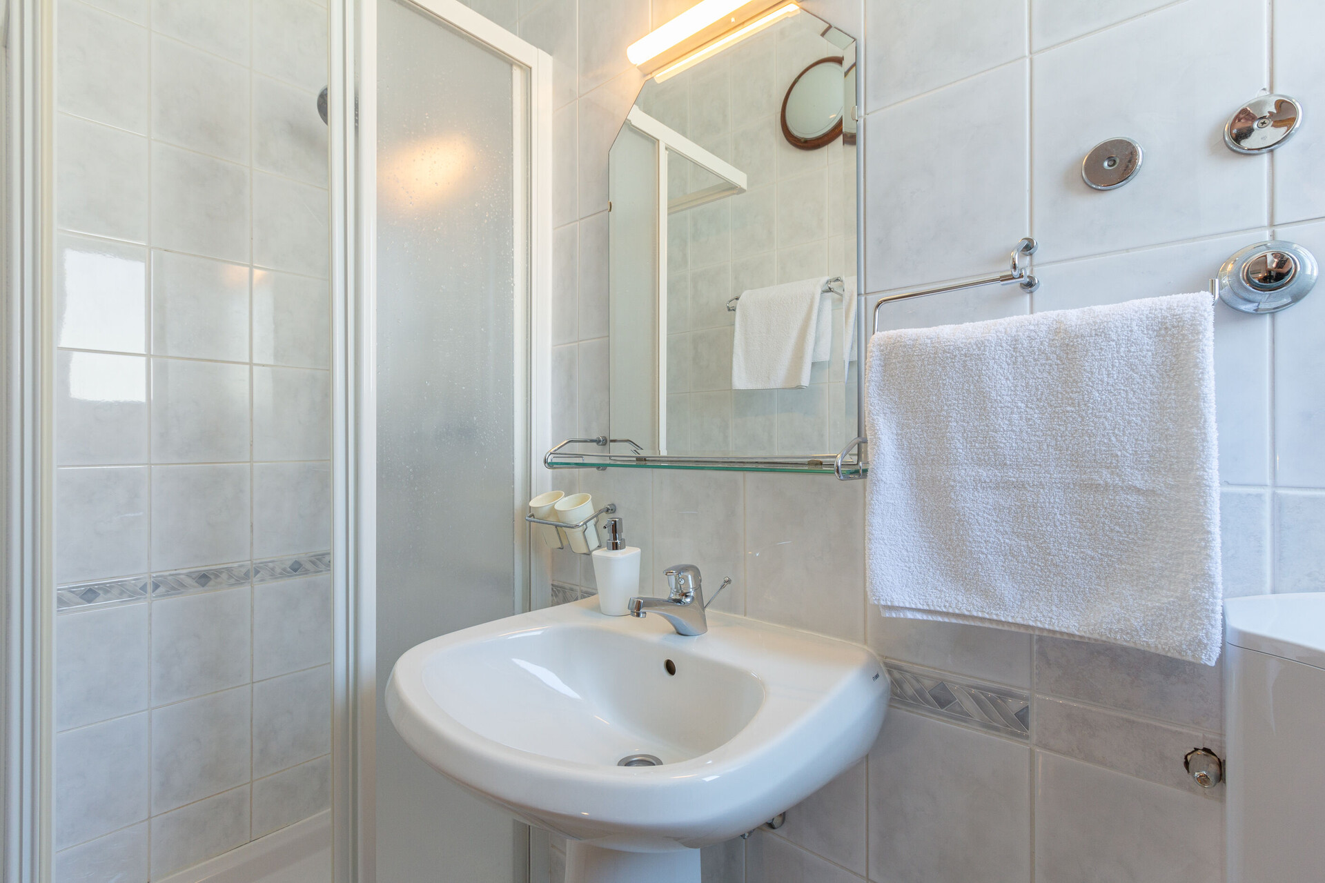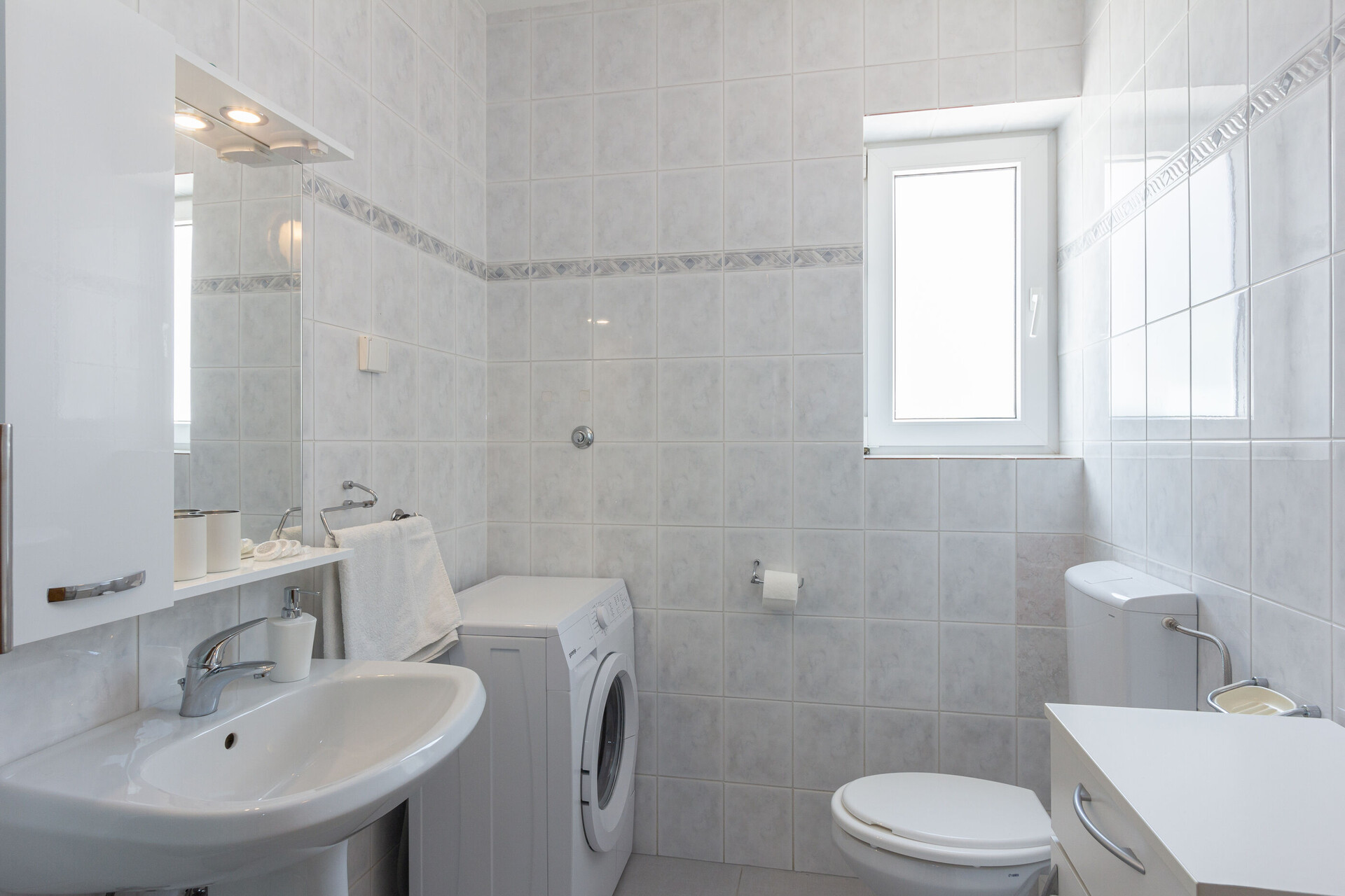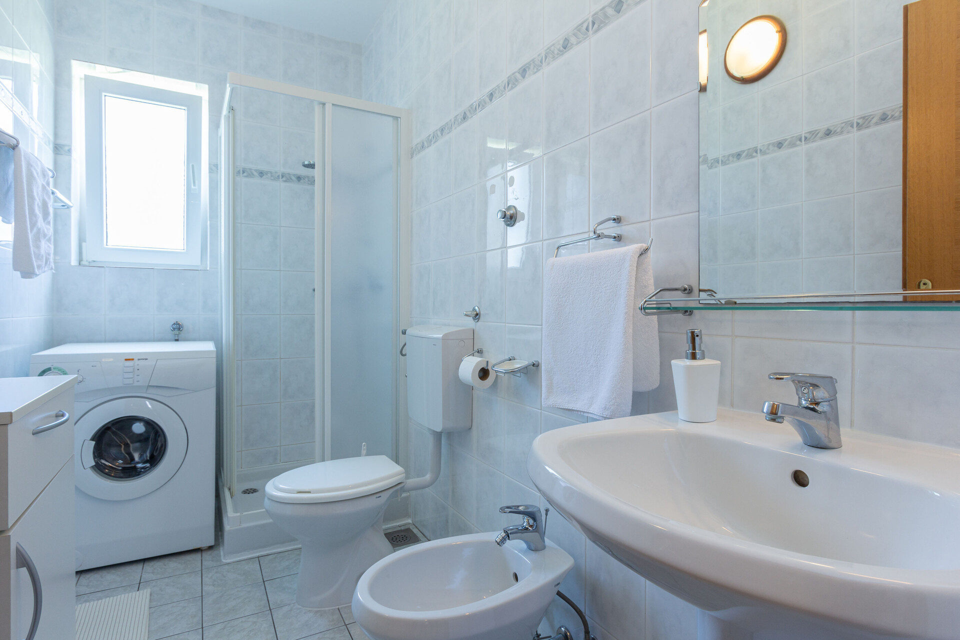 • Dusche, Duschkabine, Waschmaschine, Handtücher.