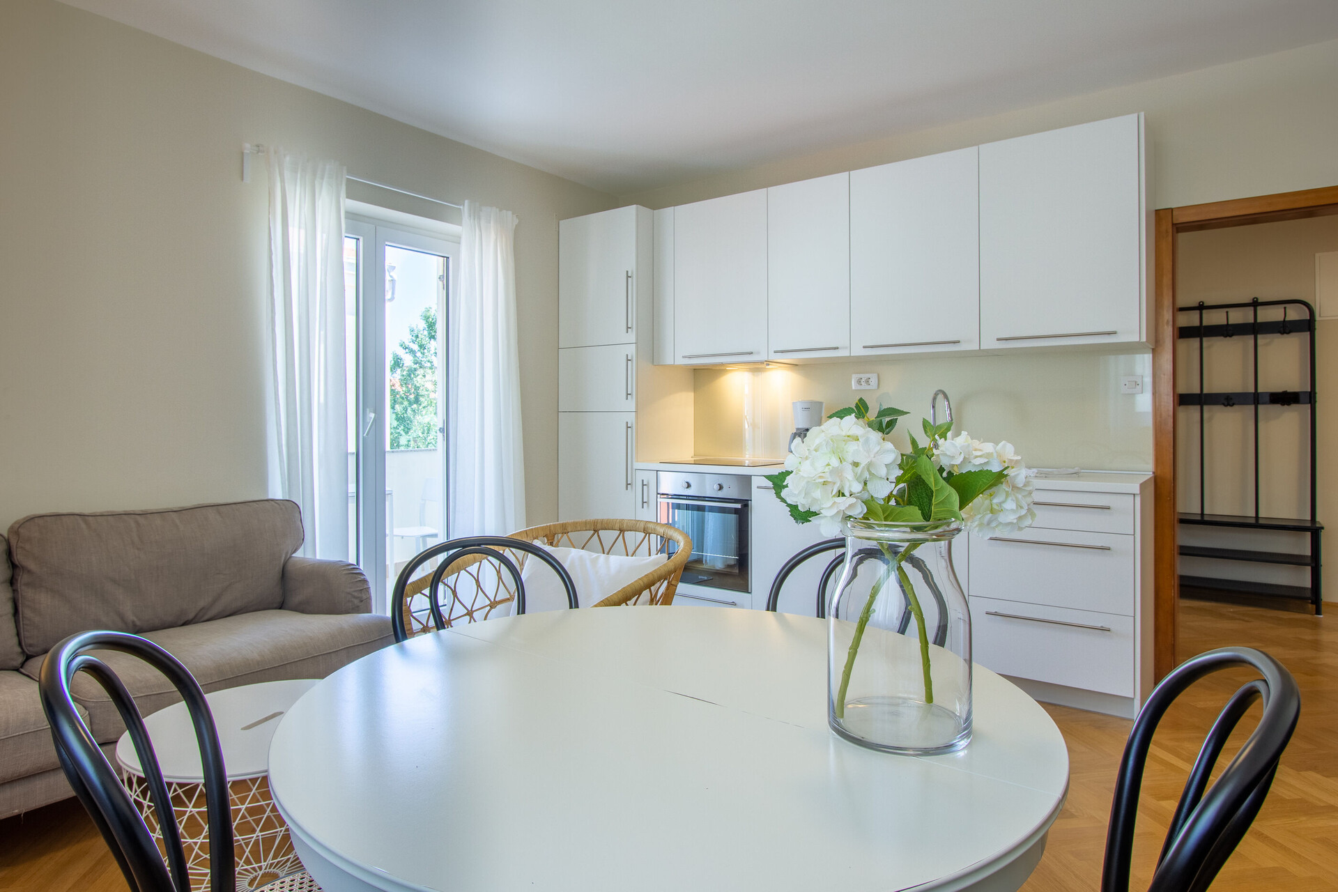 • Tisch und Stühle, Waschbecken, Ofen, Kühlschrank, Kühlfach, Wasserkocher, Filterkaffee-Aparat, Herd Kochfeld.