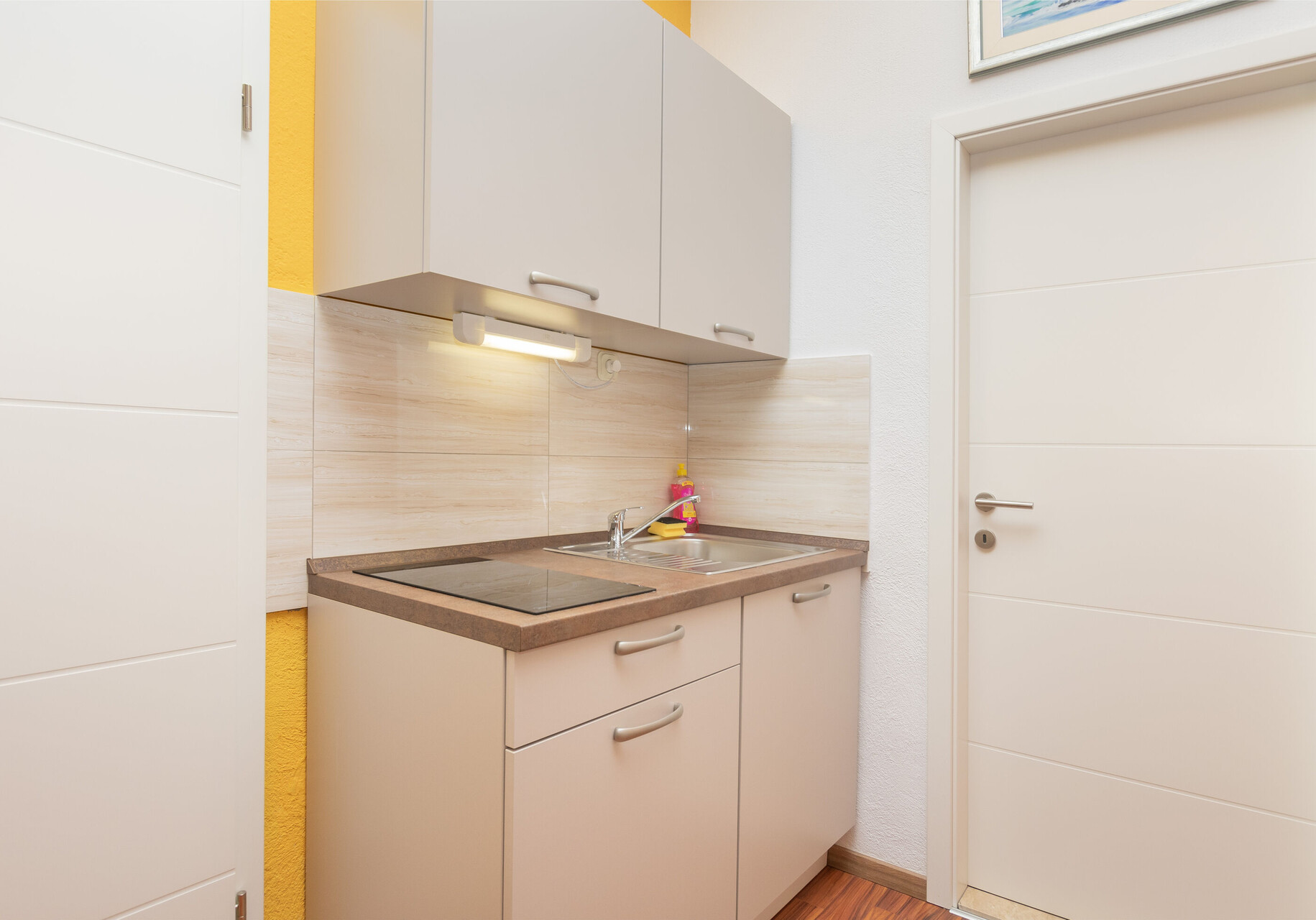 • Tisch und Stühle, Waschbecken, Kühlschrank, Kühlfach, Wasserkocher, Bügeleisen, Herd Kochfeld.