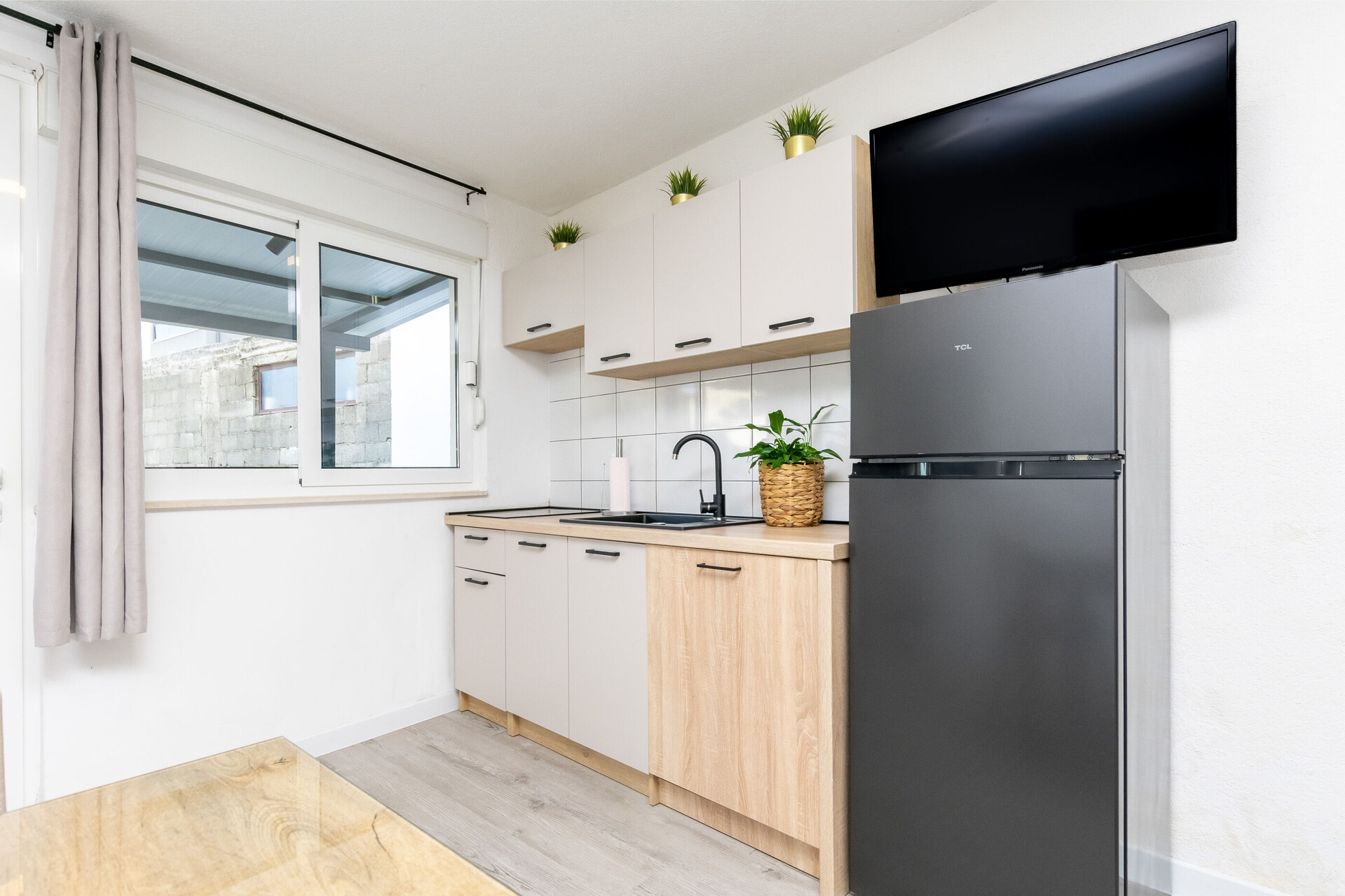 • Tisch und Stühle, Waschbecken, Kühlschrank, Kühlfach, Wasserkocher, Filterkaffee-Aparat, Toaster, Geschirrspülmaschine, Bügeleisen, Herd Kochfeld.