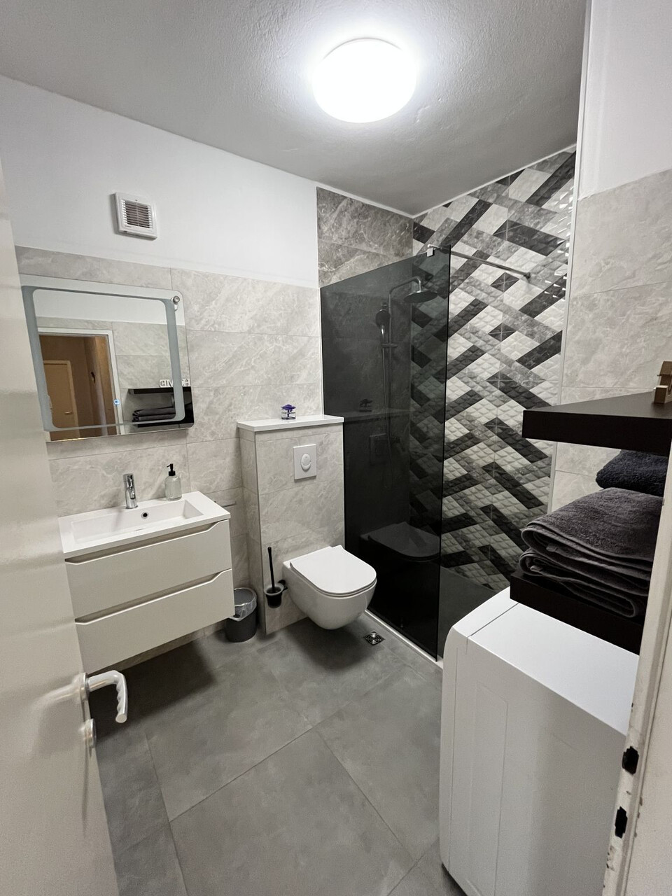 • Dusche, Duschkabine, Waschmaschine, Fön, Handtücher.