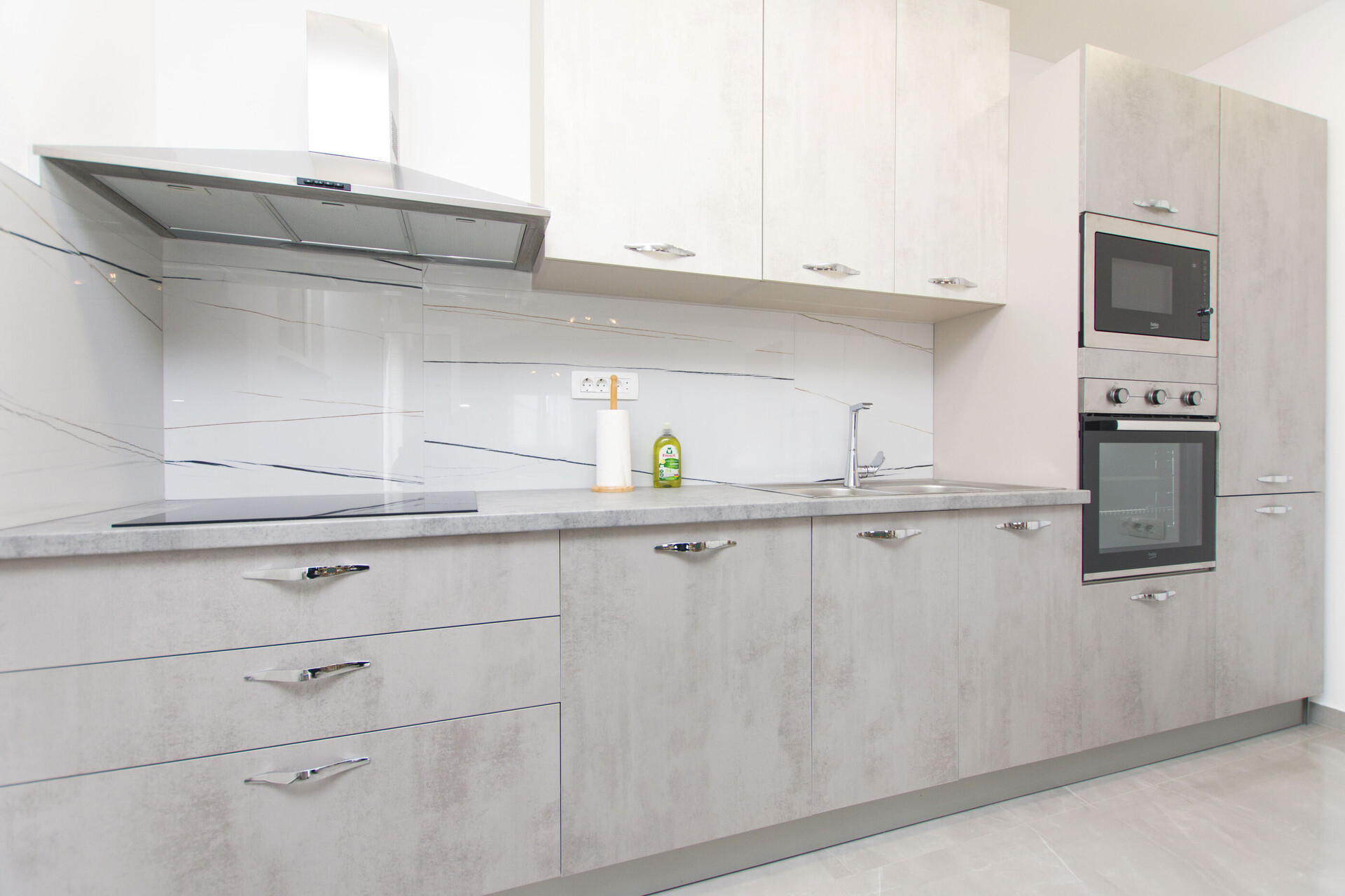 • Tisch und Stühle, Waschbecken, Ofen, Kühlschrank, Kühlfach, Mikrowelle, Geschirrspülmaschine, Herd Kochfeld.