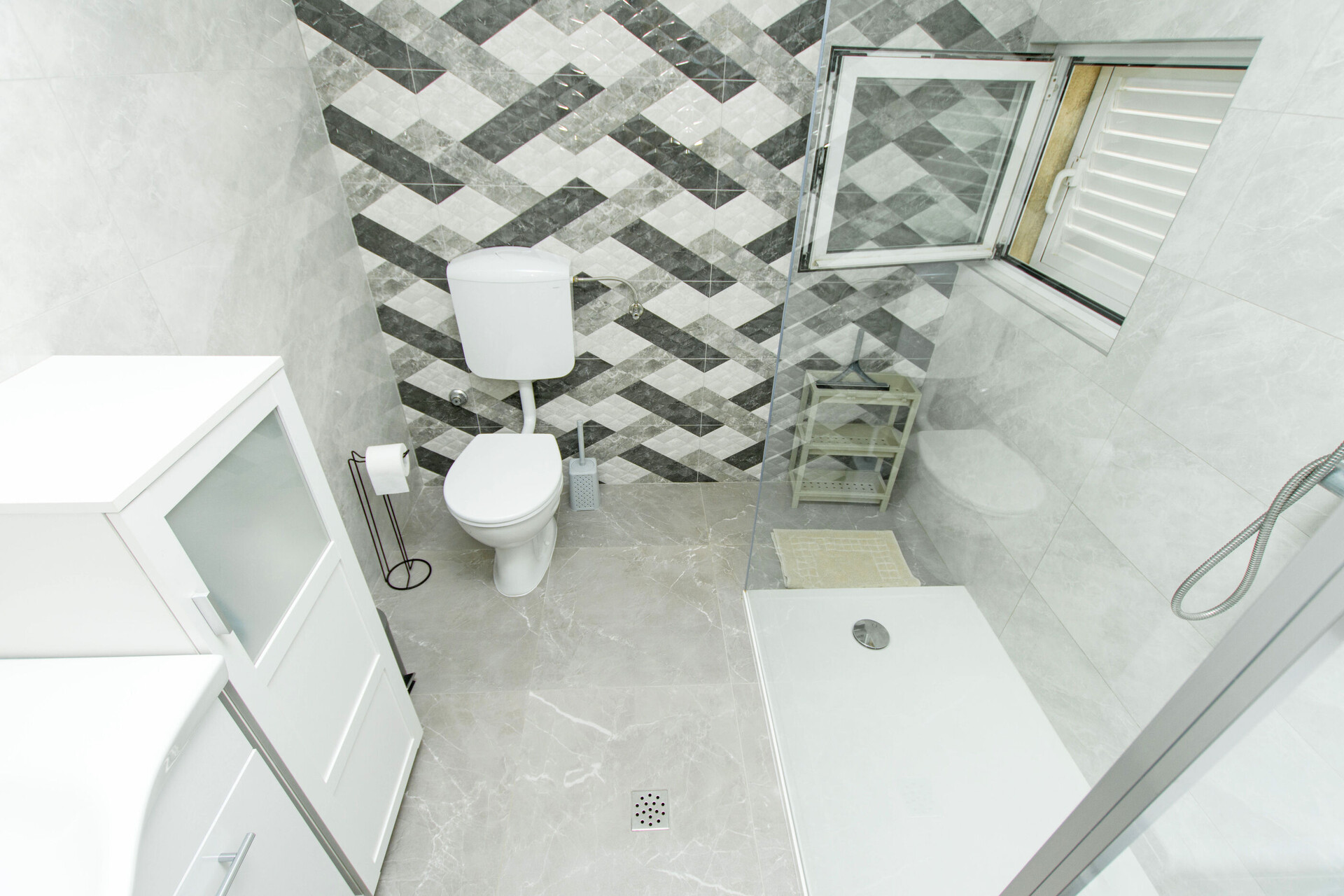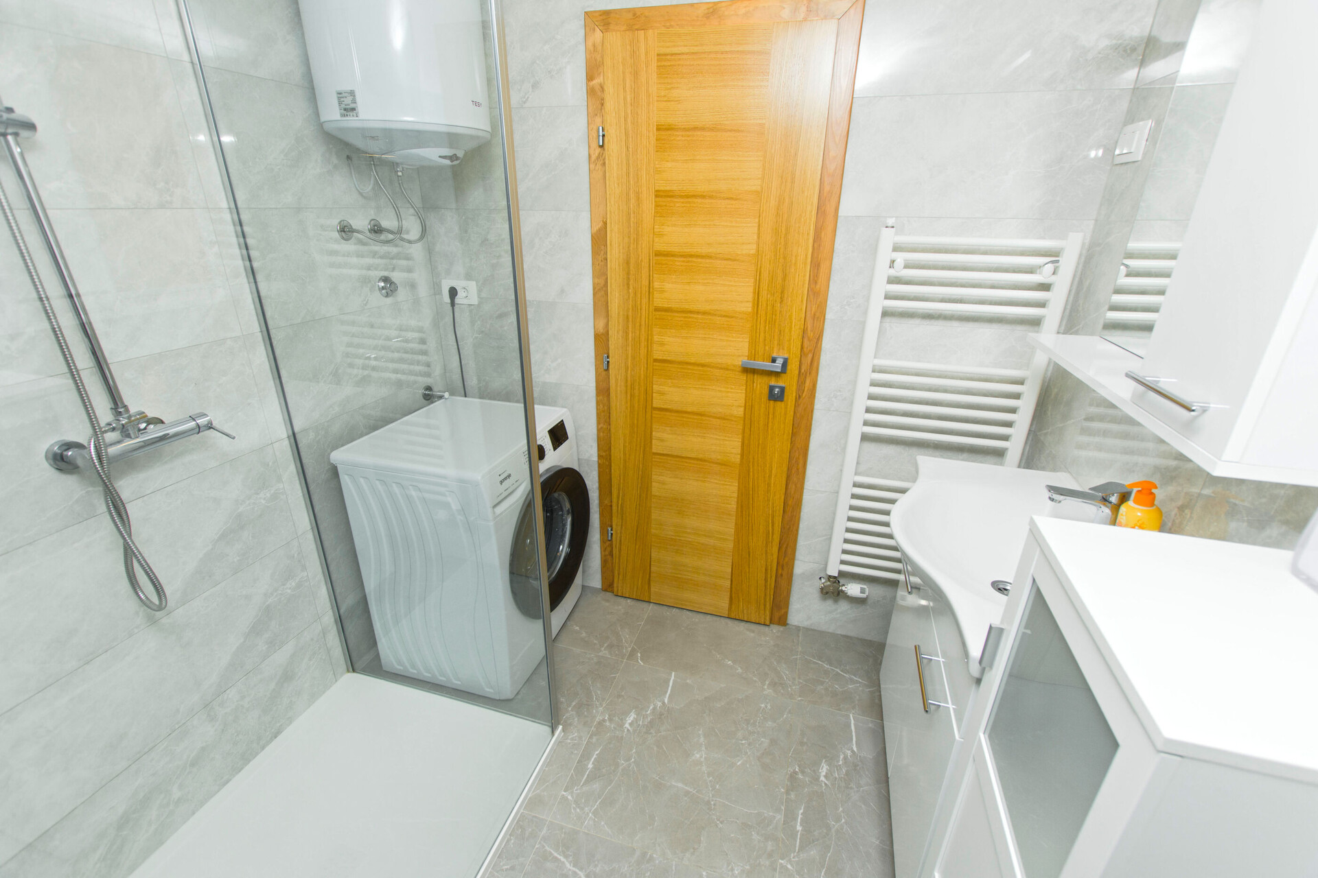 • Dusche, Duschkabine, Waschmaschine, Handtücher.