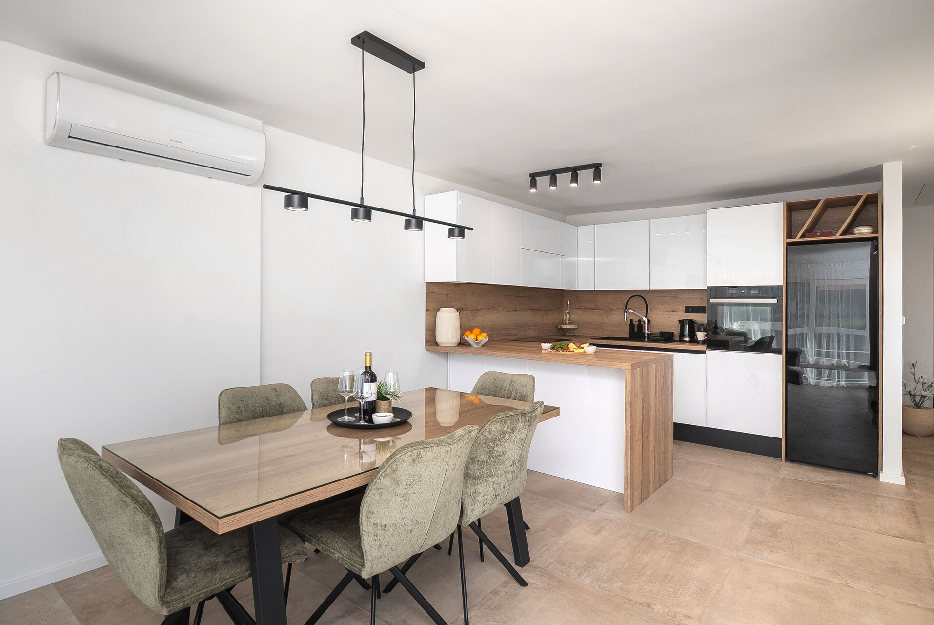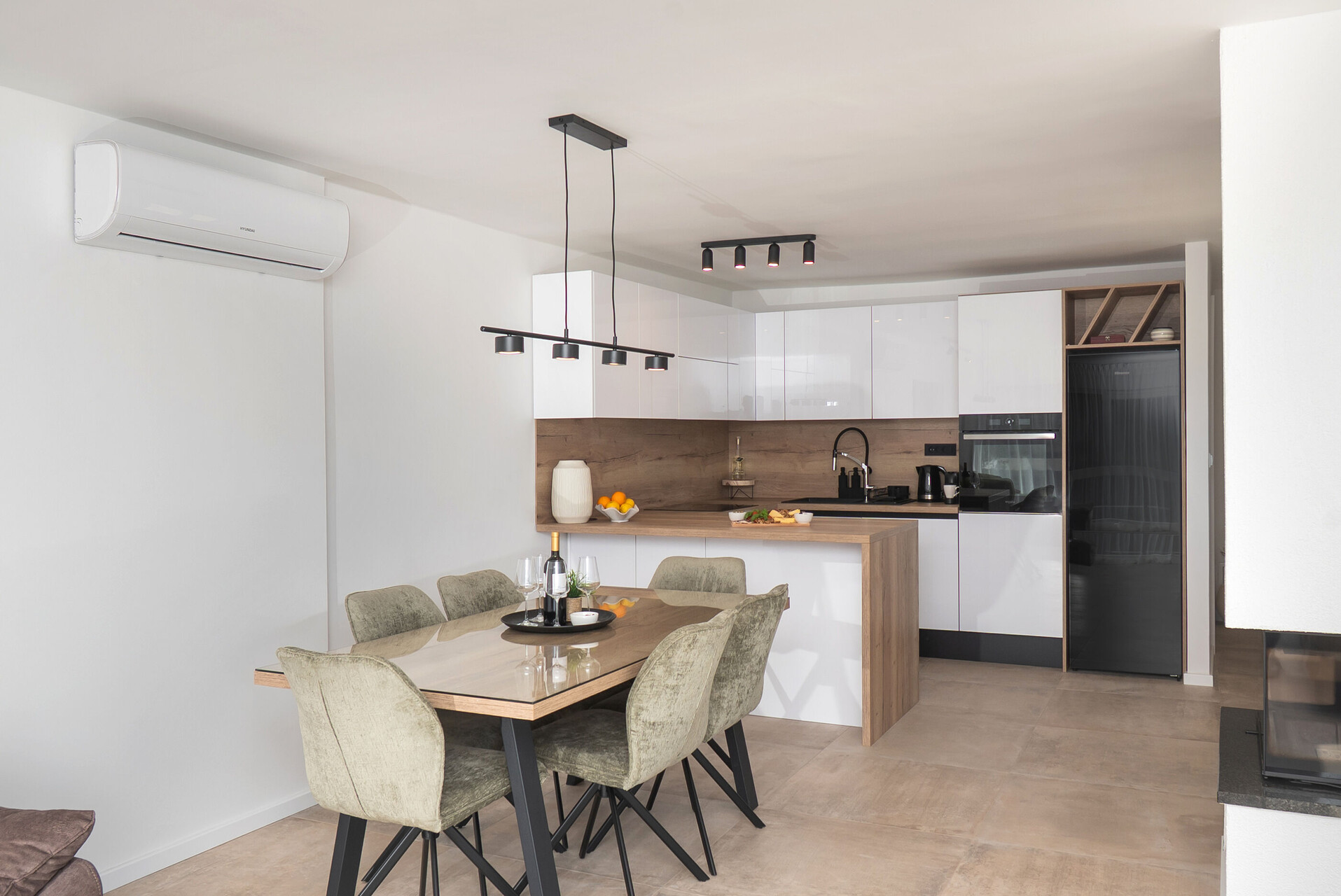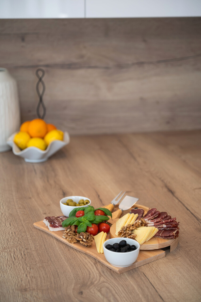 • Tisch und Stühle, Waschbecken, Ofen, Kühlschrank, Kühlfach, Wasserkocher, Filterkaffee-Aparat, Mikrowelle, Toaster, Bügeleisen, Herd Kochfeld.