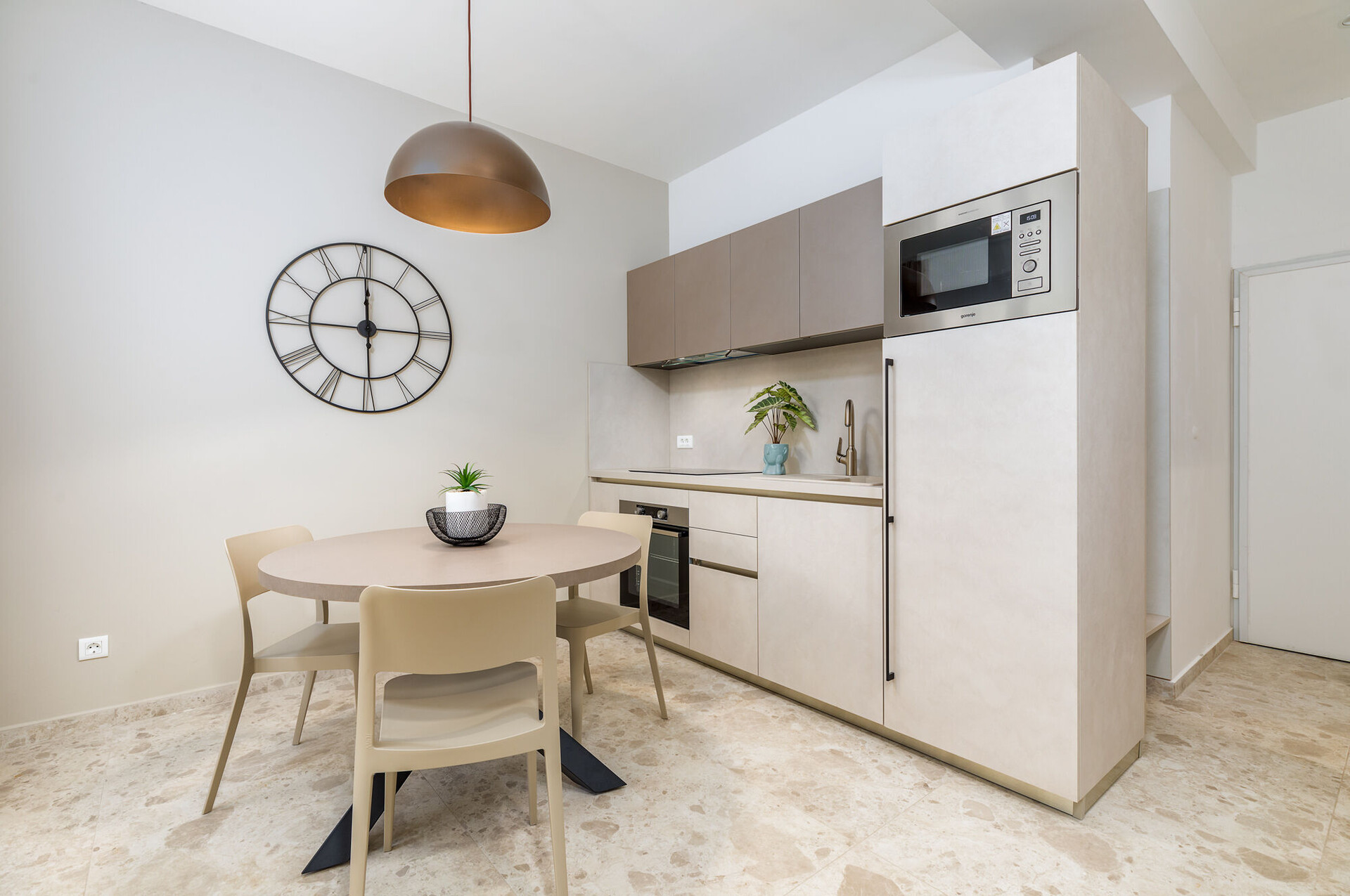 • stol i stolice, sudoper, frižider, zamrzivač, aparat - kuhalo za vodu, aparat za filter kafu, toster, ploča za kuhanje.