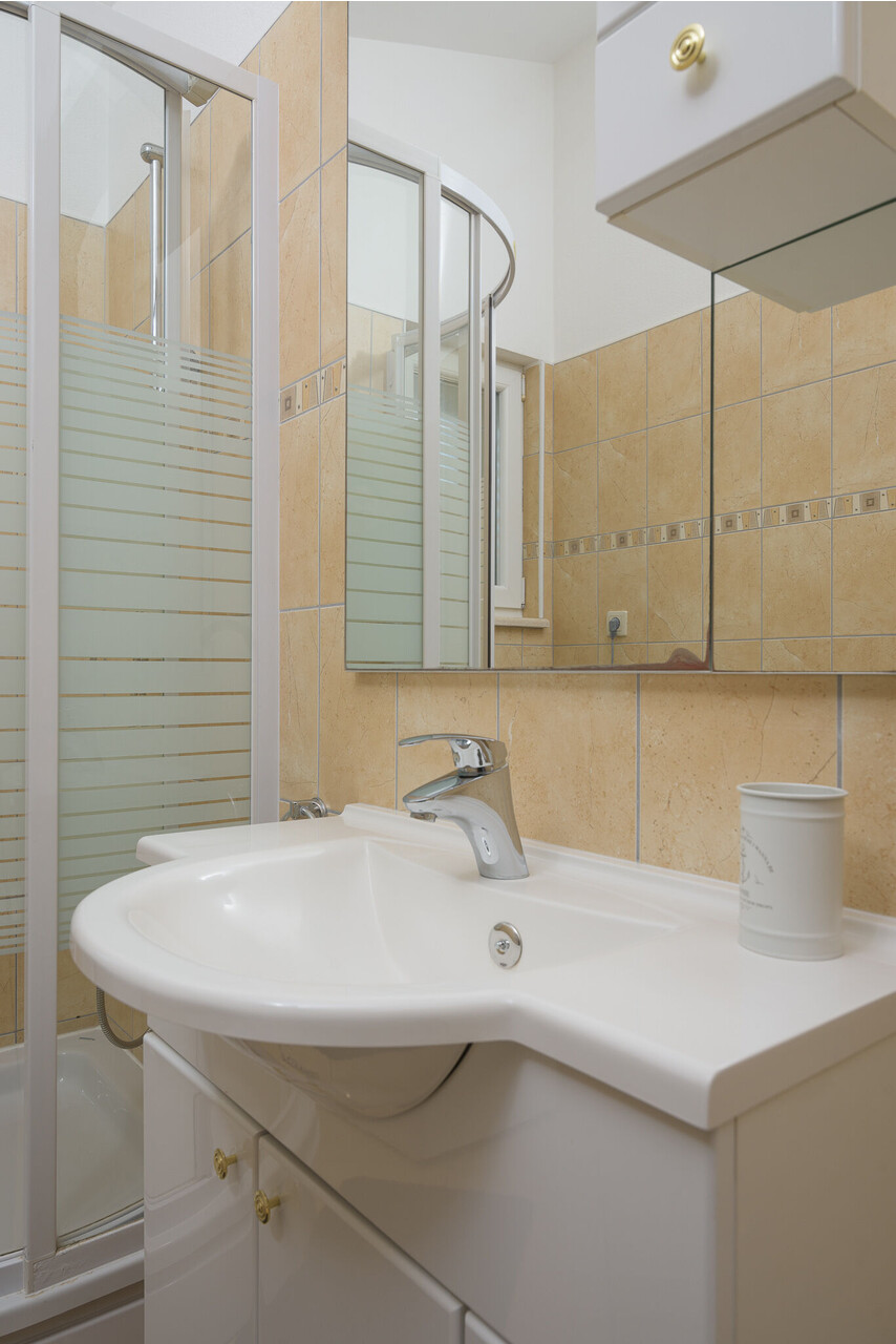 • tuš, tuš kabina, stroj za pranje rublja, fen, ručnici.