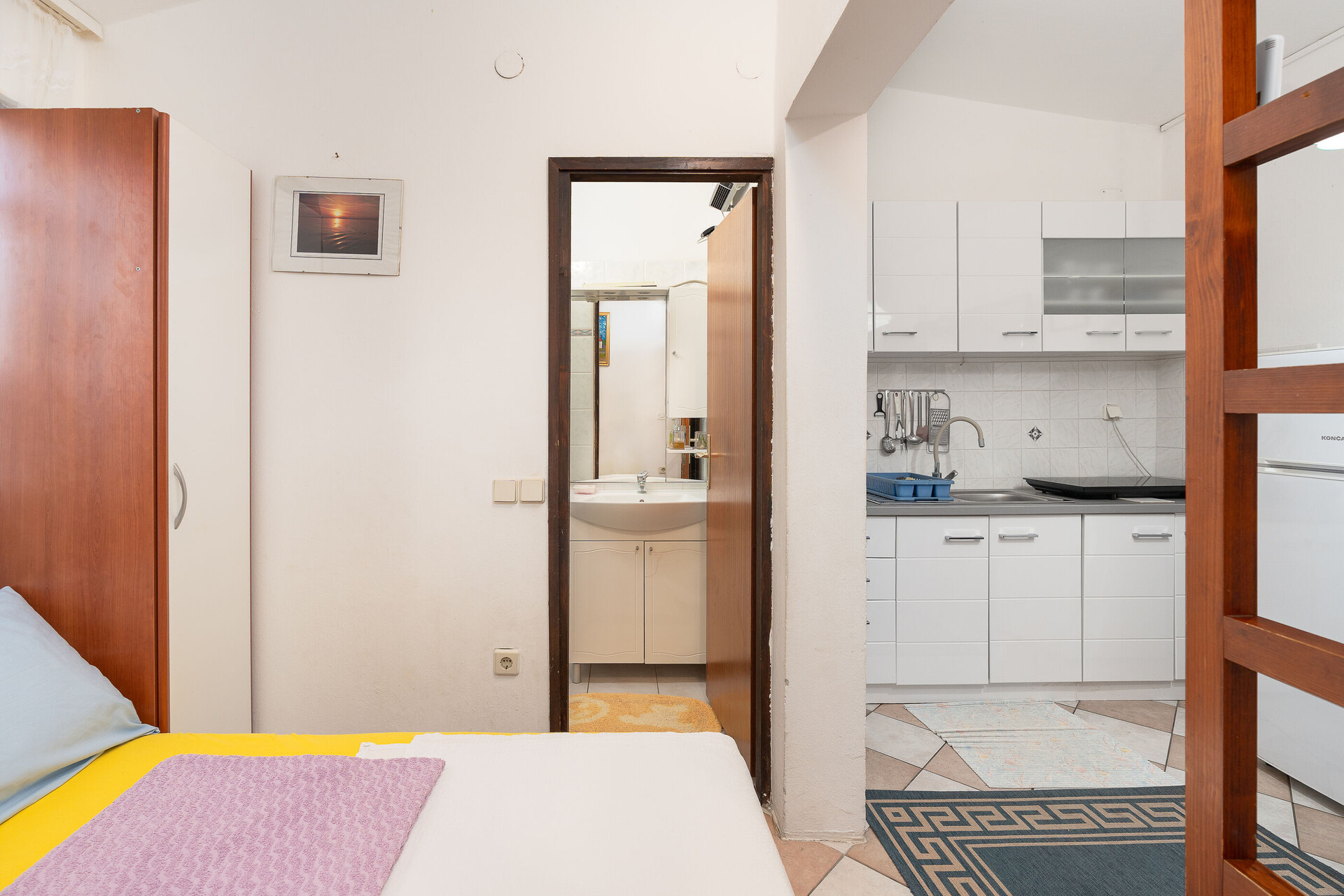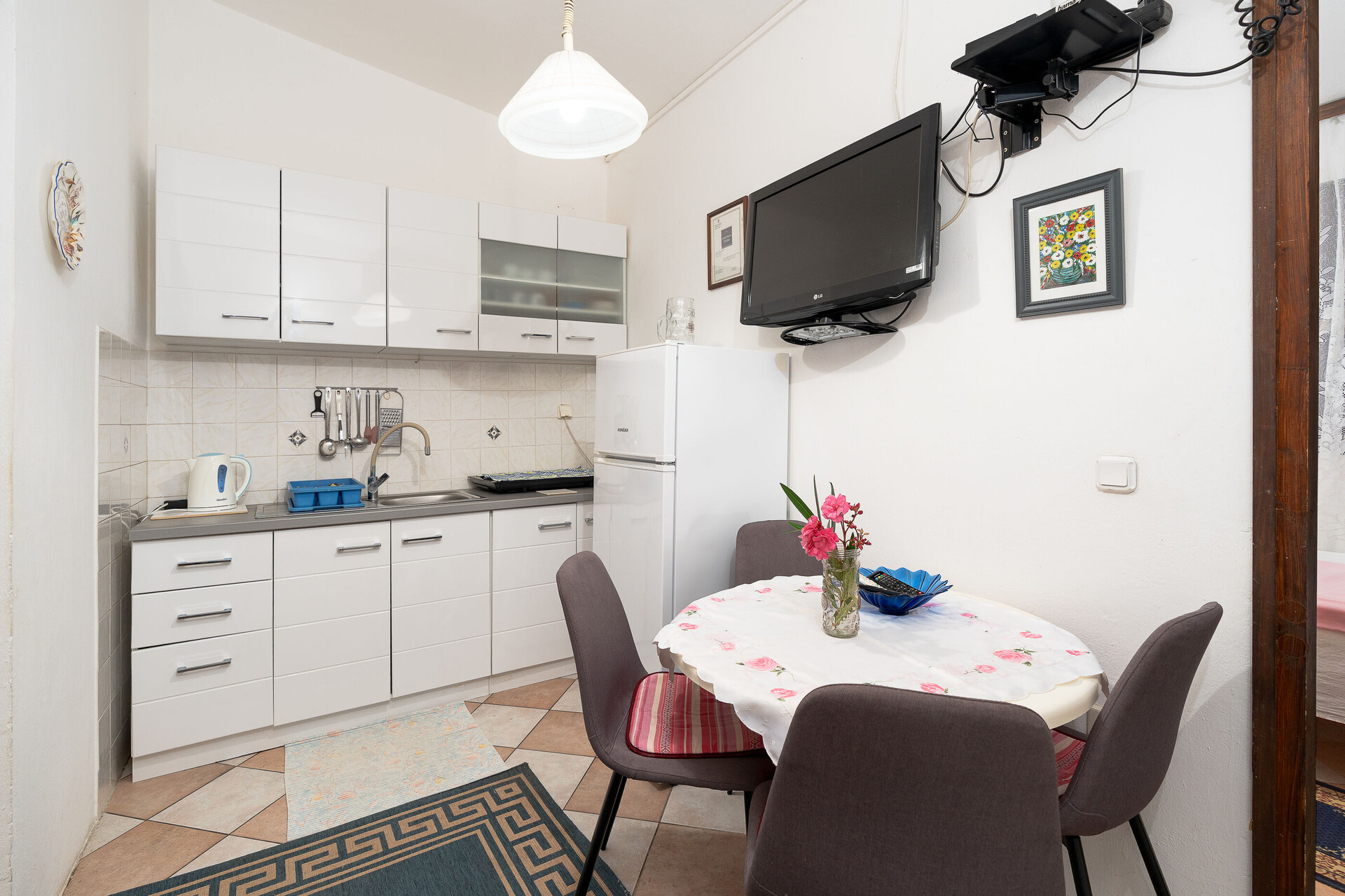 • stol i stolice, sudoper, pećnica, frižider, zamrzivač, aparat - kuhalo za vodu, aparat za filter kafu, pegla, ploča za kuhanje.