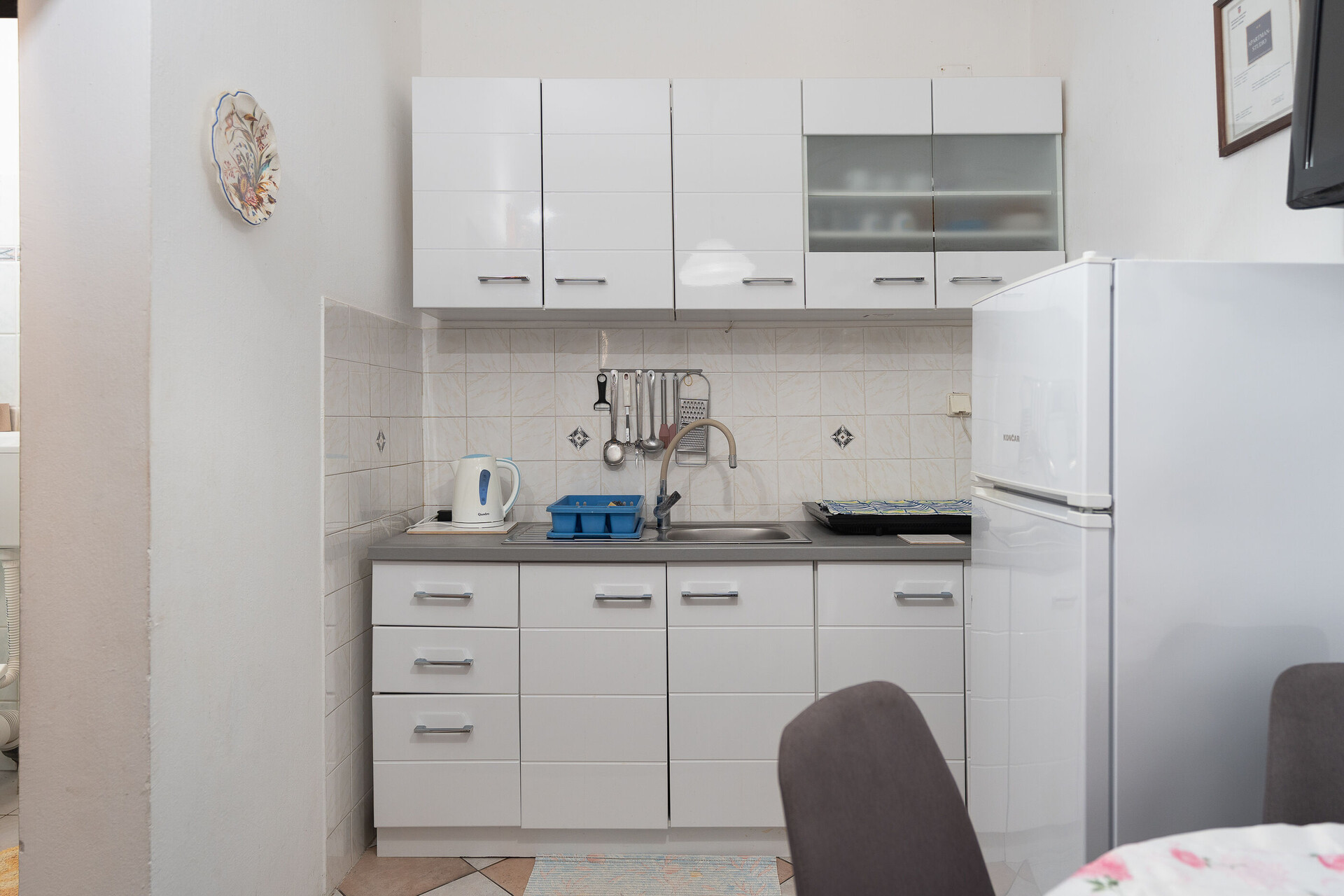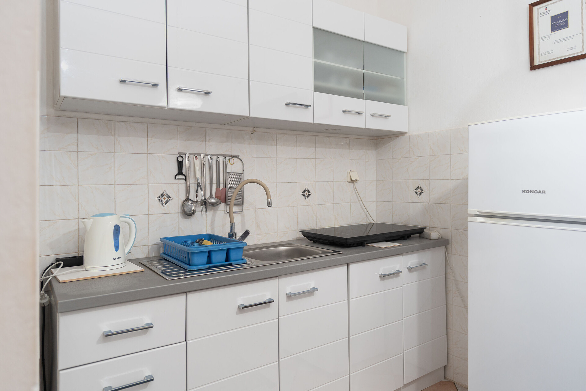 • stol i stolice, sudoper, pećnica, frižider, zamrzivač, aparat - kuhalo za vodu, pegla, ploča za kuhanje.