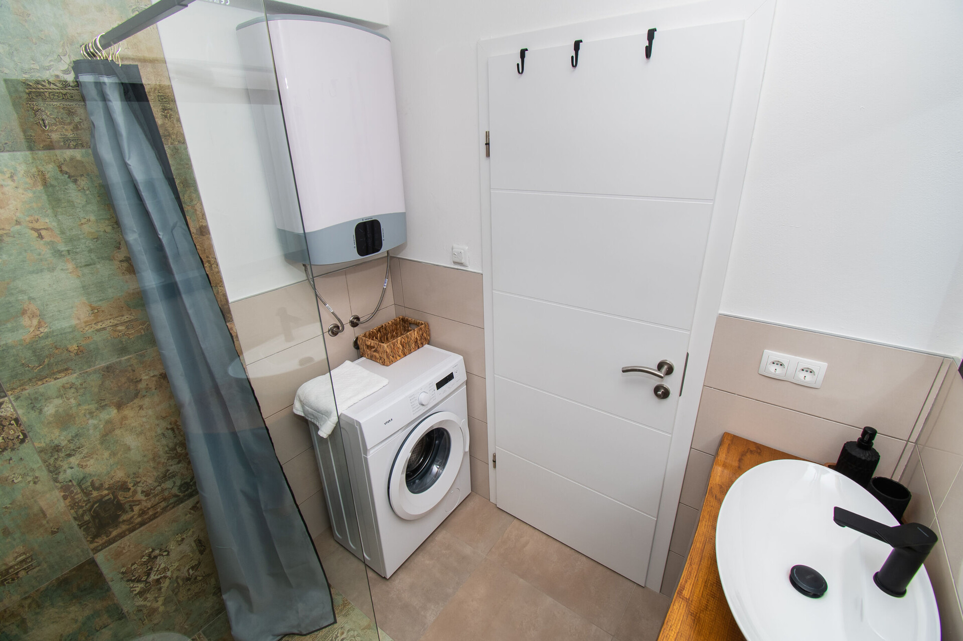 • tuš, tuš kabina, stroj za pranje rublja, fen, ručnici.