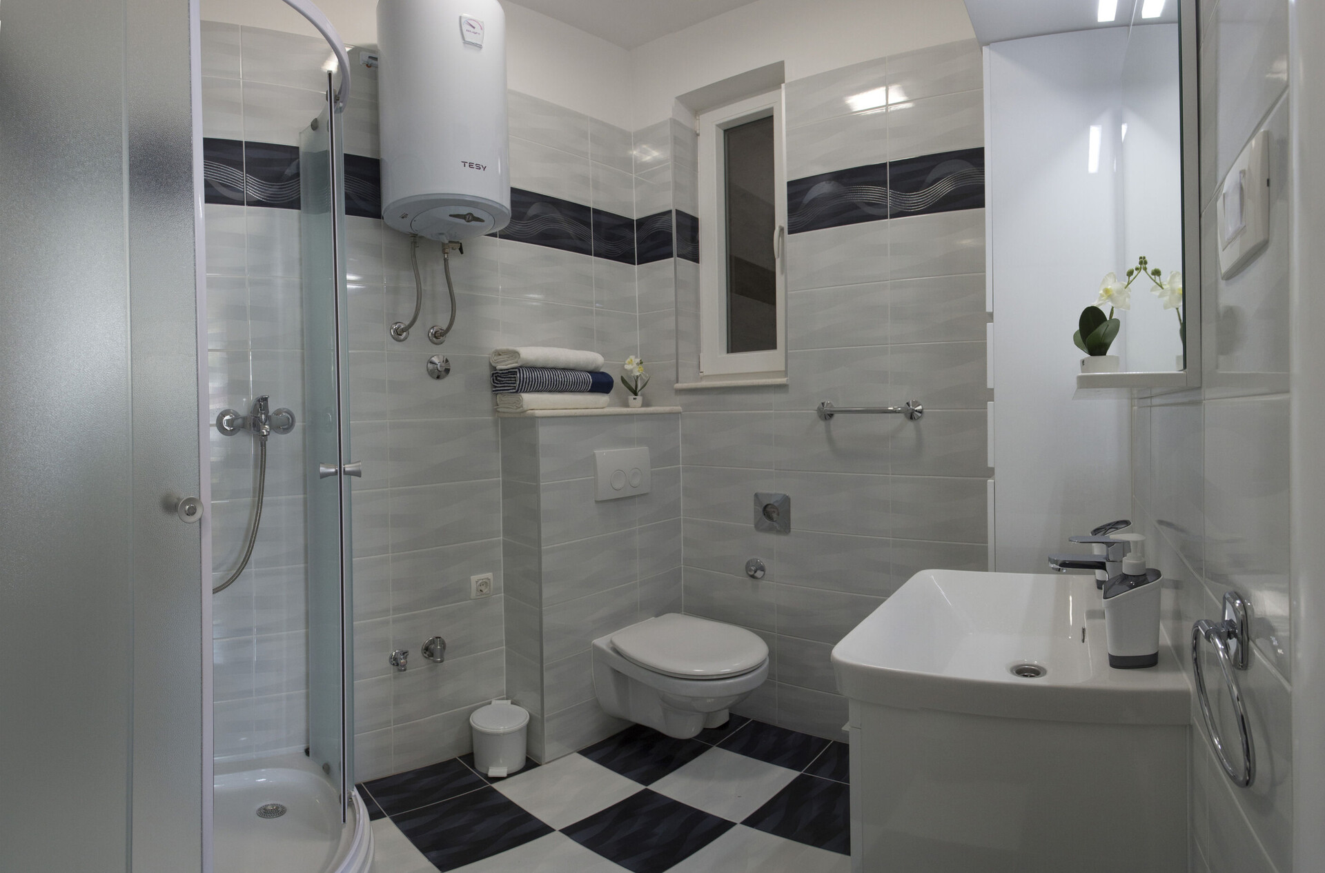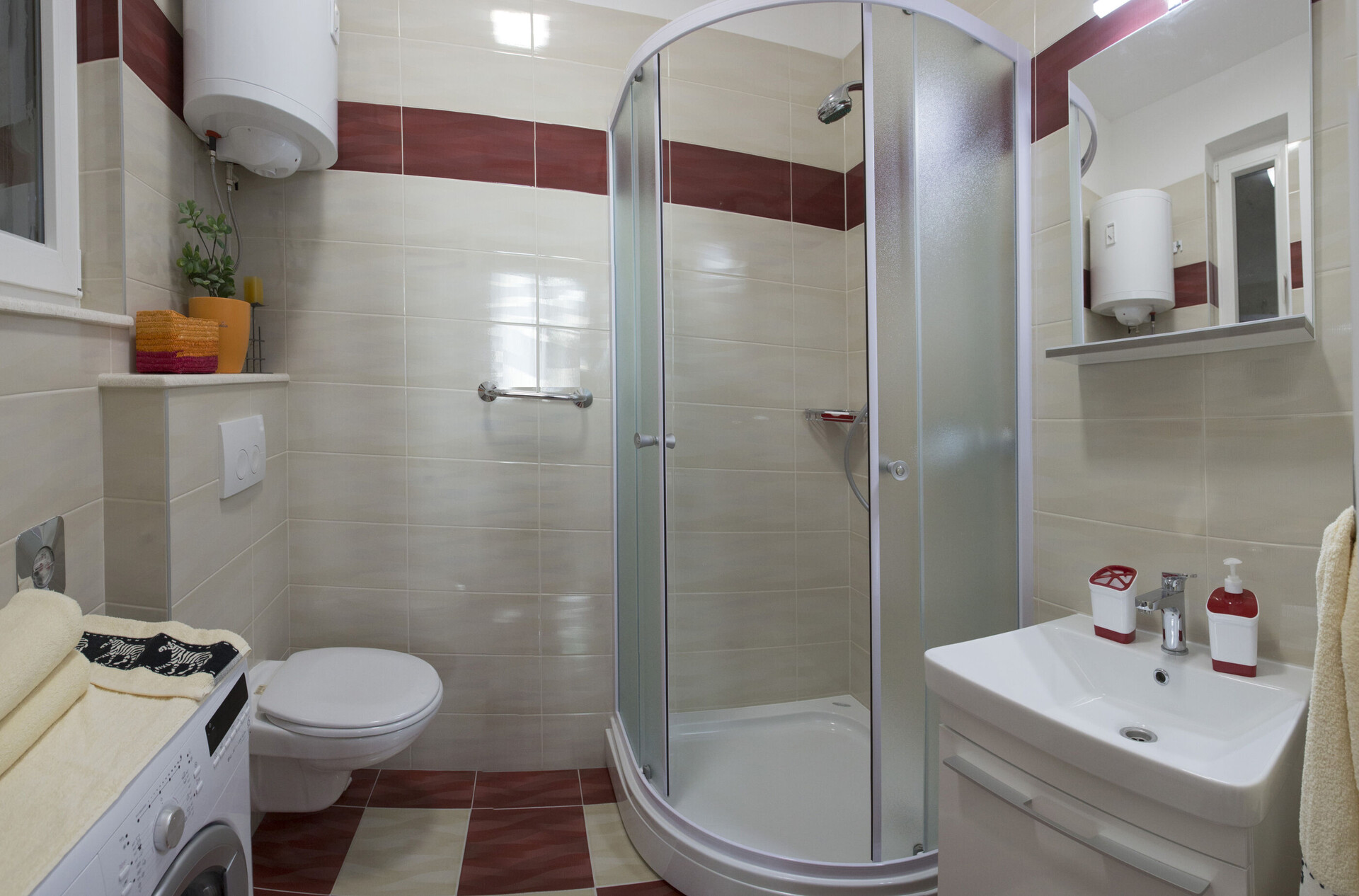 • tuš, tuš kabina, stroj za pranje rublja, fen, ručnici.