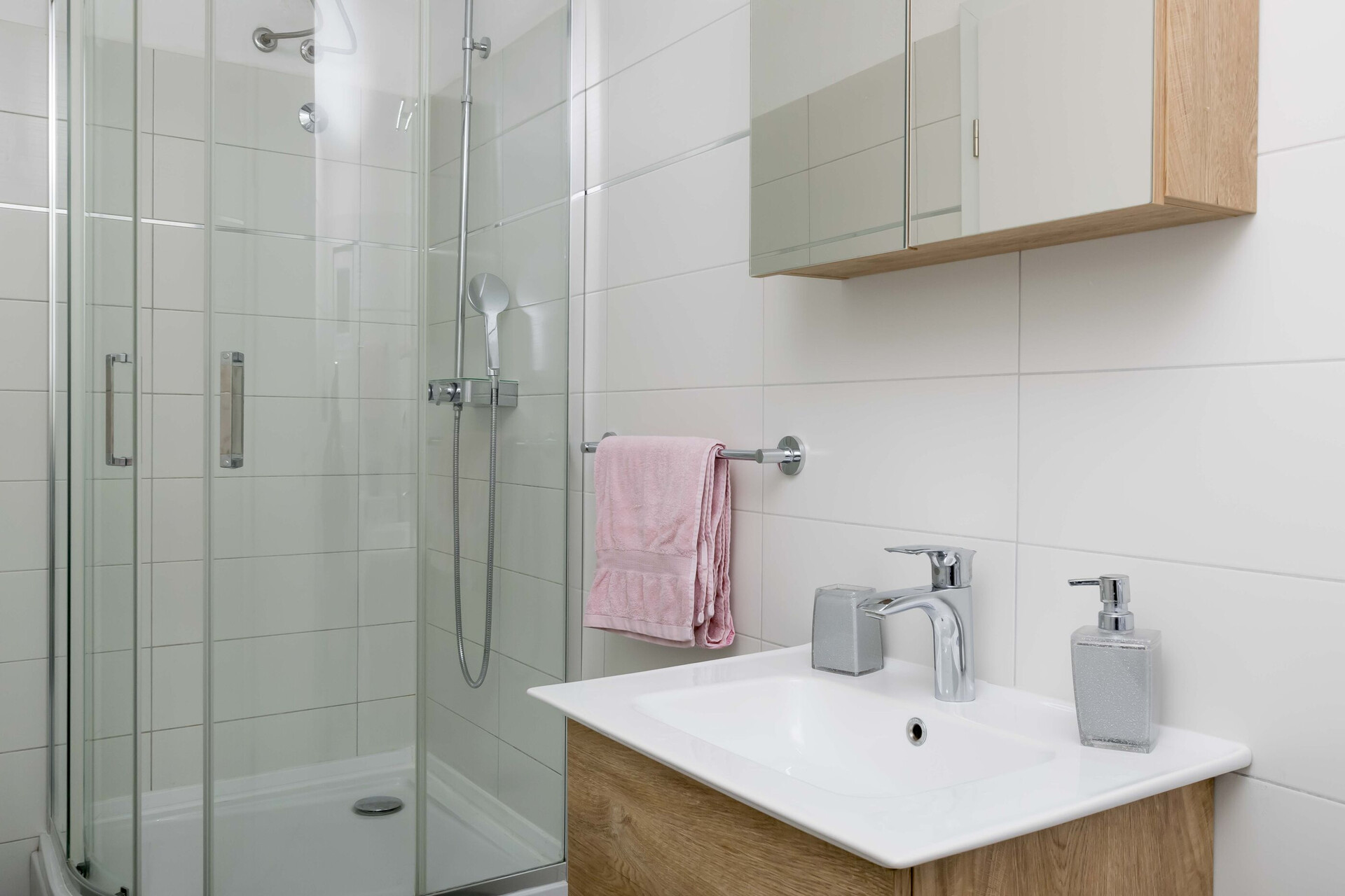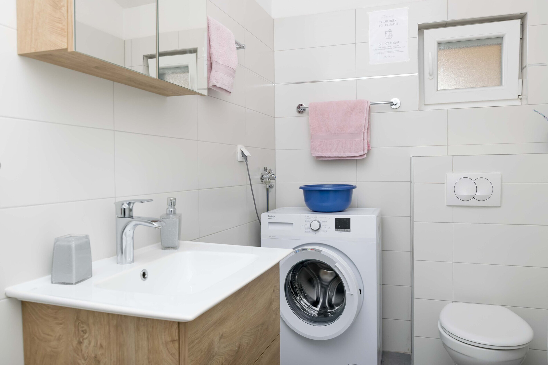 • shower, shower enclosure, washing machine, hairdryer, towels.