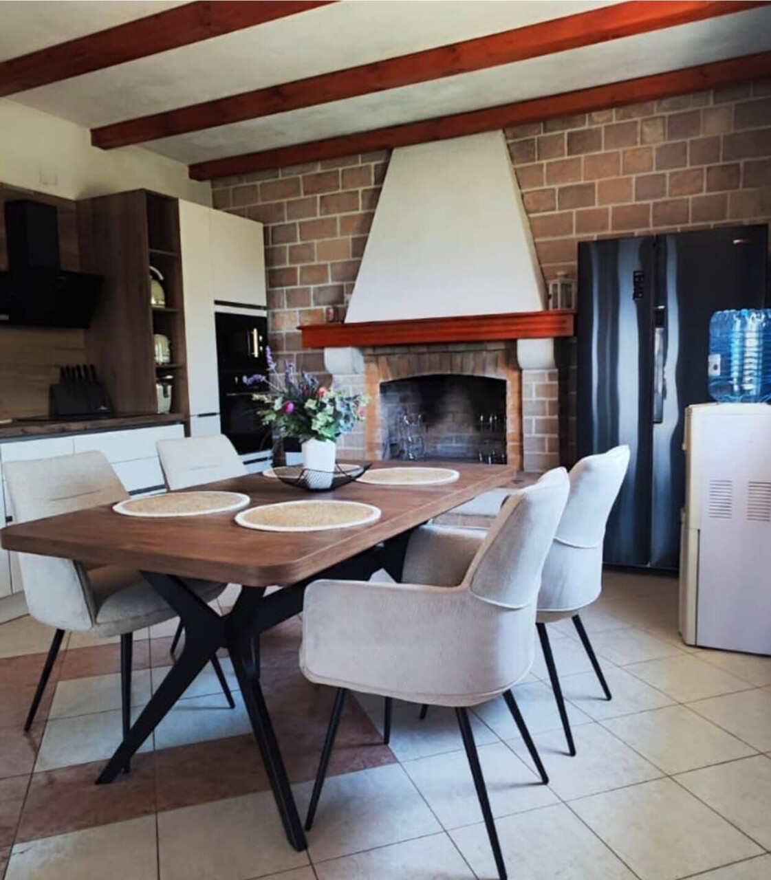 • table and chairs, kitchen sink, refrigerator, upright freezer, electric kettle, filter coffee machine, microwave oven, iron, stove cooktop.