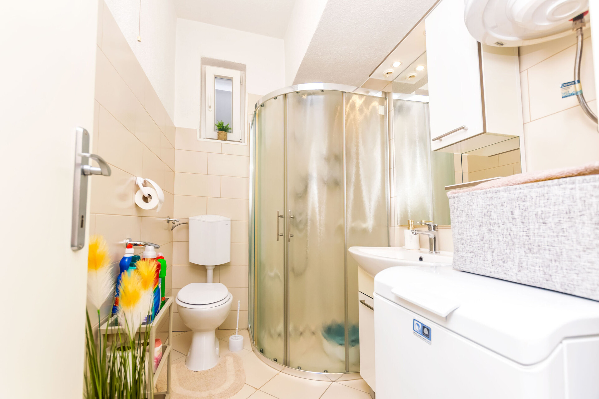 • shower, shower enclosure, washing machine, hairdryer, towels.