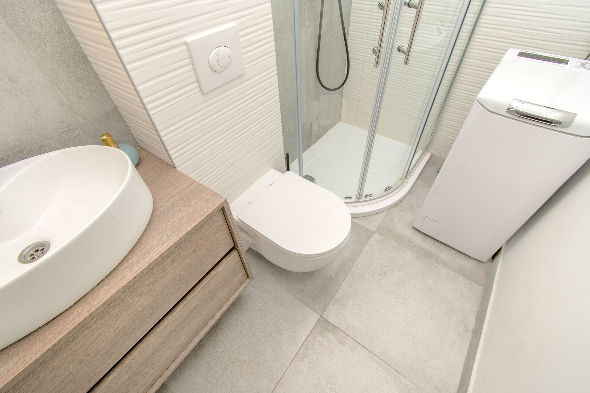 • shower, shower enclosure, washing machine, hairdryer, towels.