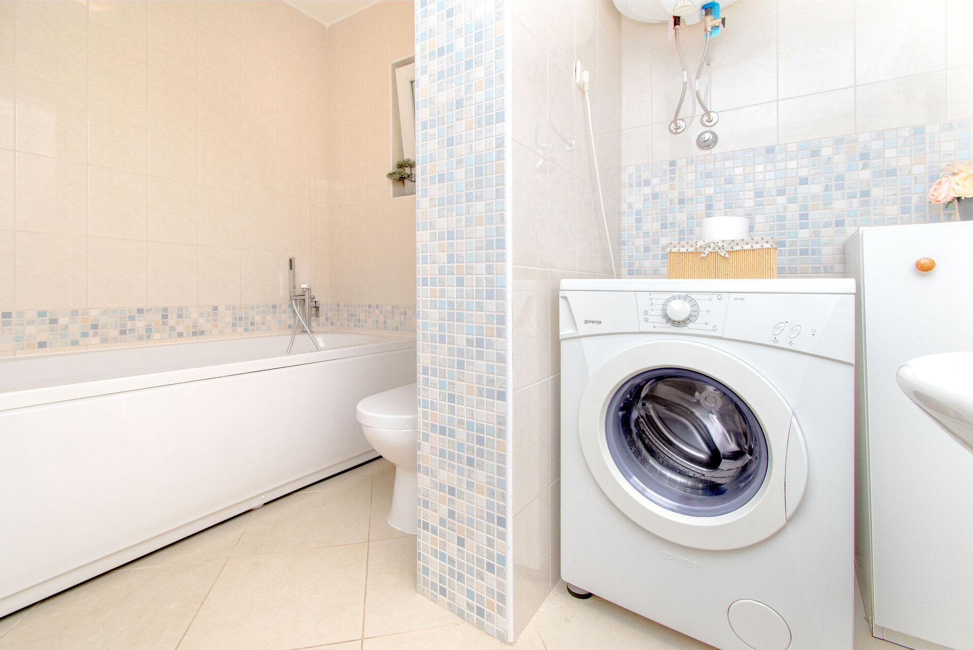 • bathtub, washing machine, hairdryer, towels.
