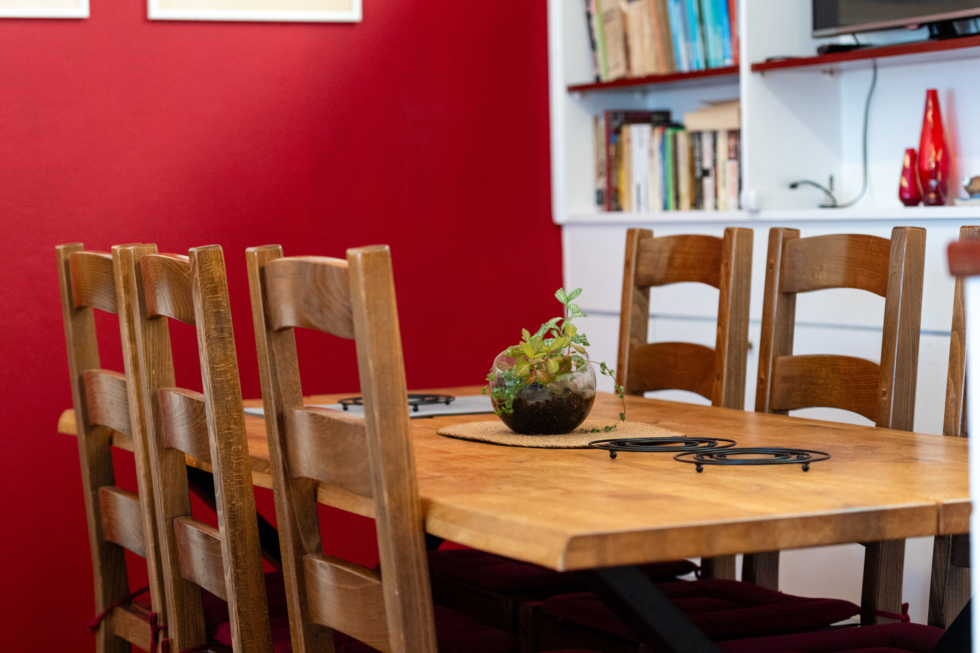 • table and chairs, kitchen sink, oven, refrigerator, electric kettle, filter coffee machine, stove cooktop.