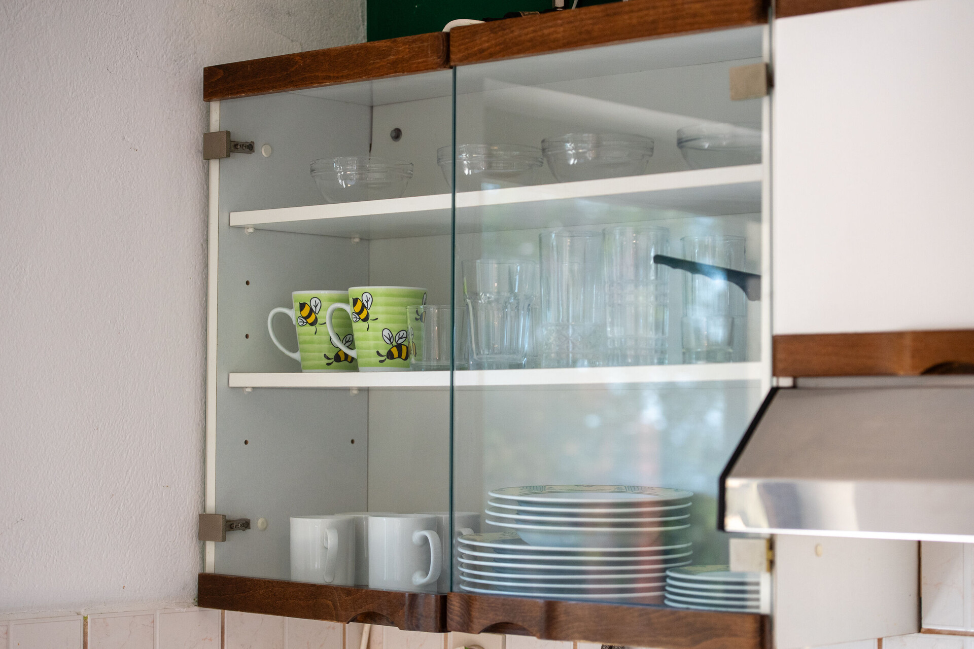 • table and chairs, kitchen sink, oven, refrigerator, upright freezer, electric kettle, filter coffee machine, microwave oven, iron, stove cooktop.