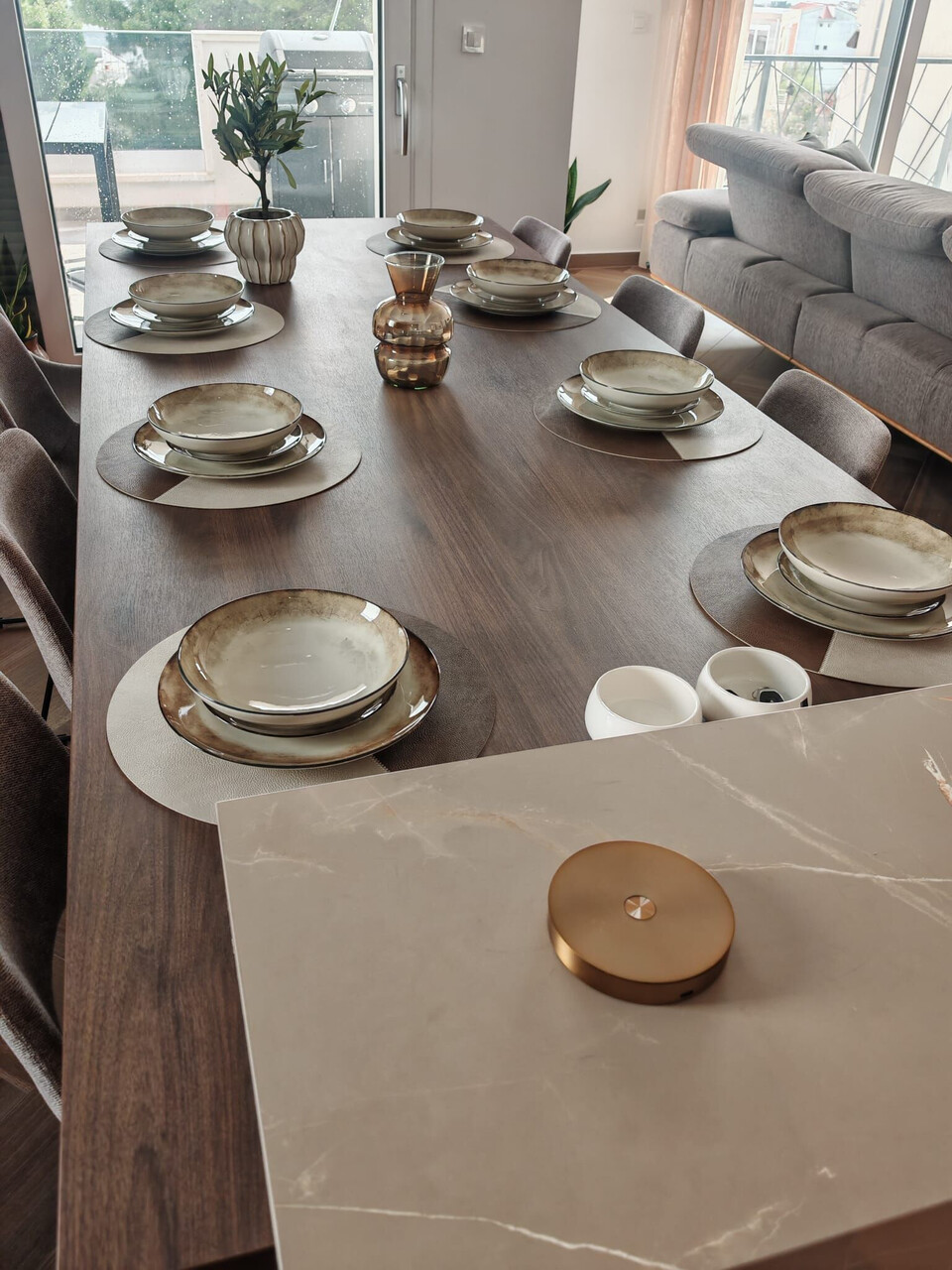 • table and chairs, kitchen sink, oven, refrigerator, upright freezer, electric kettle, filter coffee machine, microwave oven, toaster, dishwasher, stove cooktop.