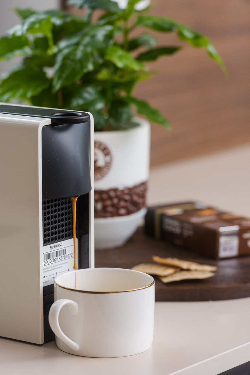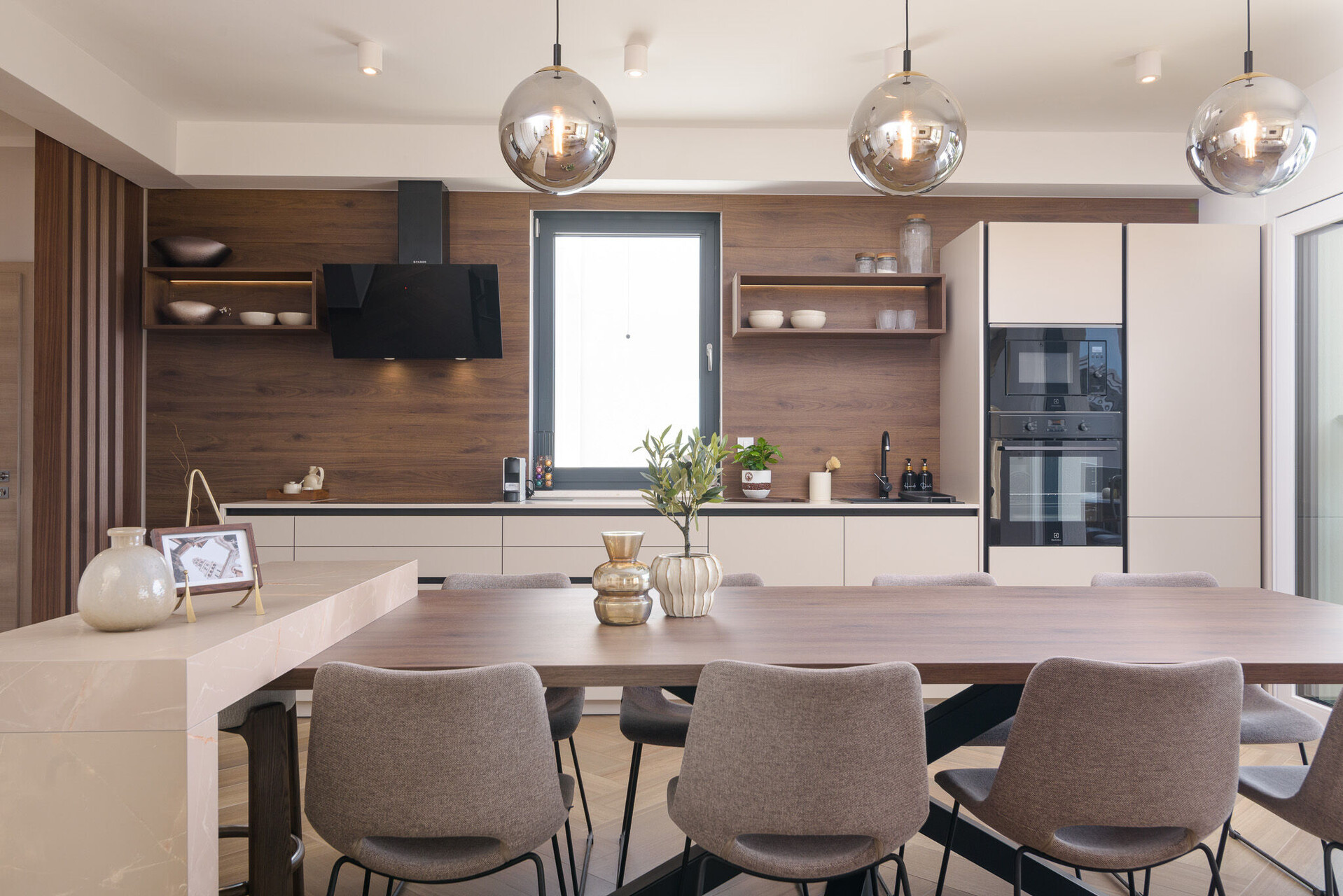 • table and chairs, kitchen sink, oven, refrigerator, upright freezer, electric kettle, filter coffee machine, microwave oven, toaster, dishwasher, iron, stove cooktop.