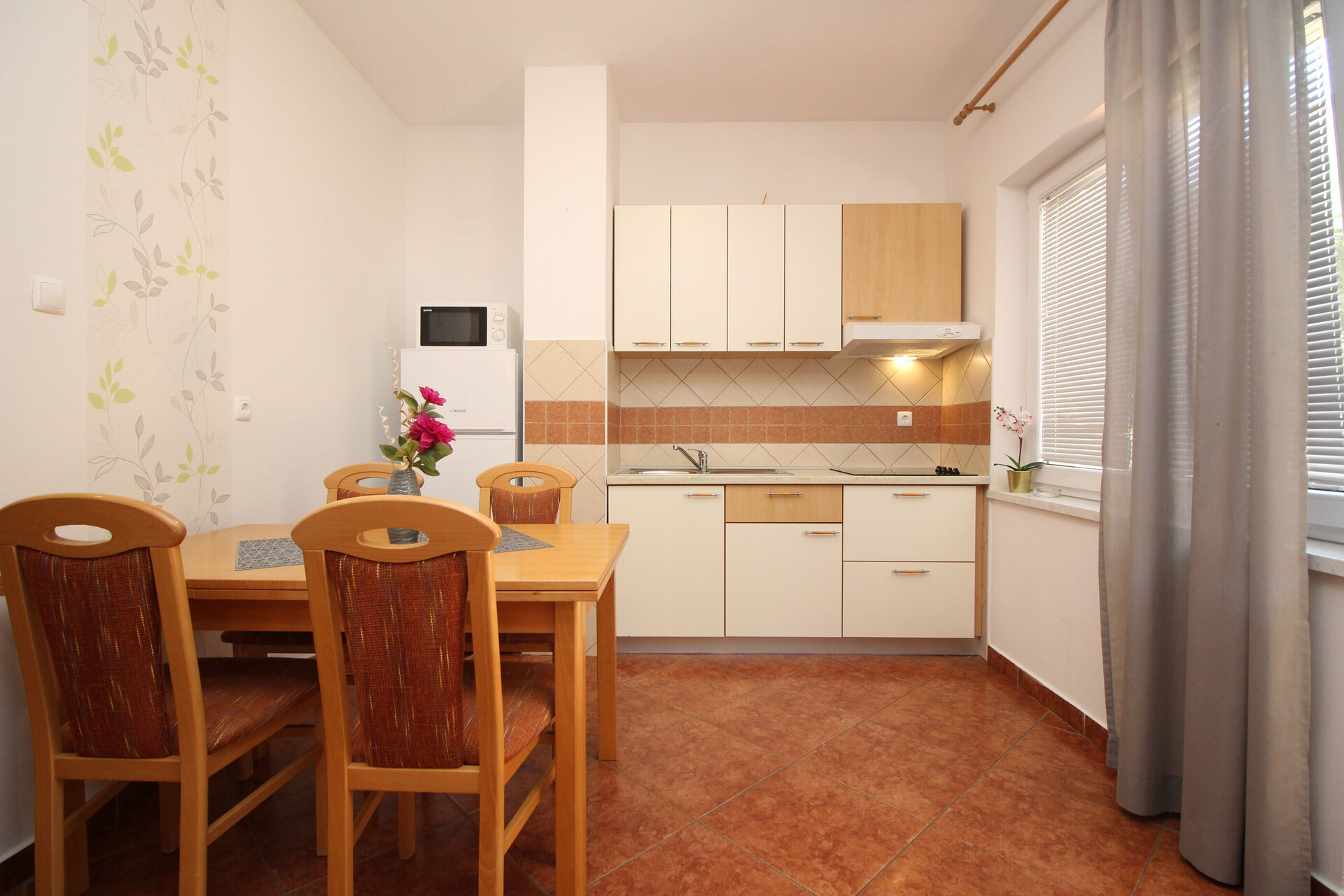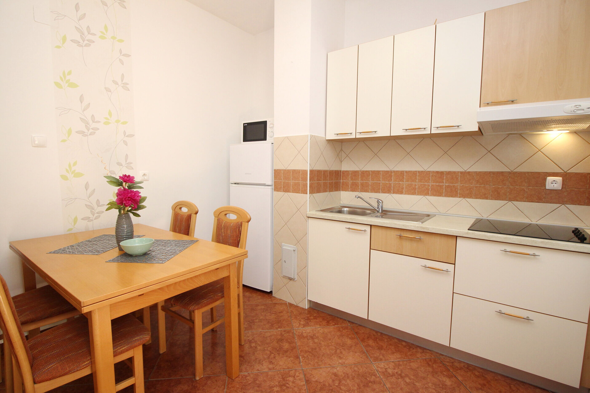 • table and chairs, kitchen sink, electric kettle, filter coffee machine, microwave oven, stove cooktop.