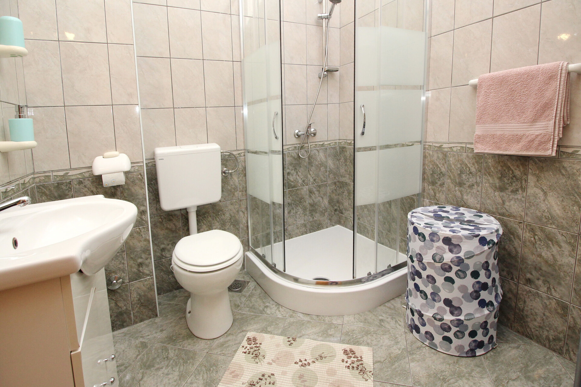 • shower, shower enclosure, washing machine, hairdryer, towels.
