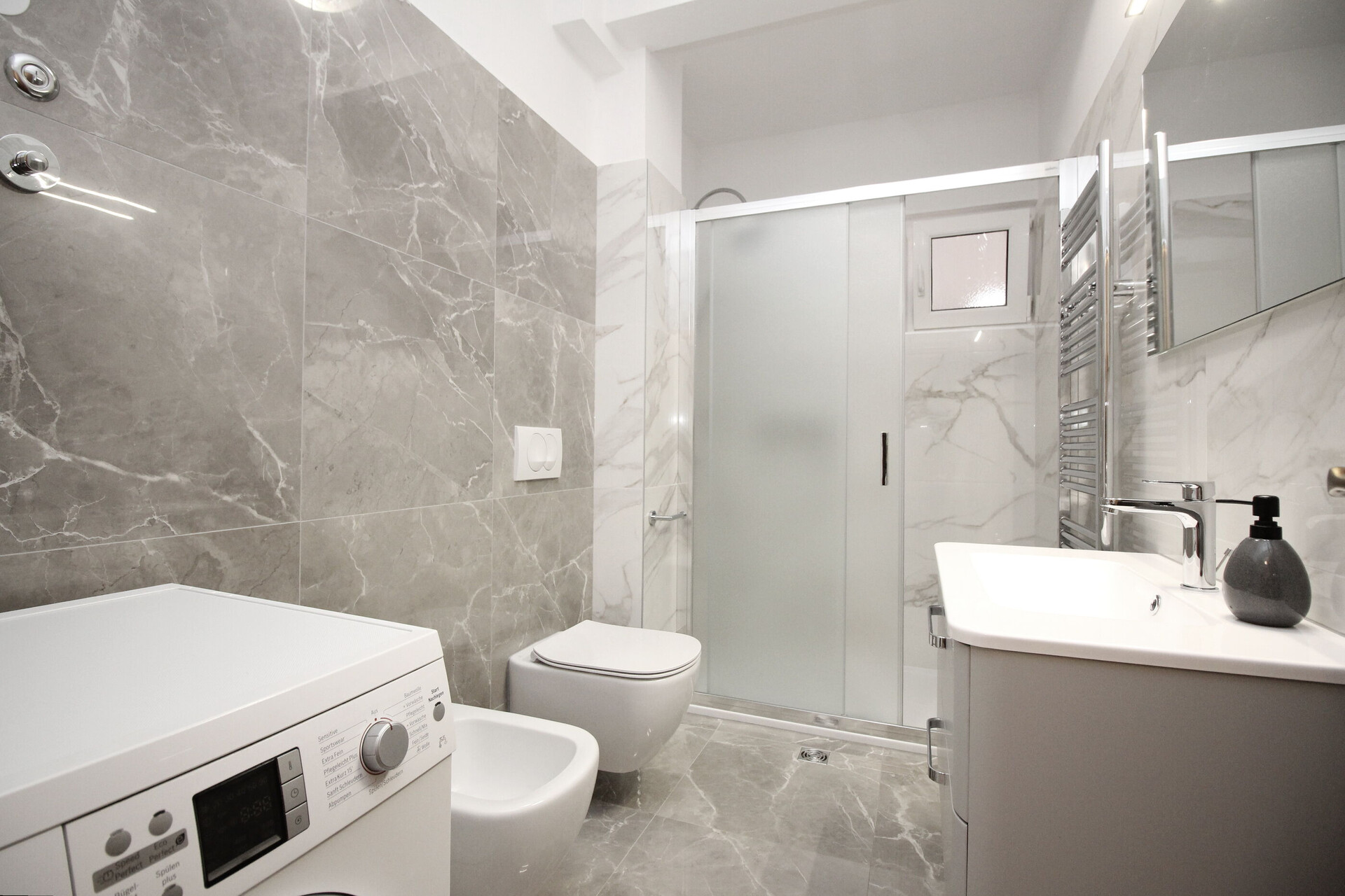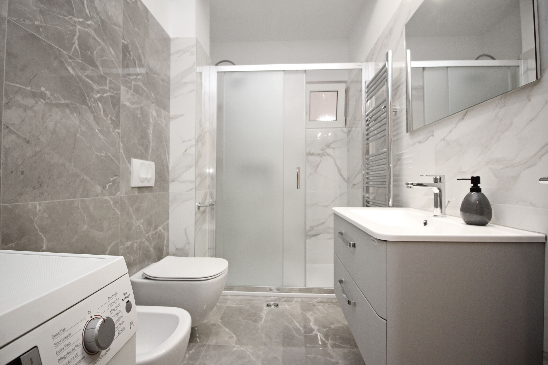 • shower, shower enclosure, washing machine, towels.
