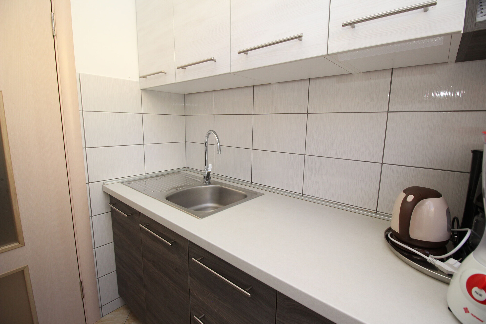 • table and chairs, kitchen sink, oven, refrigerator, electric kettle, filter coffee machine, stove cooktop.