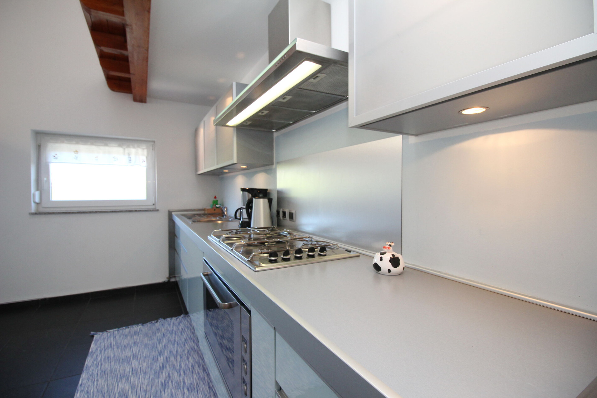 • table and chairs, kitchen sink, filter coffee machine, microwave oven, stove cooktop.