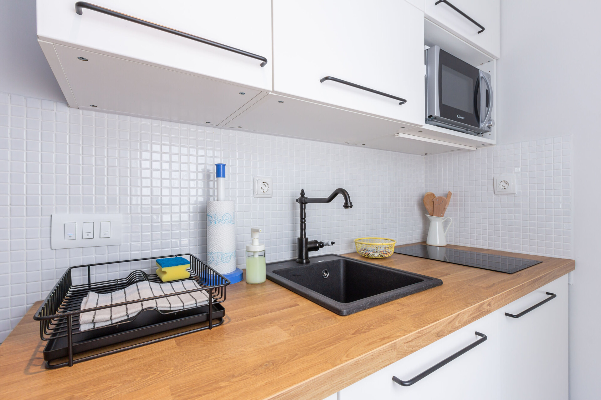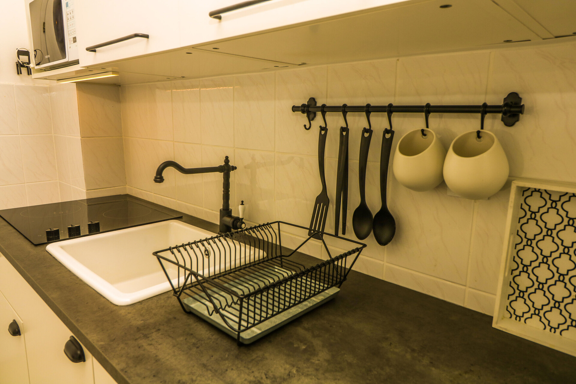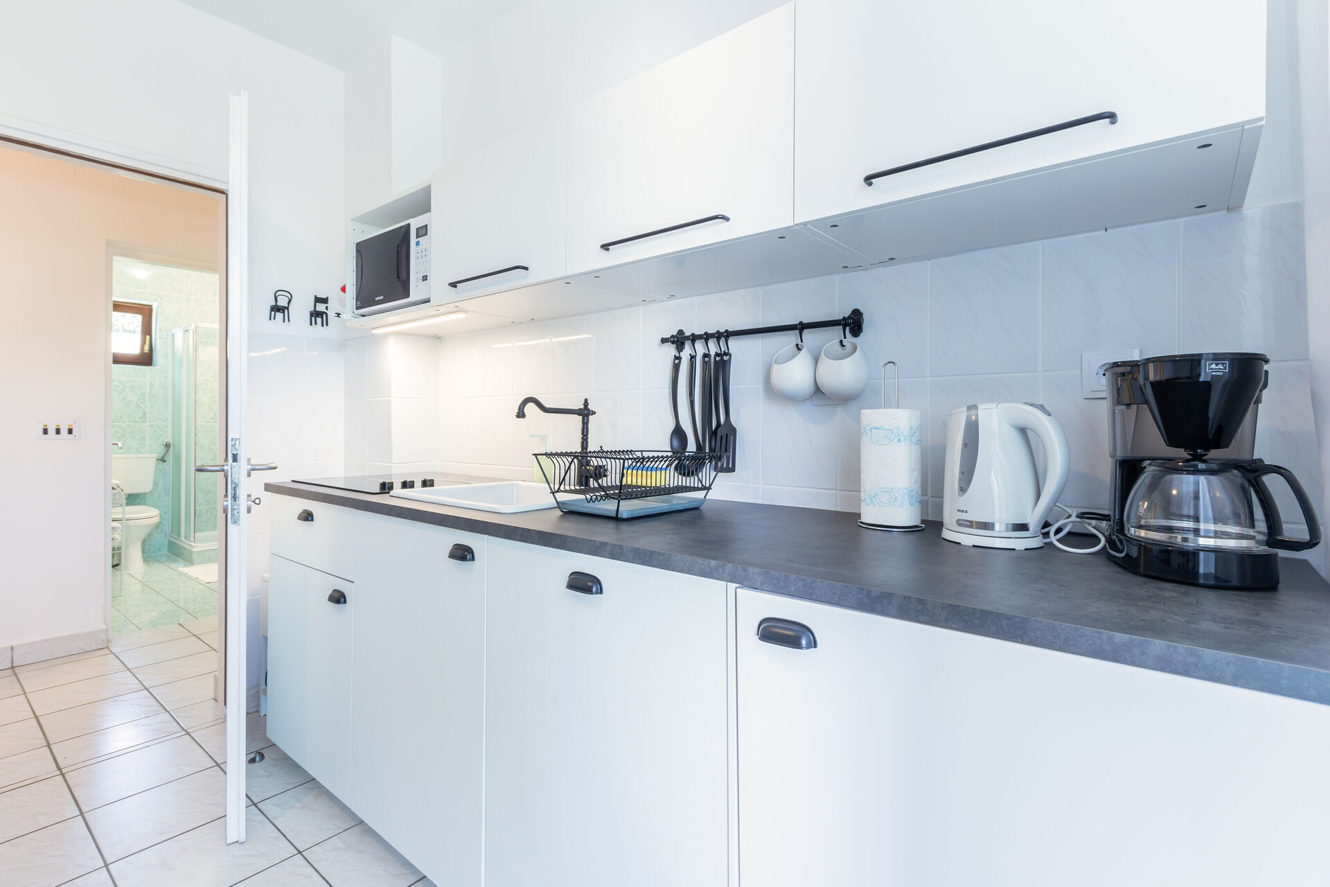 • table and chairs, kitchen sink, refrigerator, electric kettle, filter coffee machine, microwave oven, toaster, dishwasher, stove cooktop.