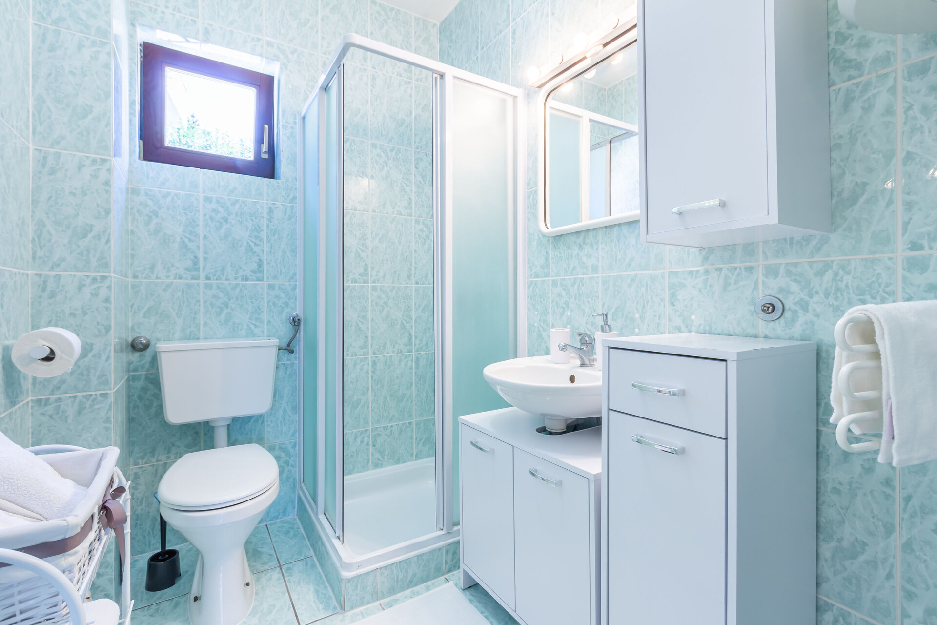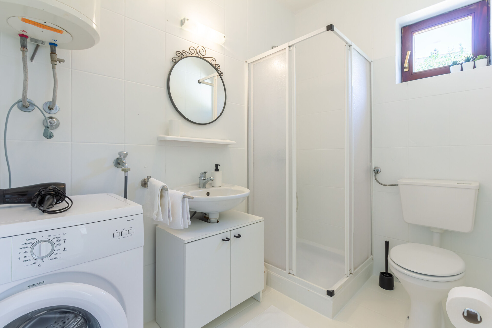 • shower, shower enclosure, washing machine, hairdryer, towels.