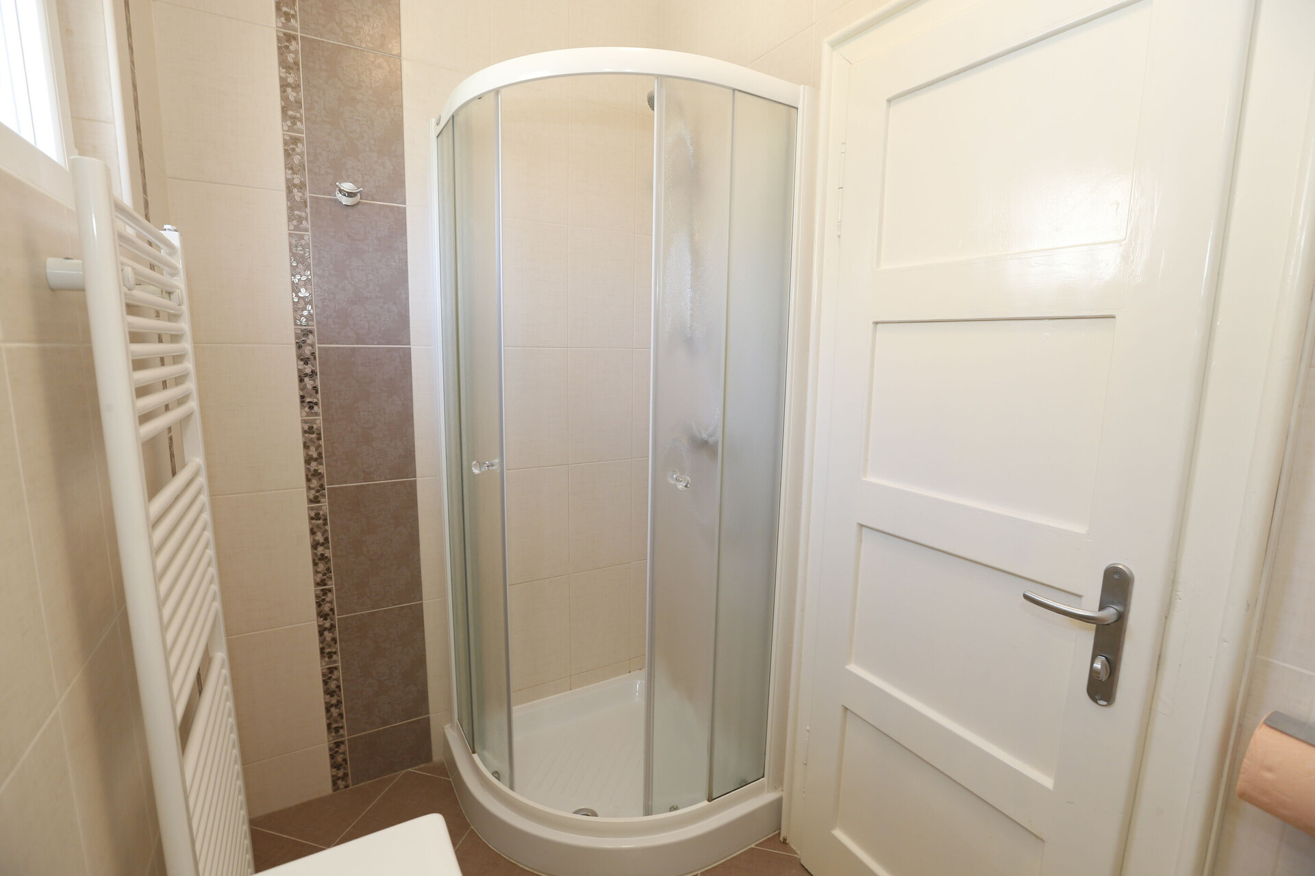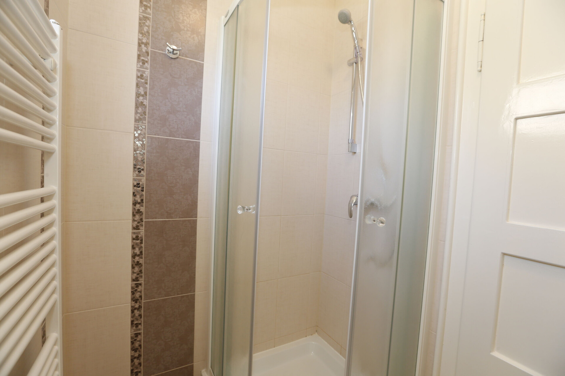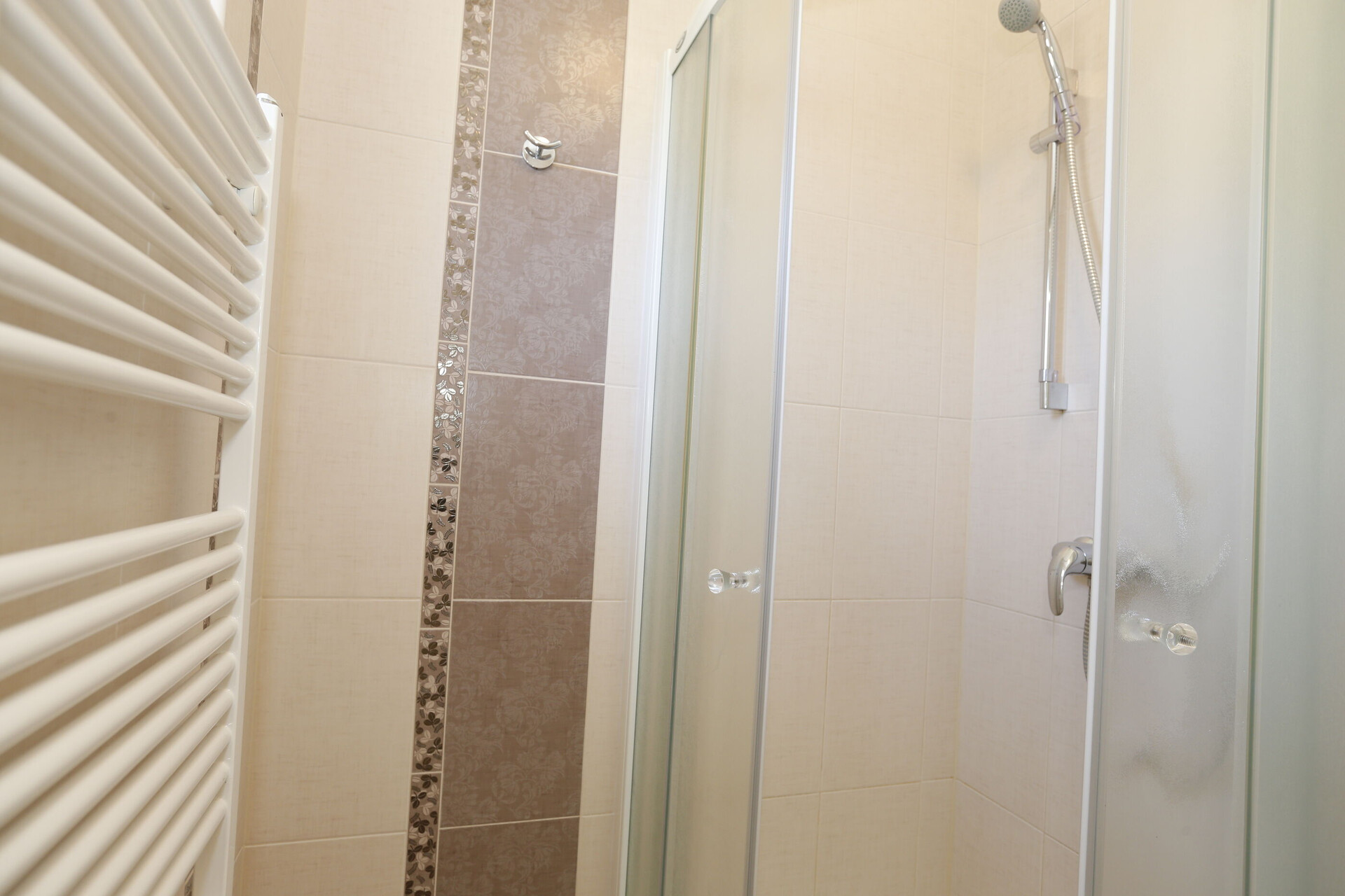 • shower, shower enclosure, towels.