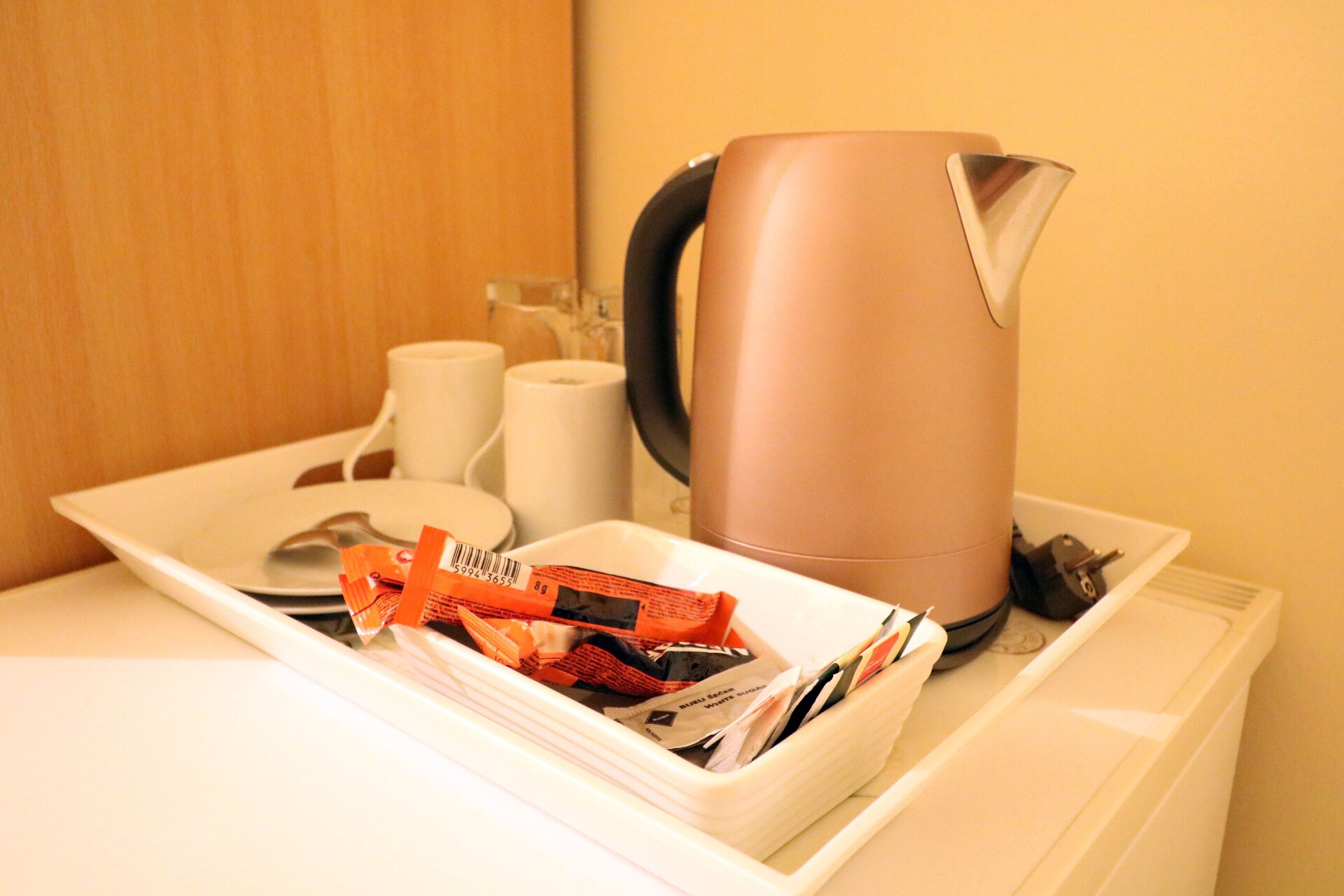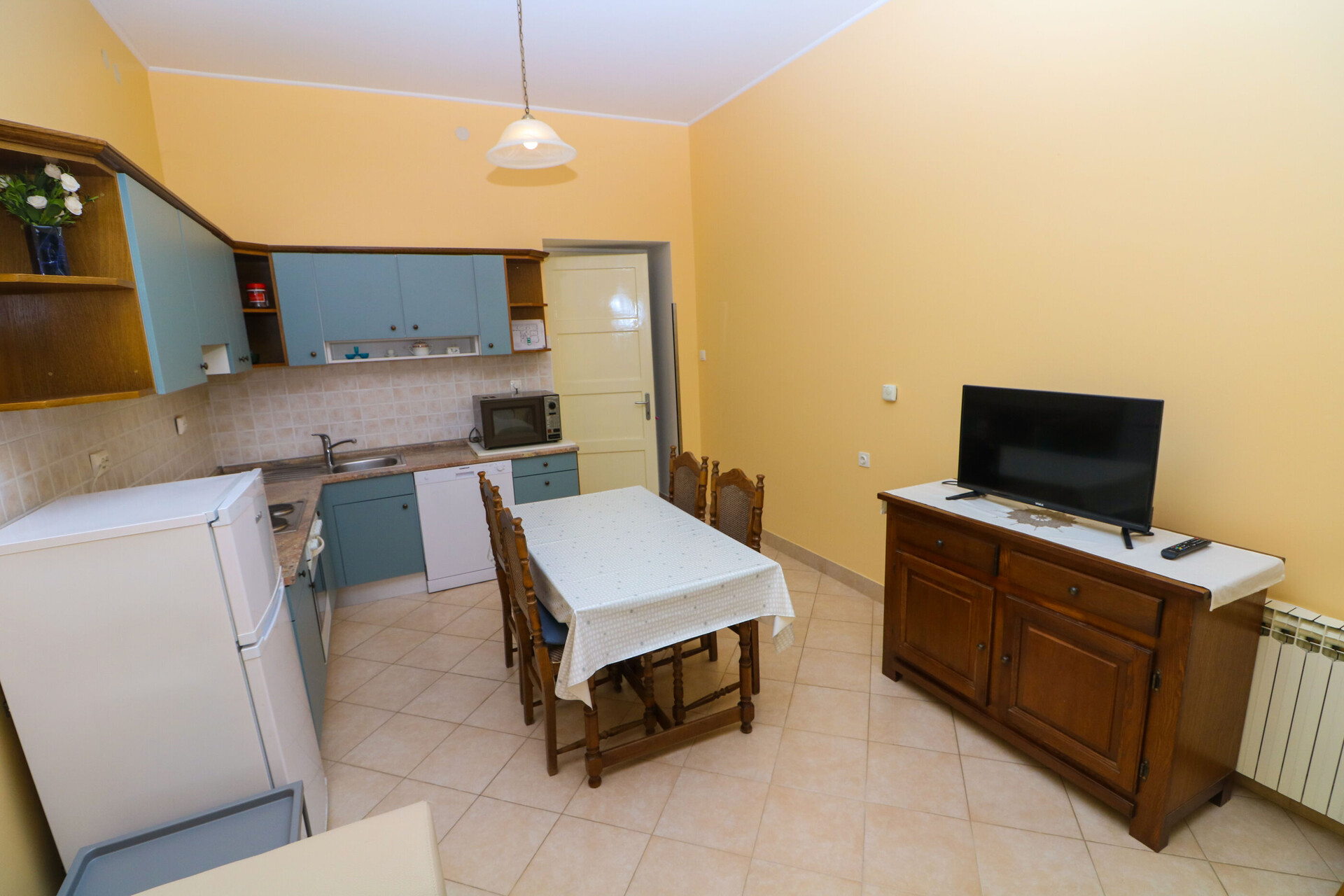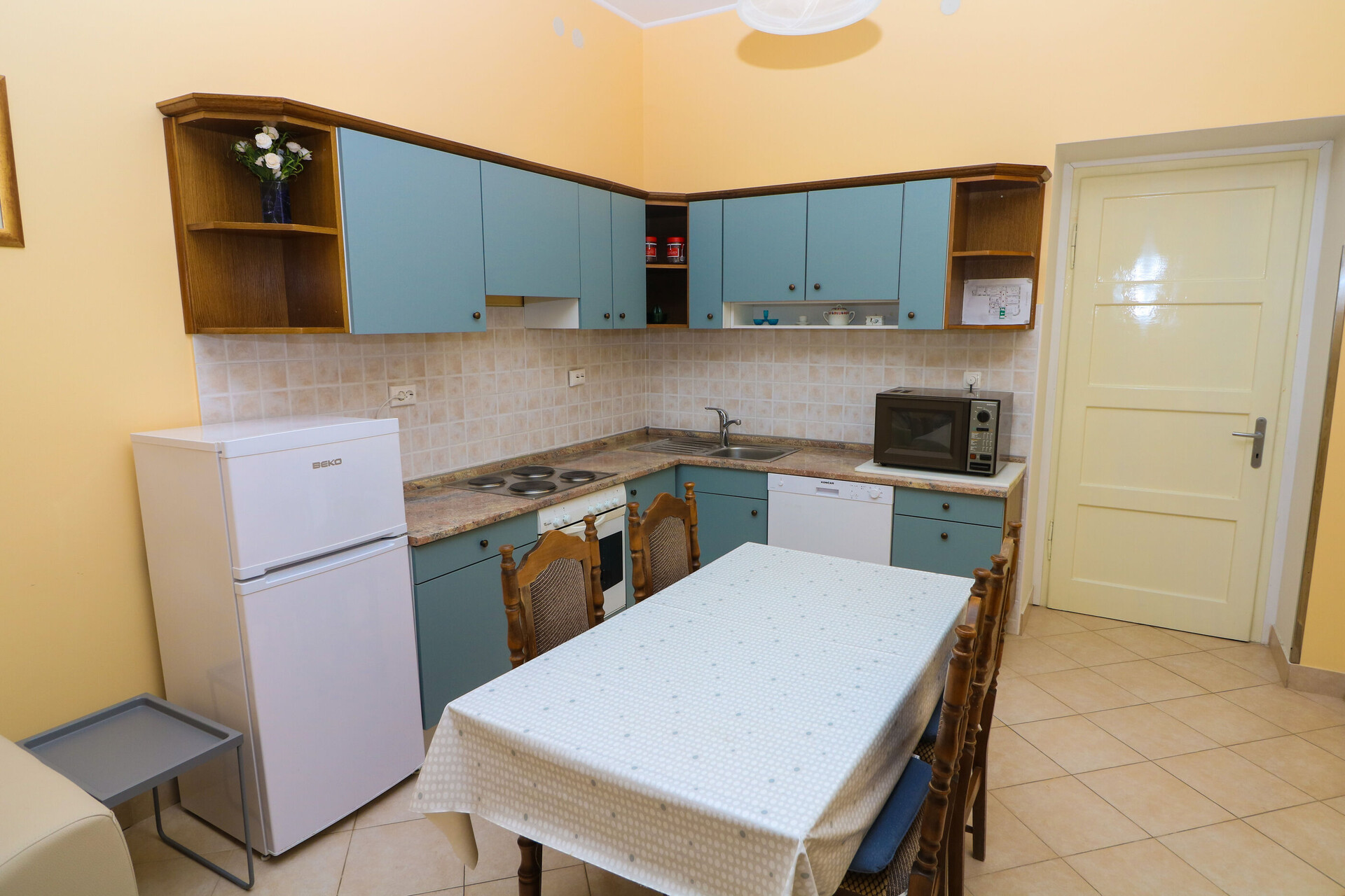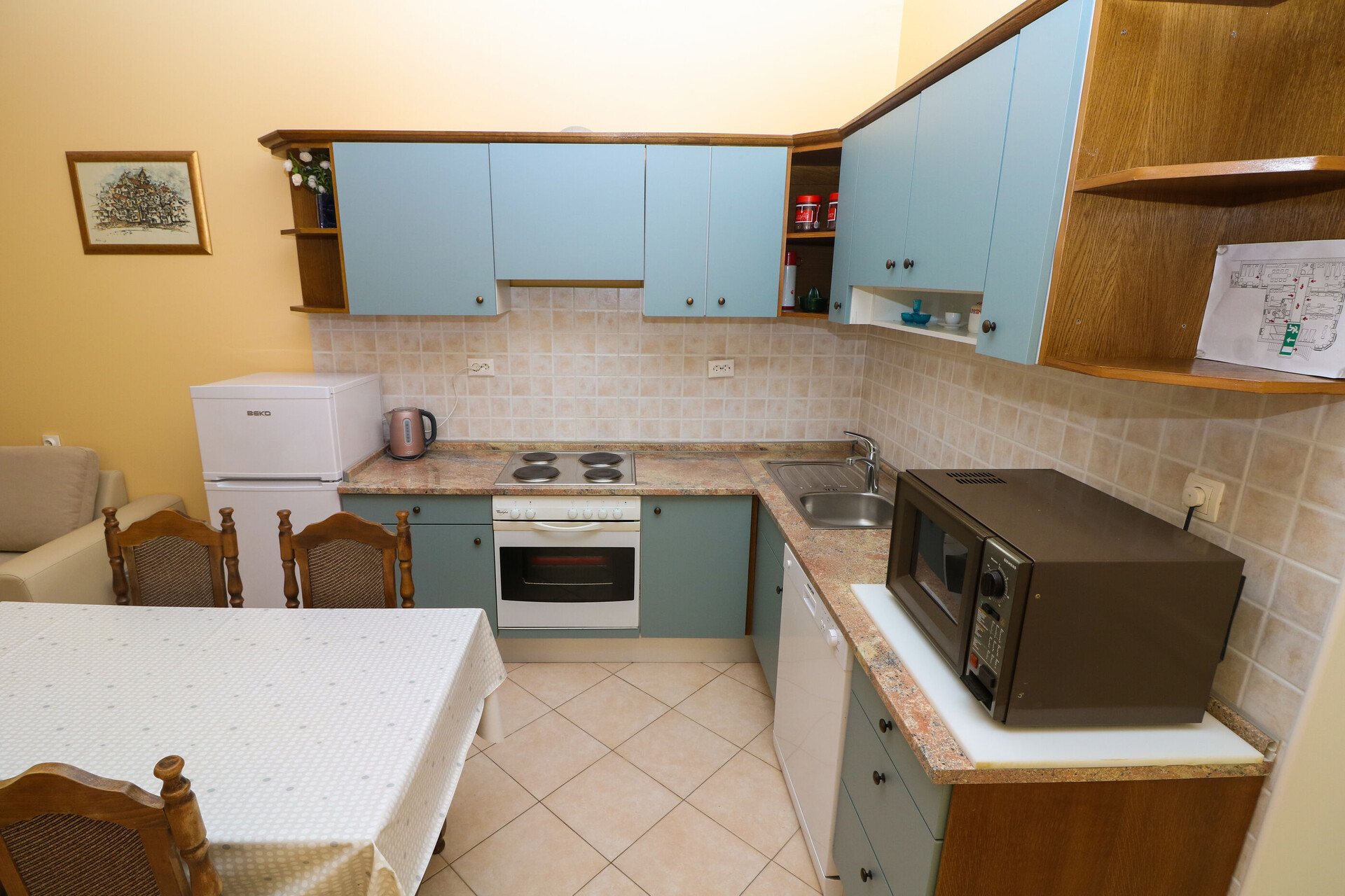 • table and chairs, kitchen sink, oven, refrigerator, electric kettle, filter coffee machine, microwave oven, dishwasher, stove cooktop.