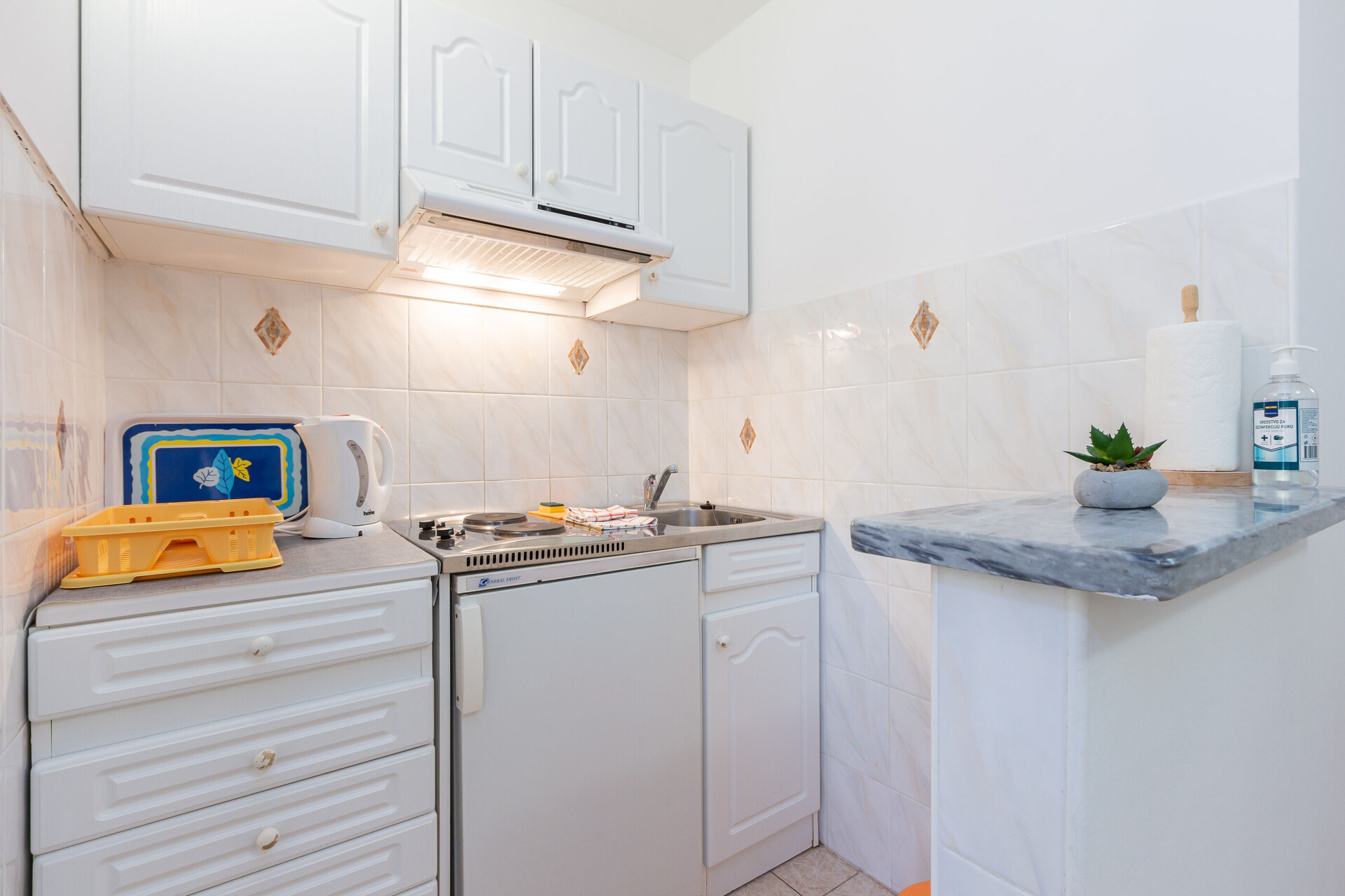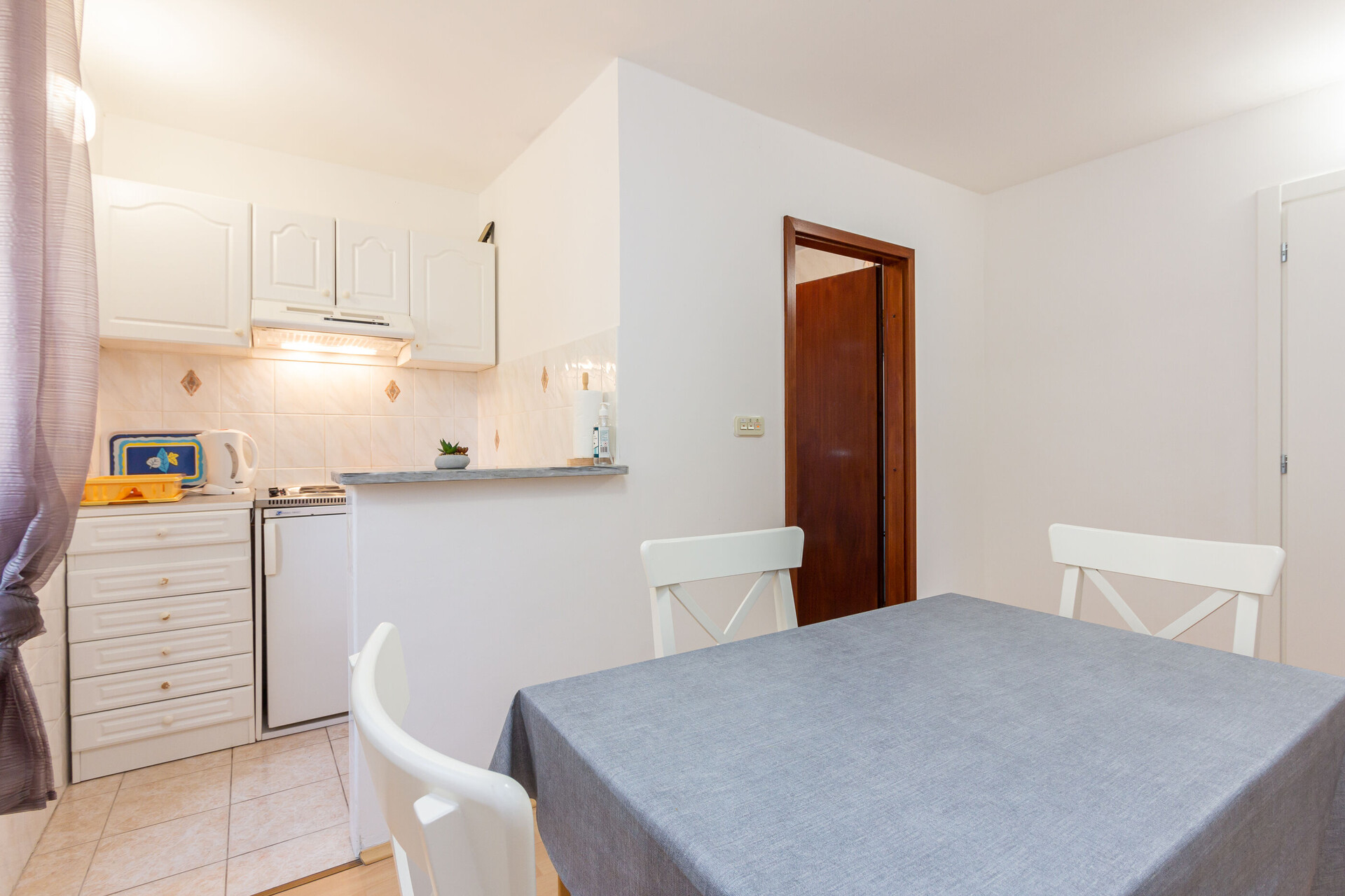 • table and chairs, kitchen sink, refrigerator, electric kettle, filter coffee machine, iron, stove cooktop.