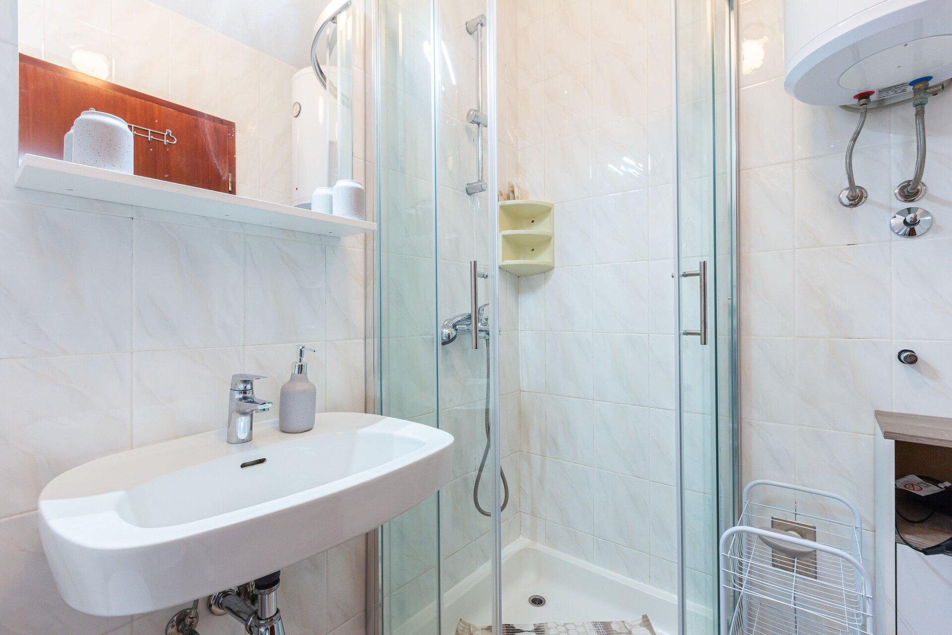 • shower, shower enclosure, towels.