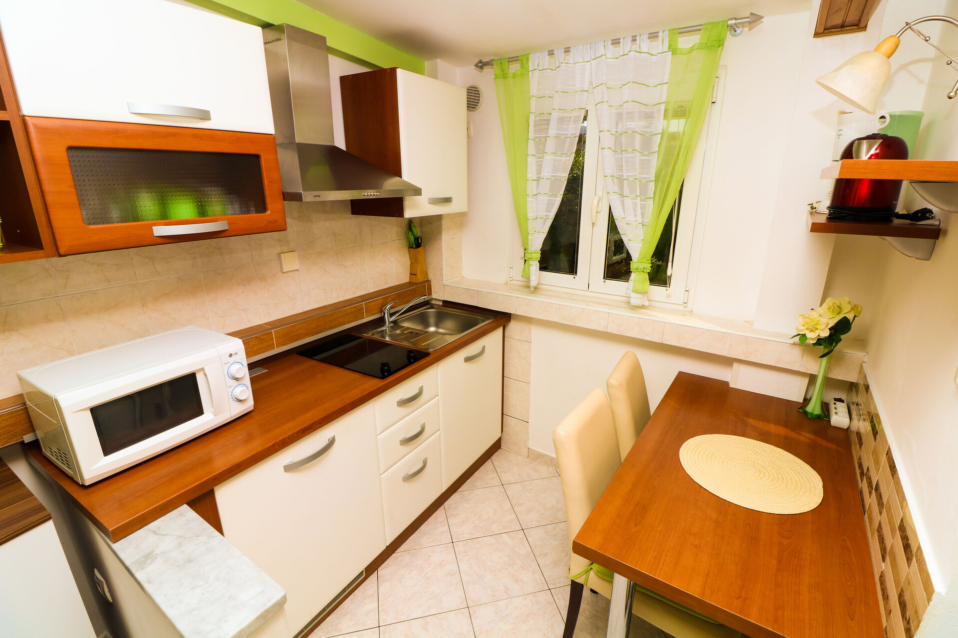 • table and chairs, kitchen sink, oven, refrigerator, electric kettle, filter coffee machine, microwave oven, stove cooktop.