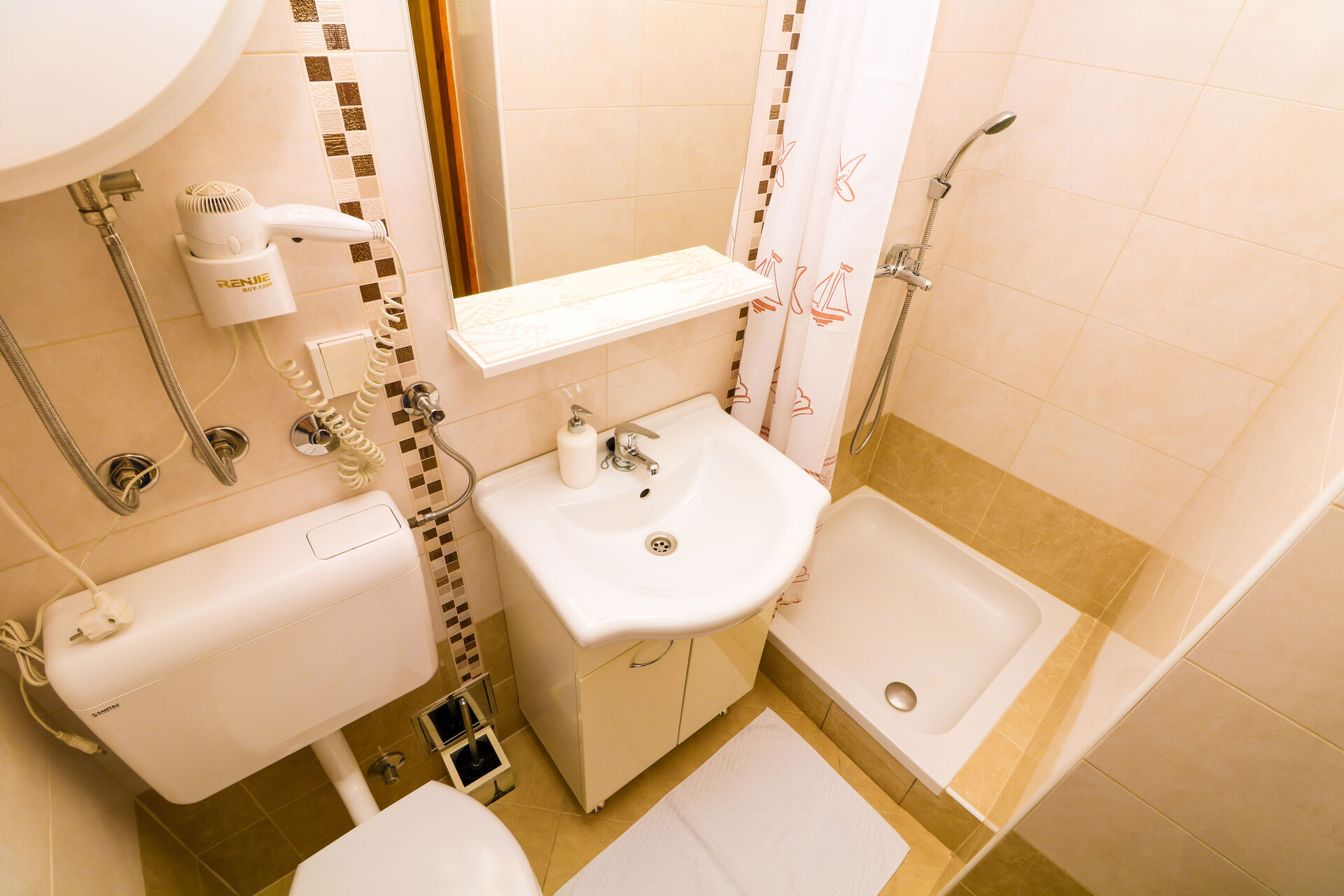 • shower, shower enclosure, hairdryer, towels.