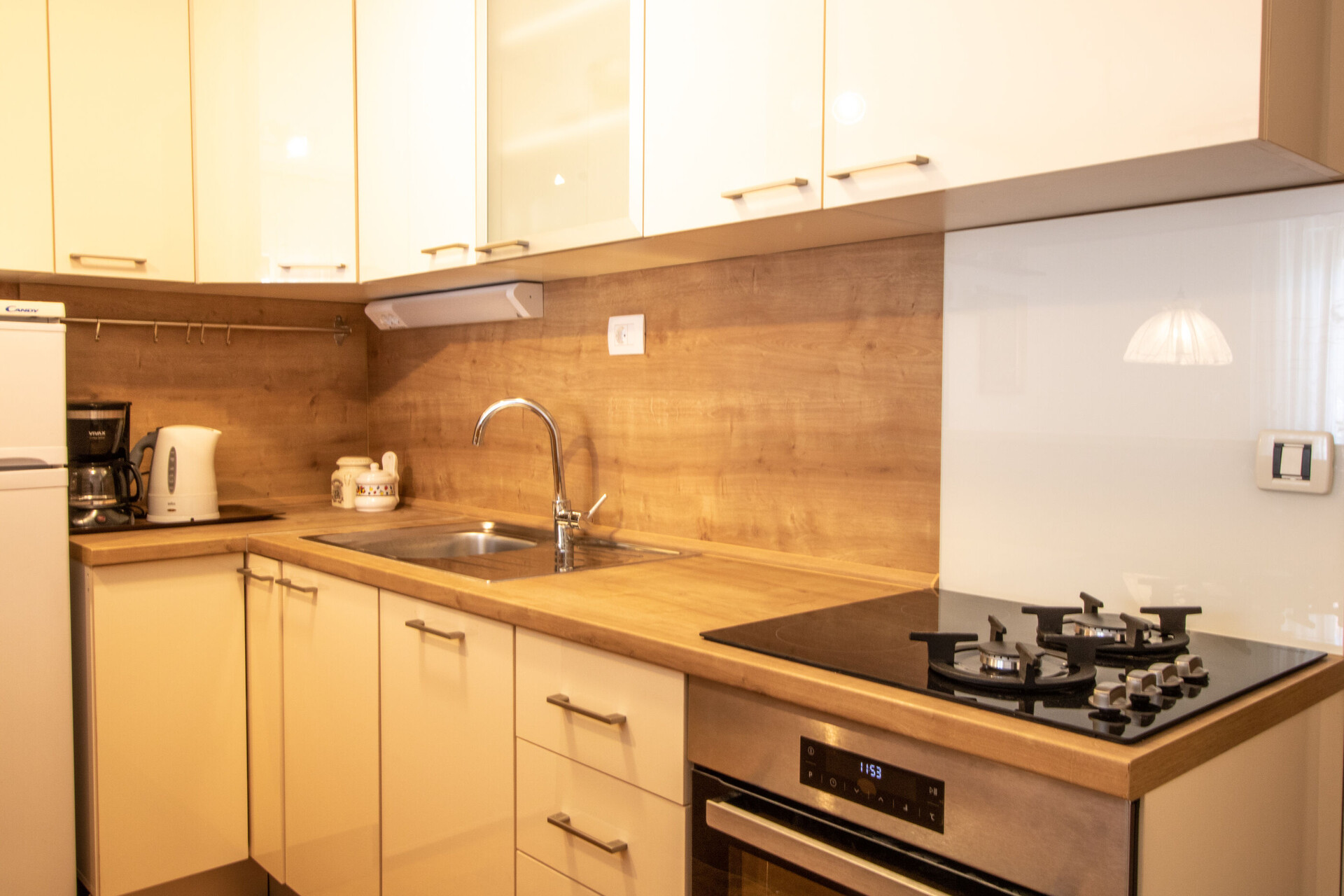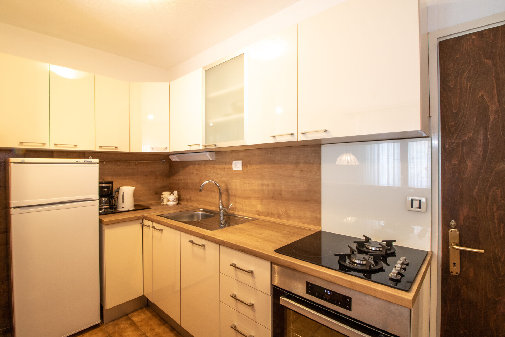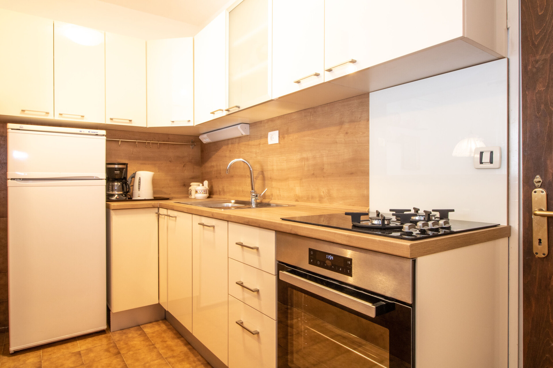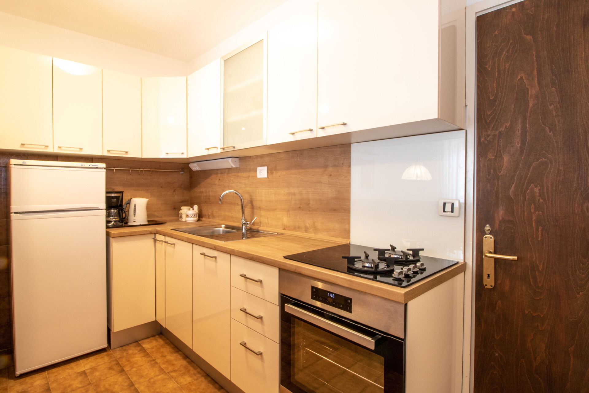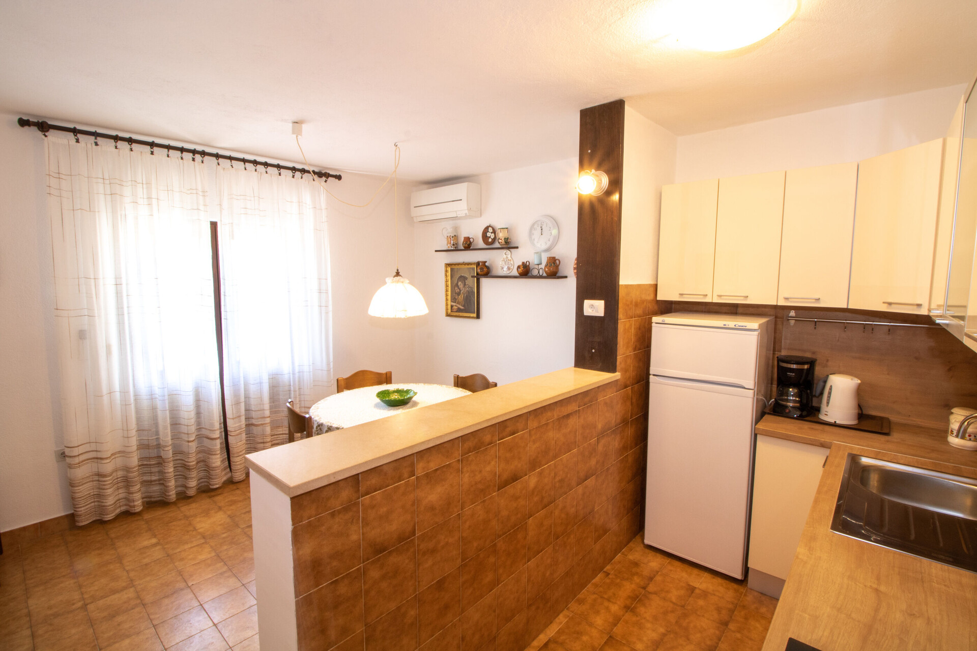 • table and chairs, kitchen sink, oven, refrigerator, upright freezer, electric kettle, filter coffee machine, stove cooktop.