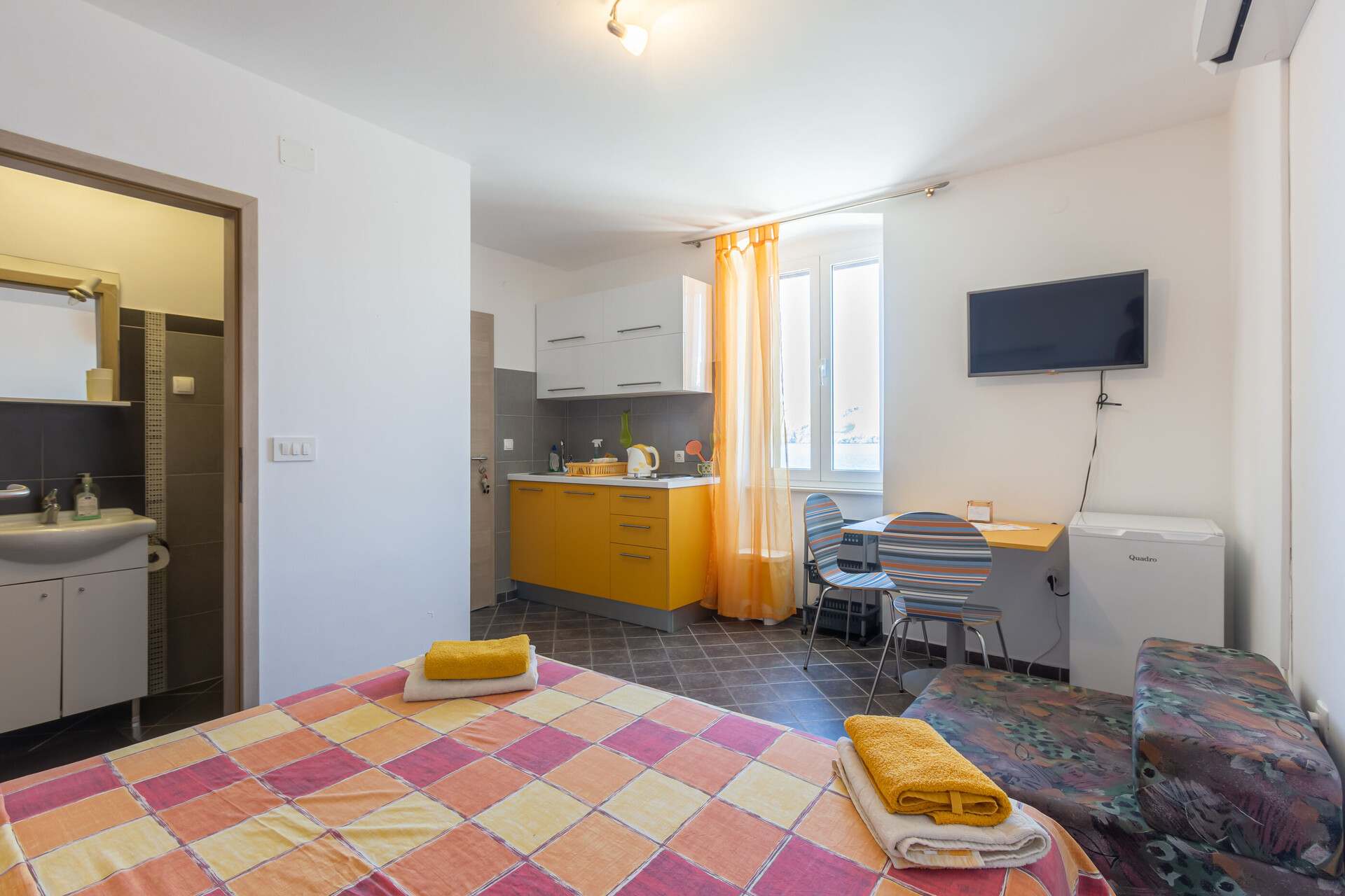 • wifi included in the price, sea view, Total surface area of the interior is: 20 m2, Unit is on: at the first floor, Bedrooms: 0, bathrooms: 1, balconies: 0, TV set, satellite tv, air conditioning included in the price.