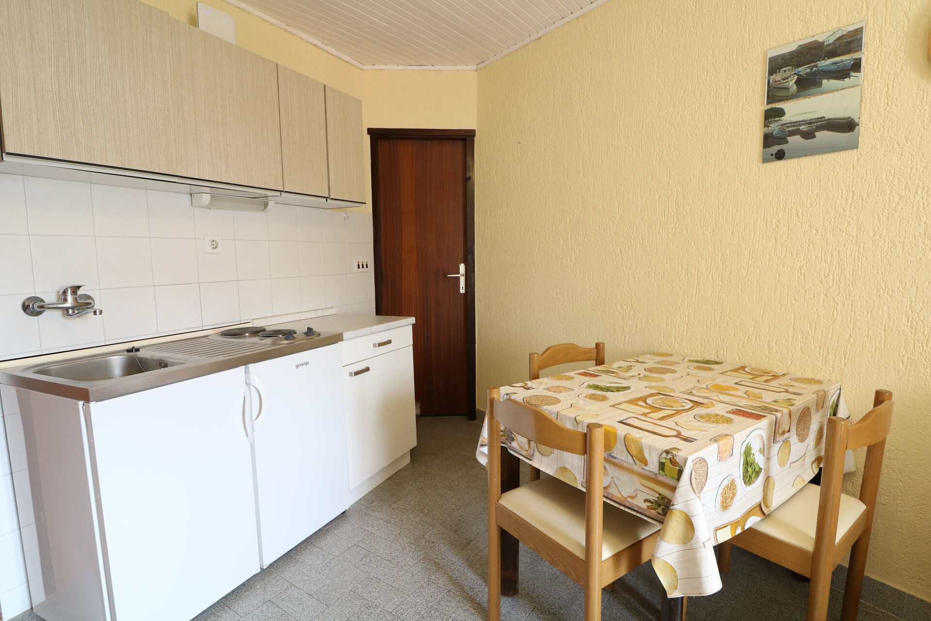 • table and chairs, kitchen sink, refrigerator, upright freezer, electric kettle, filter coffee machine, microwave oven, stove cooktop.