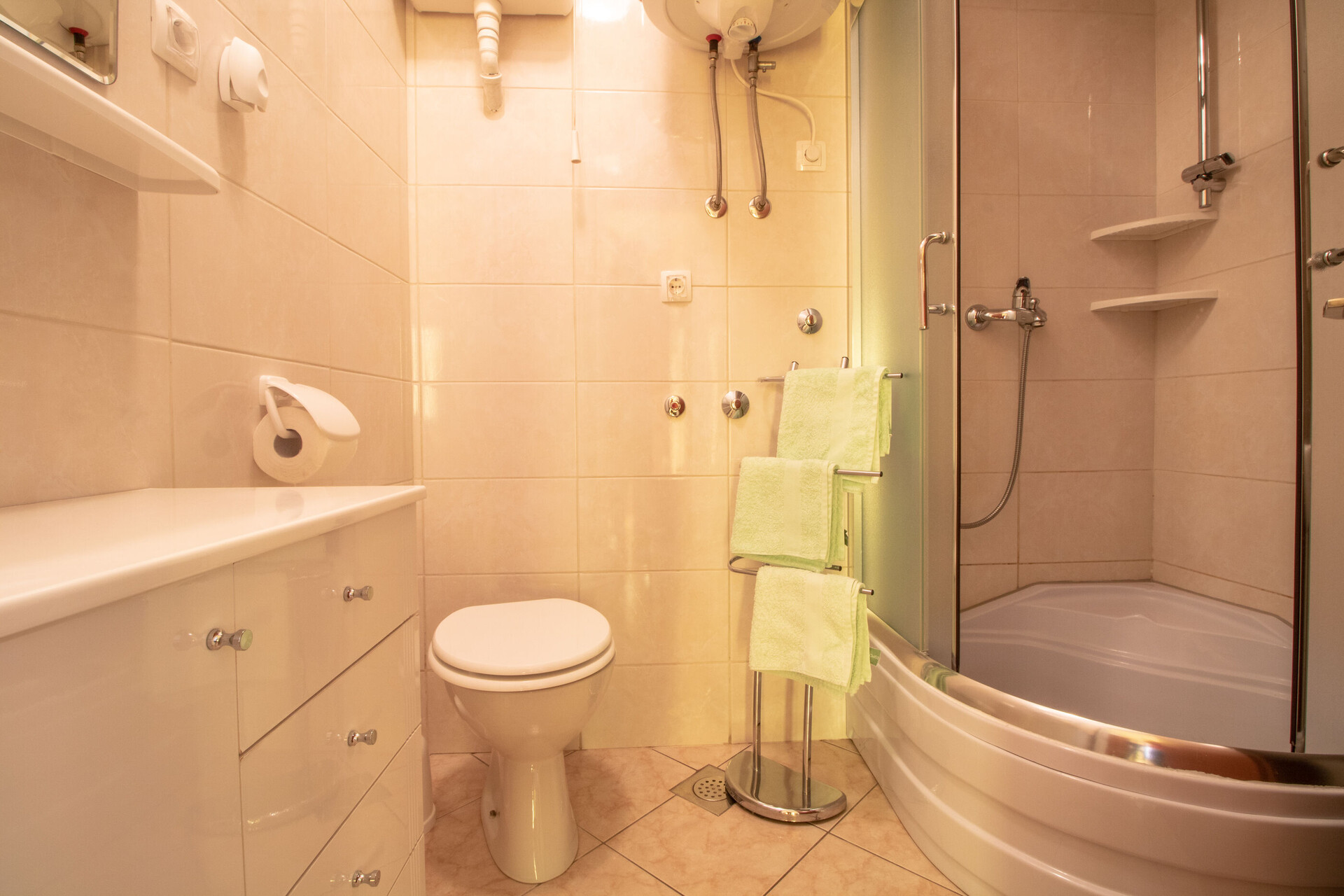 • shower, shower enclosure, towels.