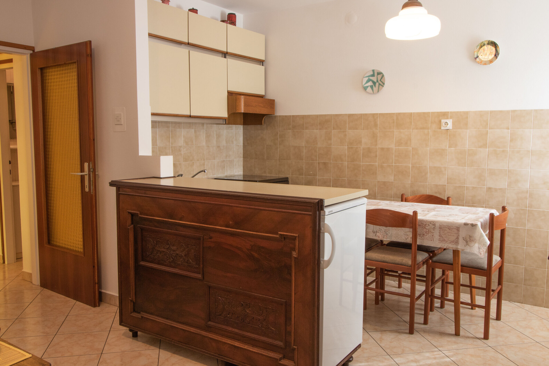 • table and chairs, kitchen sink, oven, refrigerator, upright freezer, electric kettle, filter coffee machine, stove cooktop.