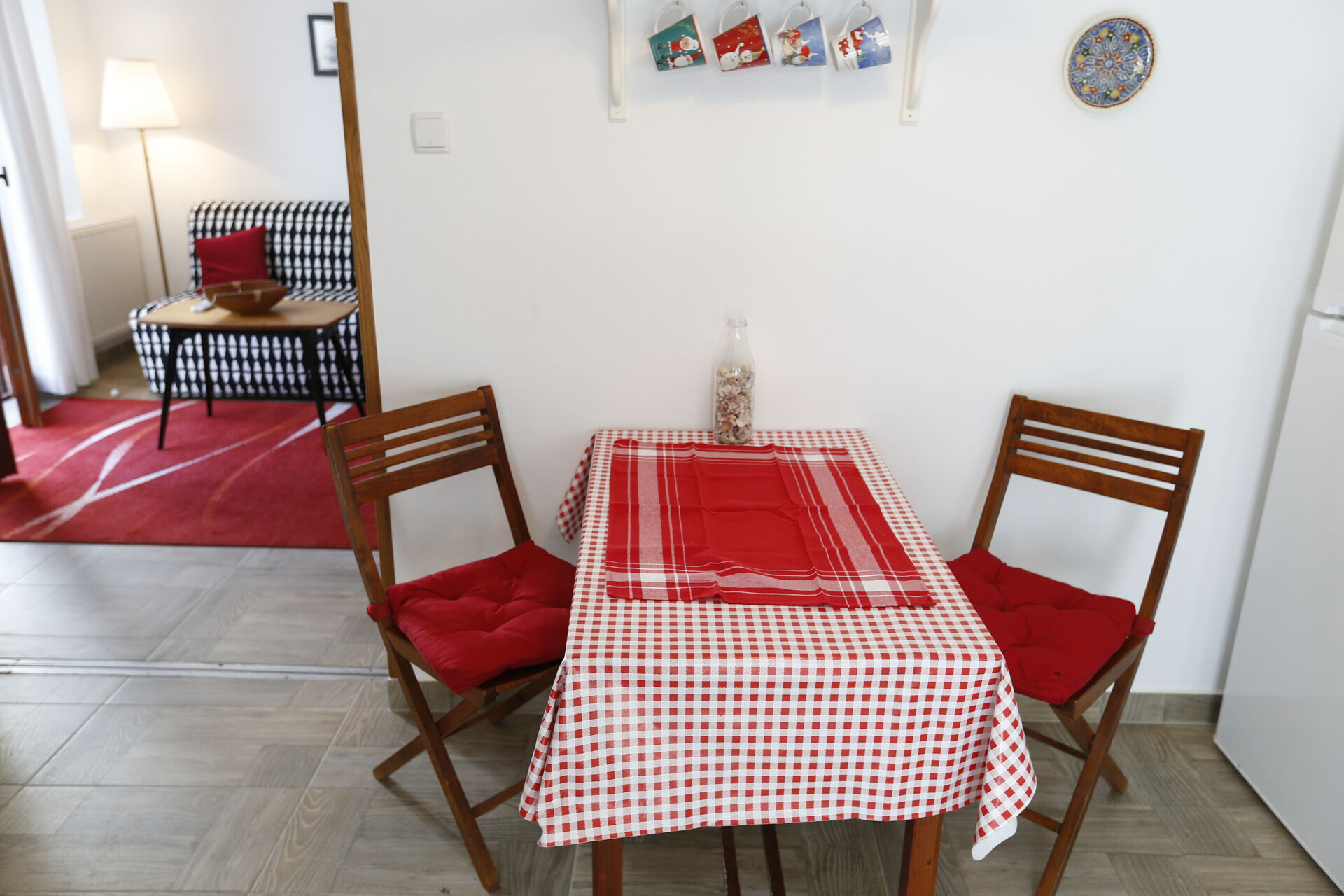 • table and chairs, kitchen sink, oven, refrigerator, upright freezer, electric kettle, filter coffee machine, microwave oven, toaster, stove cooktop.