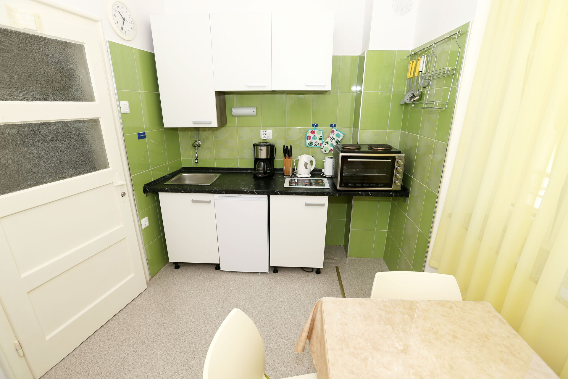 • table and chairs, kitchen sink, refrigerator, electric kettle, filter coffee machine, microwave oven, toaster, stove cooktop.