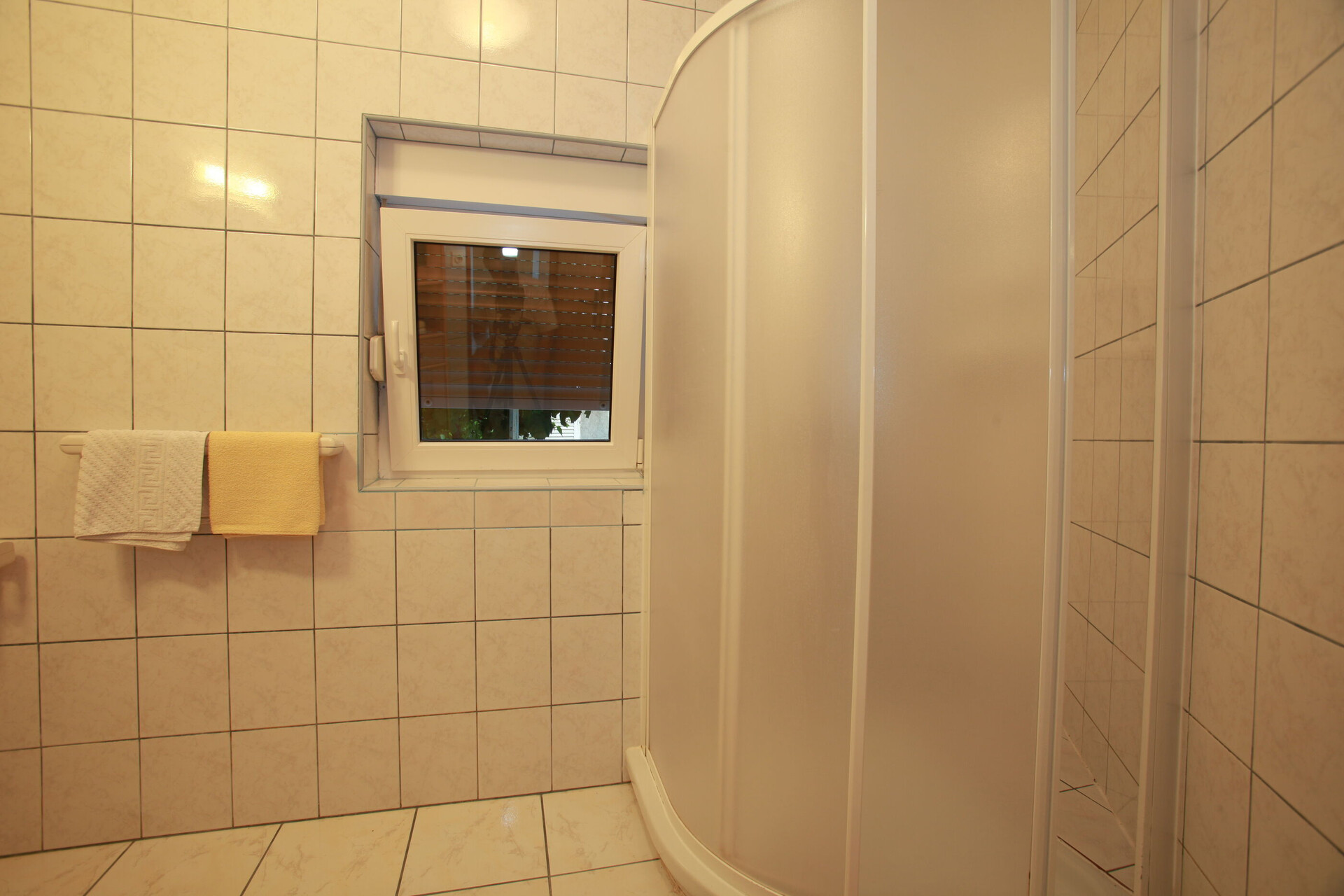 • shower, shower enclosure, towels.