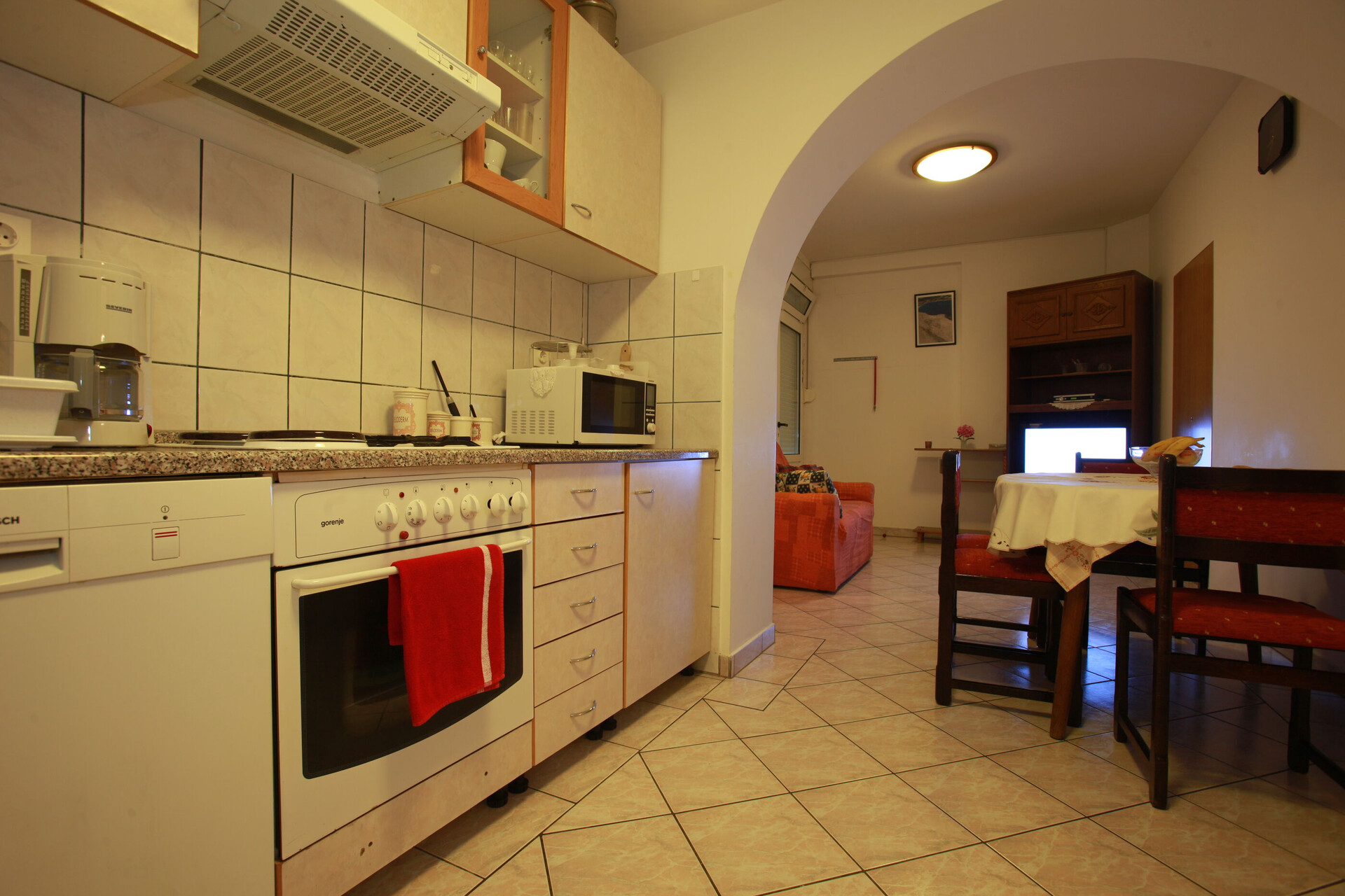 • table and chairs, kitchen sink, oven, refrigerator, upright freezer, electric kettle, filter coffee machine, microwave oven, toaster, dishwasher, stove cooktop.