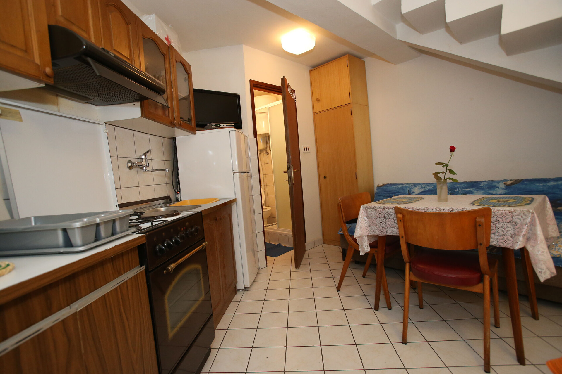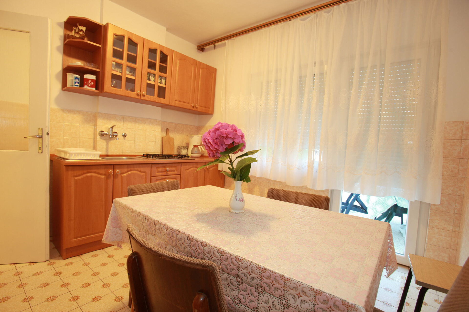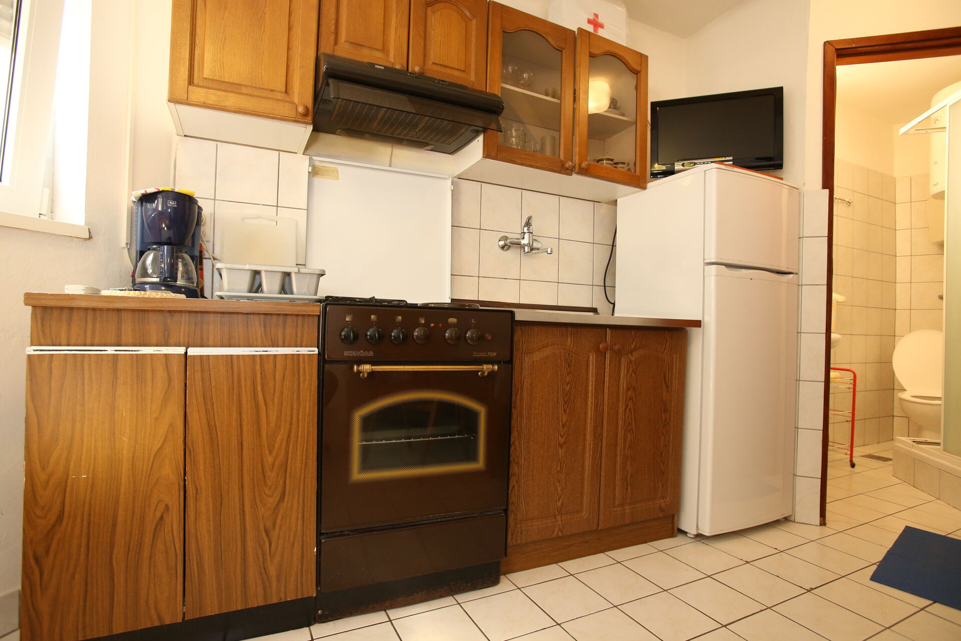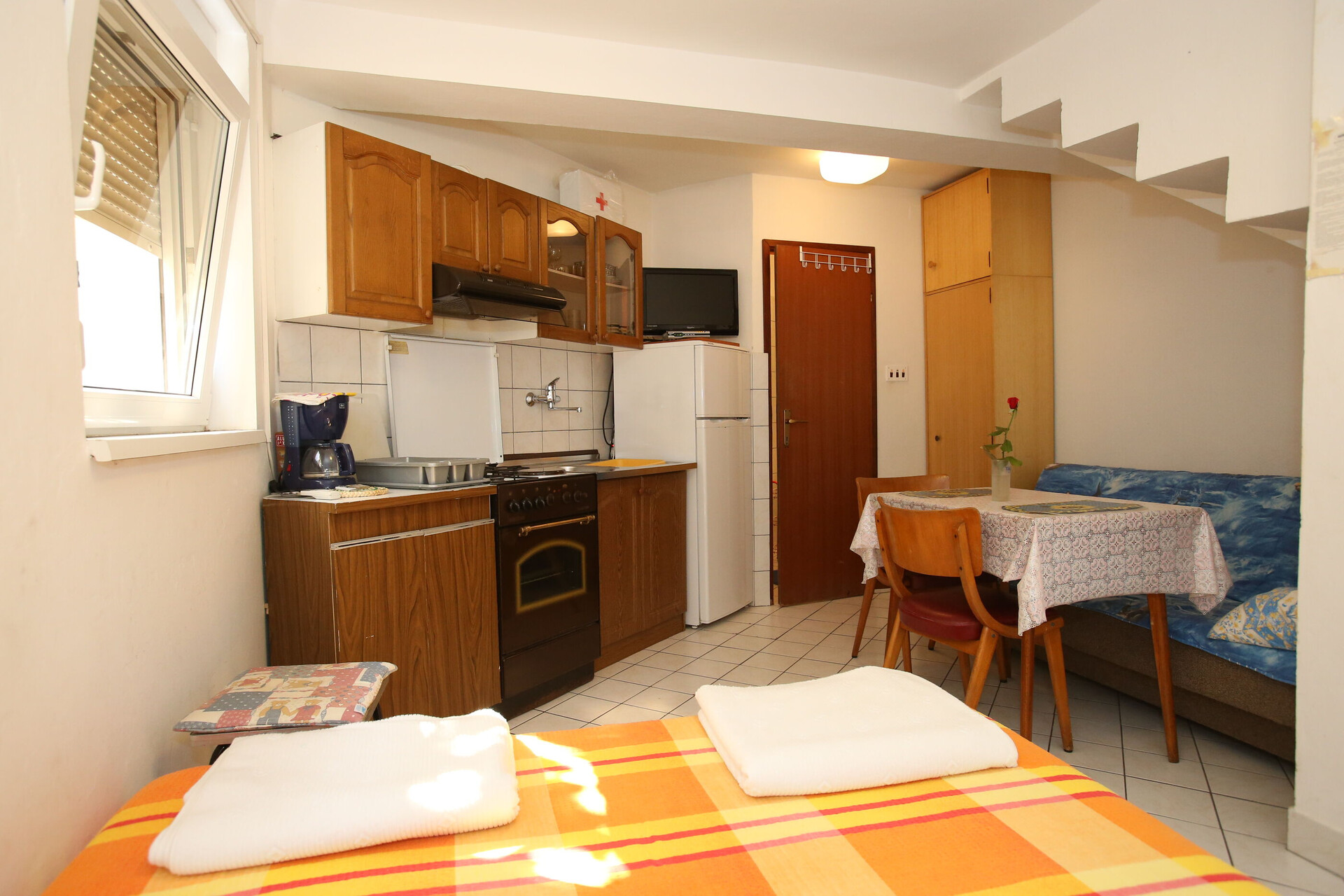 • table and chairs, kitchen sink, oven, refrigerator, upright freezer, electric kettle, filter coffee machine, toaster, stove cooktop.